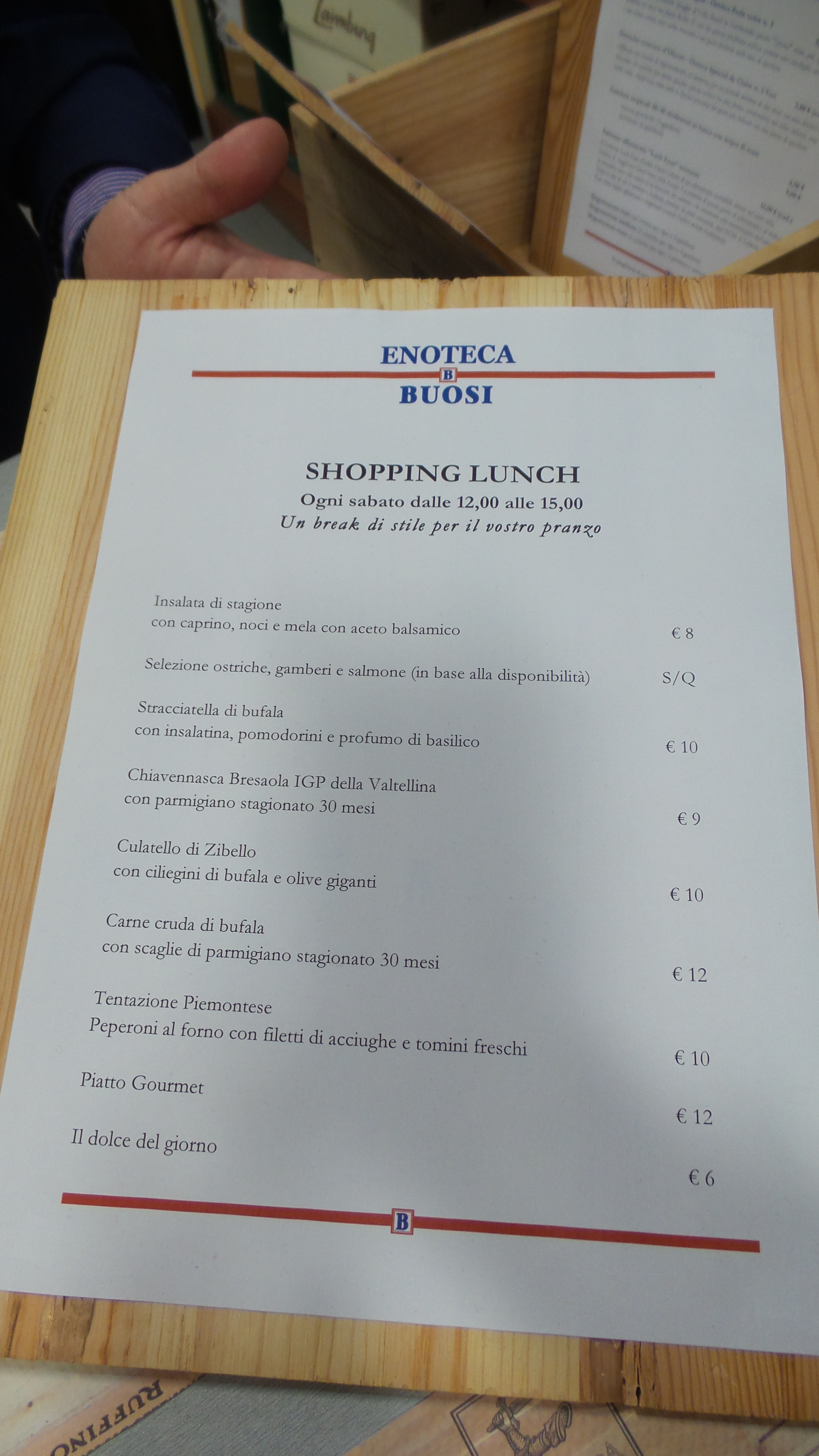 Questo venerdì 19 febbraio, sempre dalle 18 alle 21, Buosi ci porta in Franciacorta con una serata dedicata al MOSNEL e degustazione delle tre tipologie Brut, Rosé, Satin (venerdì 26 febbraio è invece dedicato a Bellavista. I posti sono piuttosto limitati, quindi è gradita la prenotazione:011 722479 / enoteca@buosi.com). E il sabato? Buosi ha pensato anche a questo, con uno SHOPPING LUNCH che ci regala una pausa veloce, ma al contempo rinfrancante e delicata: dai peperoni al forno con filetti di acciughe e tomini freschi alla carne cruda di bufala con parmigiano stagionato 30 mesi. Il tutto piacevolmente accompagnato dalla selezione dei vini dell’enoteca: una ventina di etichette piemontesi, altrettante provenienti da tutta Italia, e bollicine francesi come Canard Duchêne, Bollinger o Ruinart.