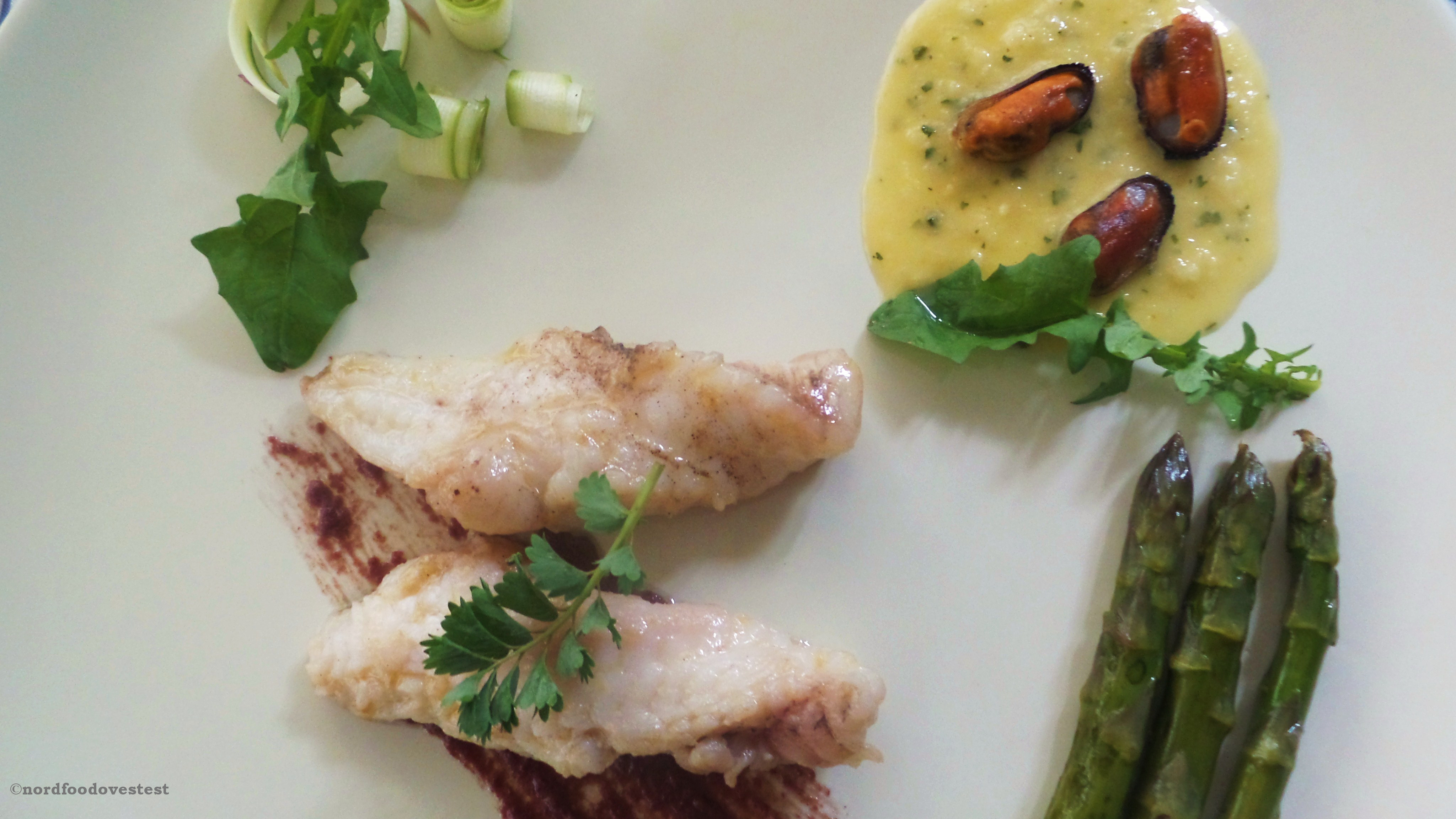 Arriviamo così al momento finale di questa ricetta: scelgo un piatto molto grande color crema; con un pennello da cucina creo una velatura rossastra con l’aceto di sambuco. Sopra ci adagio la coda di rana. Con un piccolo mescolo verso l’equivalente di un cucchiaio di condimento allo zenzero, sopra il quale sistemo le cozze. Dispongo gli asparagi a fianco del pesce. Prendo un pelapatate, creo delle striscioline molto sottili con l’asparago non cotto e decoro il piatto. Ultimo con qualche foglia di pimpinella e tarassaco del mio giardino