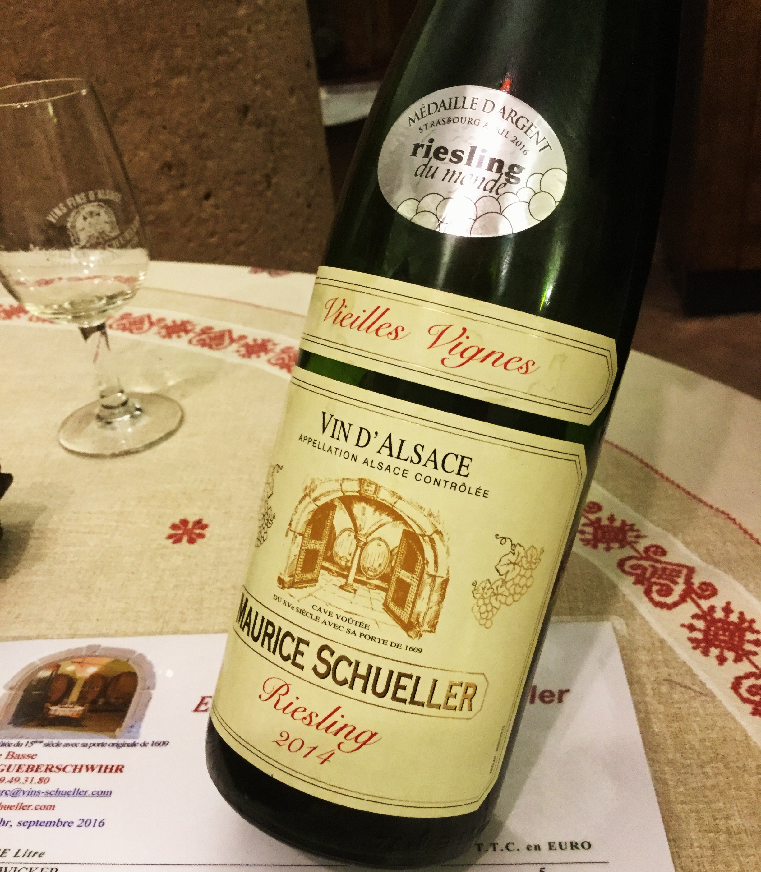 Iniziamo la degustazione con un Crémant d’Alsace Brut (medaglia d’argento al Concorso di Colmar 2016) a base di Pinot Bianco, Pinot Bianco Auxerrois e Chardonnay (che in Alsazia è accettato solamente per la produzione di Crémant): bollicina fine e veloce, sale su veloce nella stessa maniera in cui la nebbia della notte si dirada al mattino. Elegante, profumato, vivace: un ottimo inizio. Proseguiamo con un Riesling 2014 Vieilles Vignes (medaglia d’argento al Concorso di Strasburgo 2016), e sarà per la mia predilezione per le Vieilles vignes, ma questo è davvero “tout droit” come dice Catherine: dotato di un ottimo rapporto tra acidità e mineralità, è rotondo e fine, perfetto con del pesce o una bella cuisse de canard. Vino e cucina del territorio trovano qui un connubio perfetto…