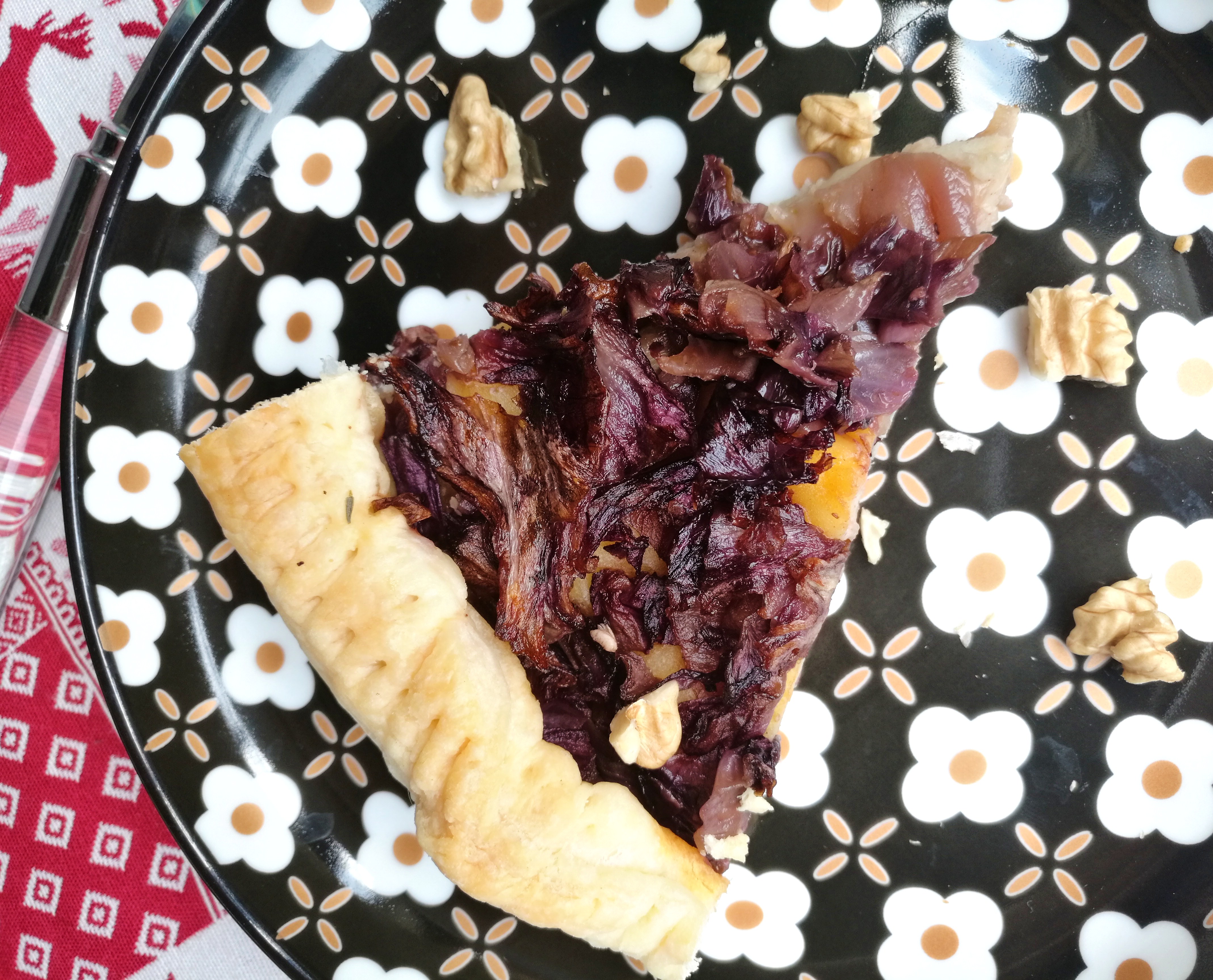 1 rotolo di pasta sfoglia; 1 rotolo di pasta brisé; 1 radicchio piccolo; 1 indivia; 1 pera; 150 g di Chicca© Classica Verys; 4 noci sgusciate; 1 cucchiaino di paprica; olio evo; erbe aromatiche; 1 cucchiaino di crema di aceto balsamico; 1 pizzico di zenzero e cannella in polvere; sale e pepe q.b.