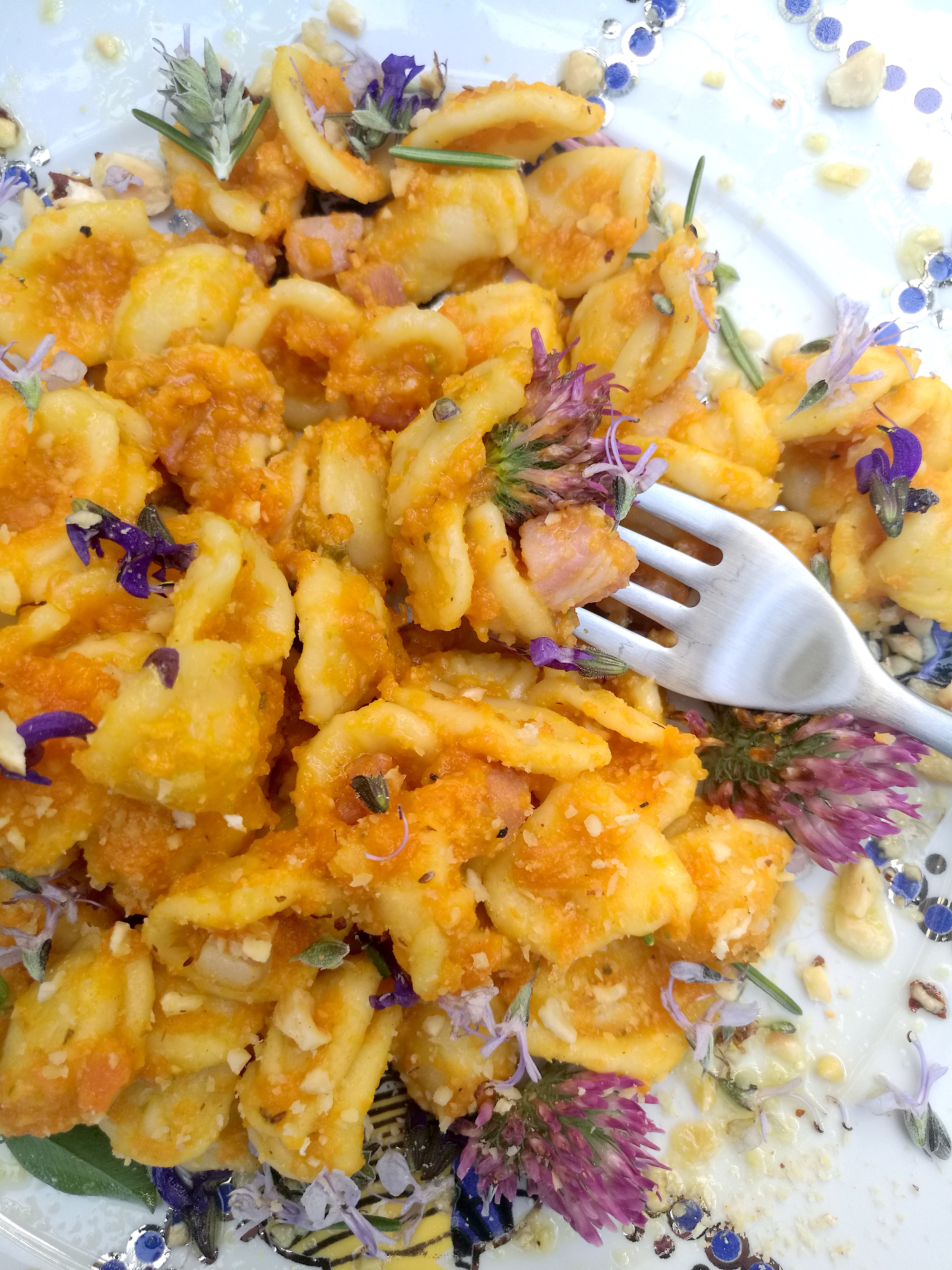 ORECCHIETTE FRESCHE BIO MAFFEI CON CREMA DI CAROTE E NOCCIOLE, PANCETTA AFFUMICATA E AROMATICHE