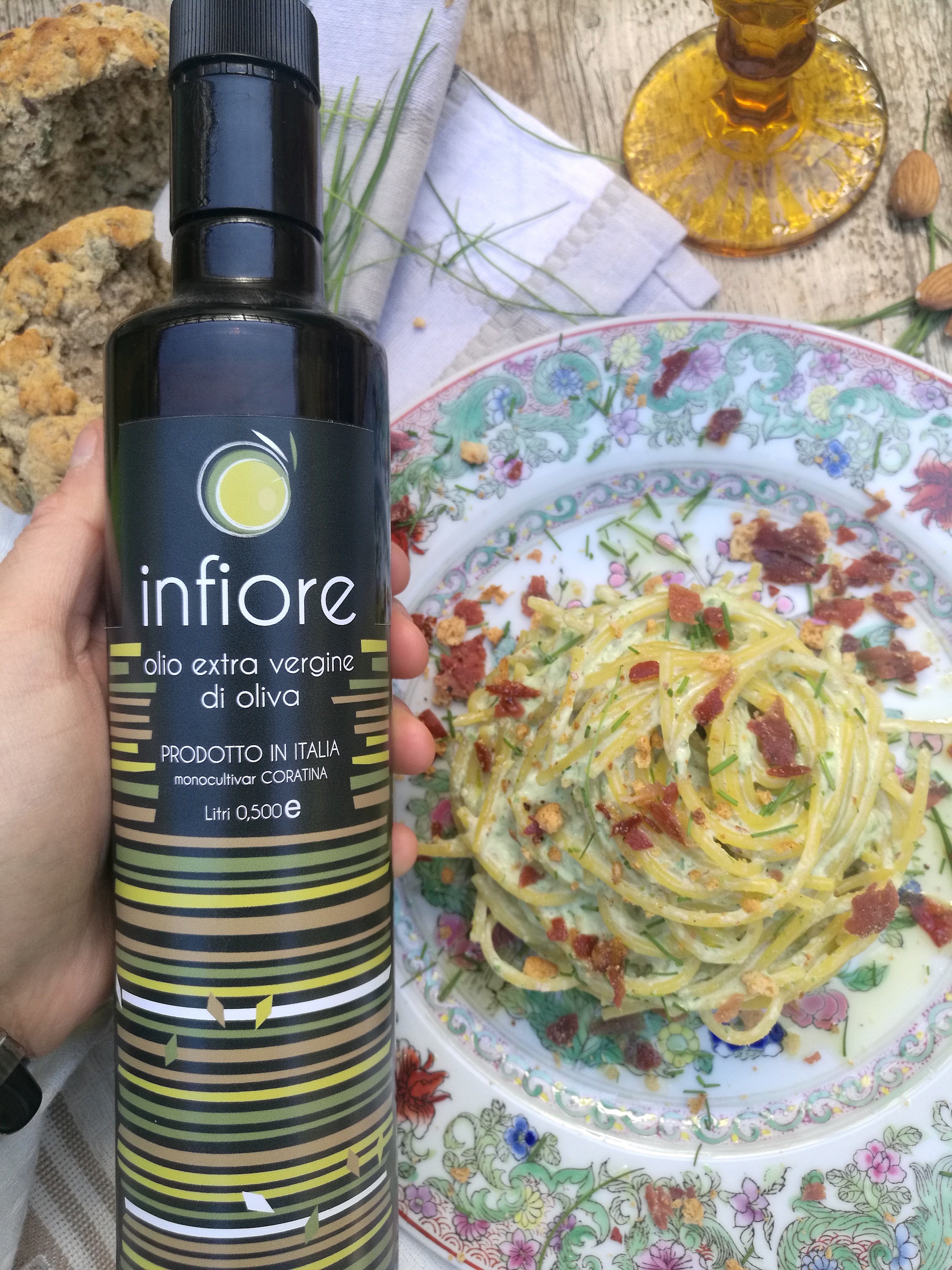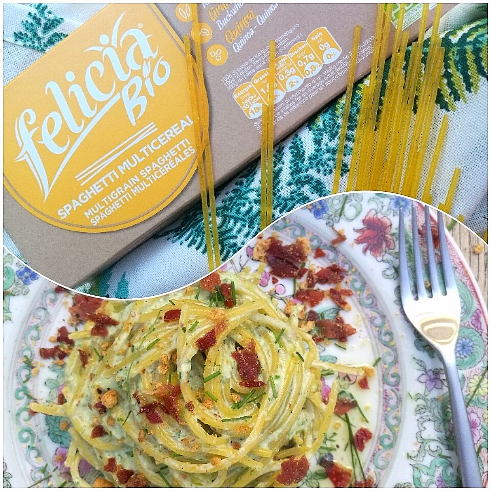 SPAGHETTI MULTICEREALI CON PESTO DI RICOTTA ED ERBA CIPOLLINA, BRICIOLE DI PROSCIUTTO CRUDO E AMARETTI