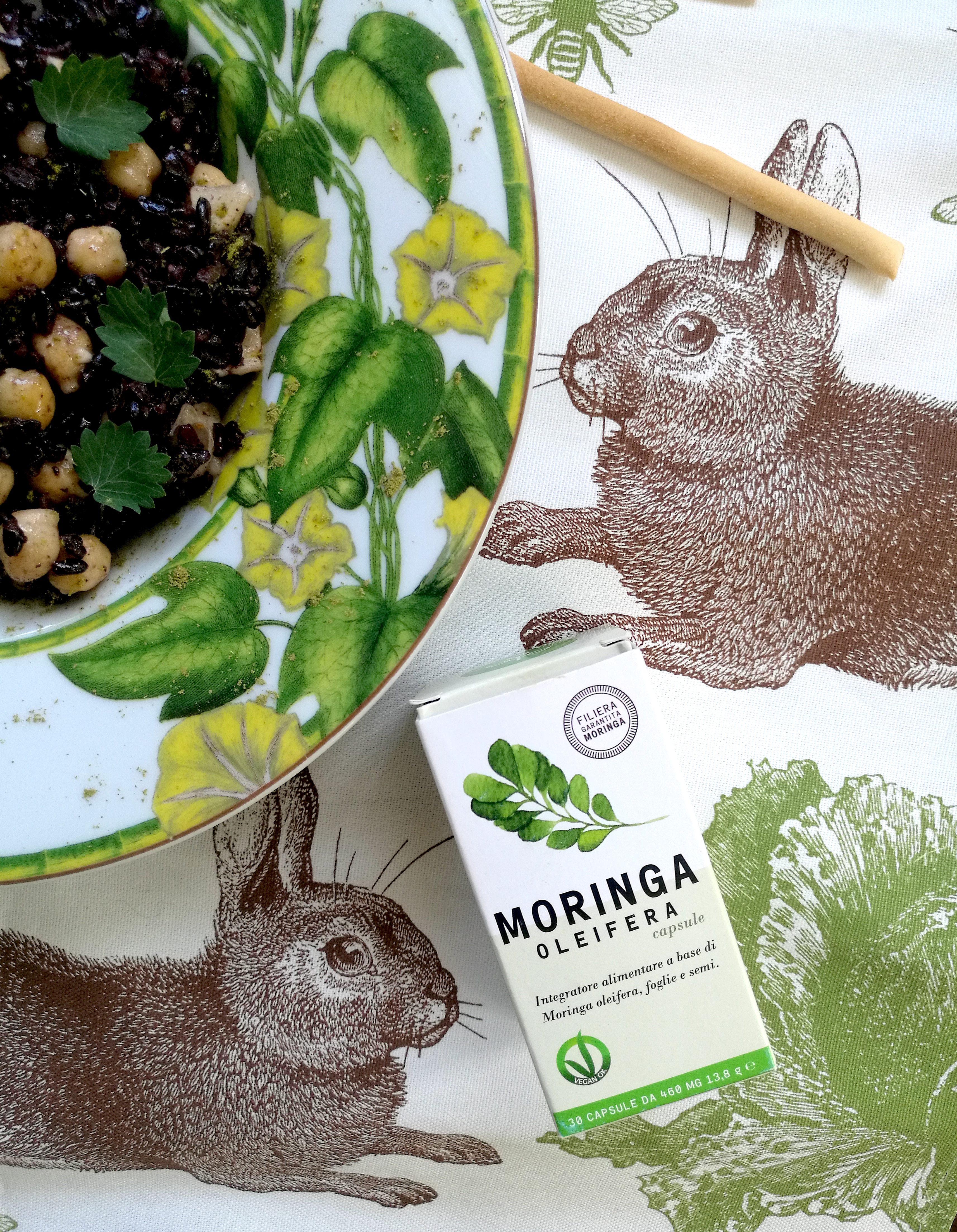 Ho scelto lo squisito Riso Nero integrale aromatico Il Moro Riso Acqua e Sole, condito con pezzetti di capra piccante, ceci e polvere di moringa ViviMoringa (mi raccomando, come vi ho già spiegato nell’articolo dedicato, se decidete di adoperare la moringa in cucina, sempre a crudo e quindi anche non su cibi caldi!). Per finire, qualche foglia di nepetella, che ricorda la menta ma leggermente più intensa.