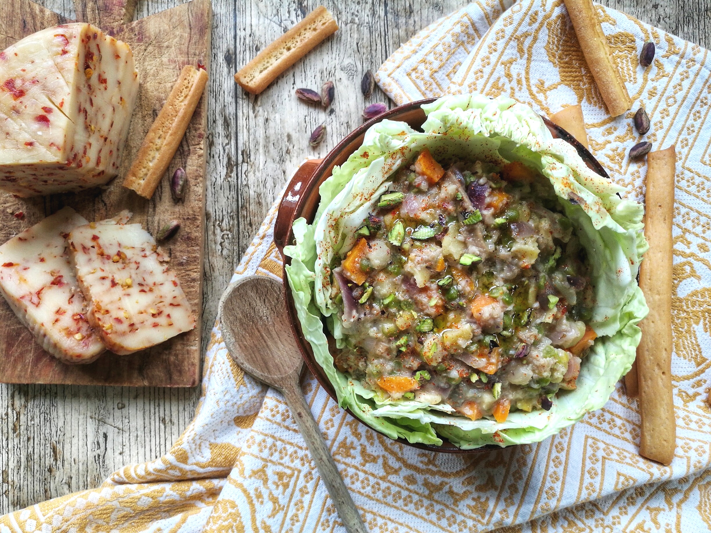 - Poco prima di spegnere la zuppa, aggiungete i funghi e il pecorino a pezzetti. Mescolare bene con un cucchiaio di Extravergine. Servire la zuppa dentro le foglia di cavolo secondo gli usi medioevali, ultimare con un pizzico di peperoncino in polvere, un bel giro d’olio e i pistacchi spezzettati.