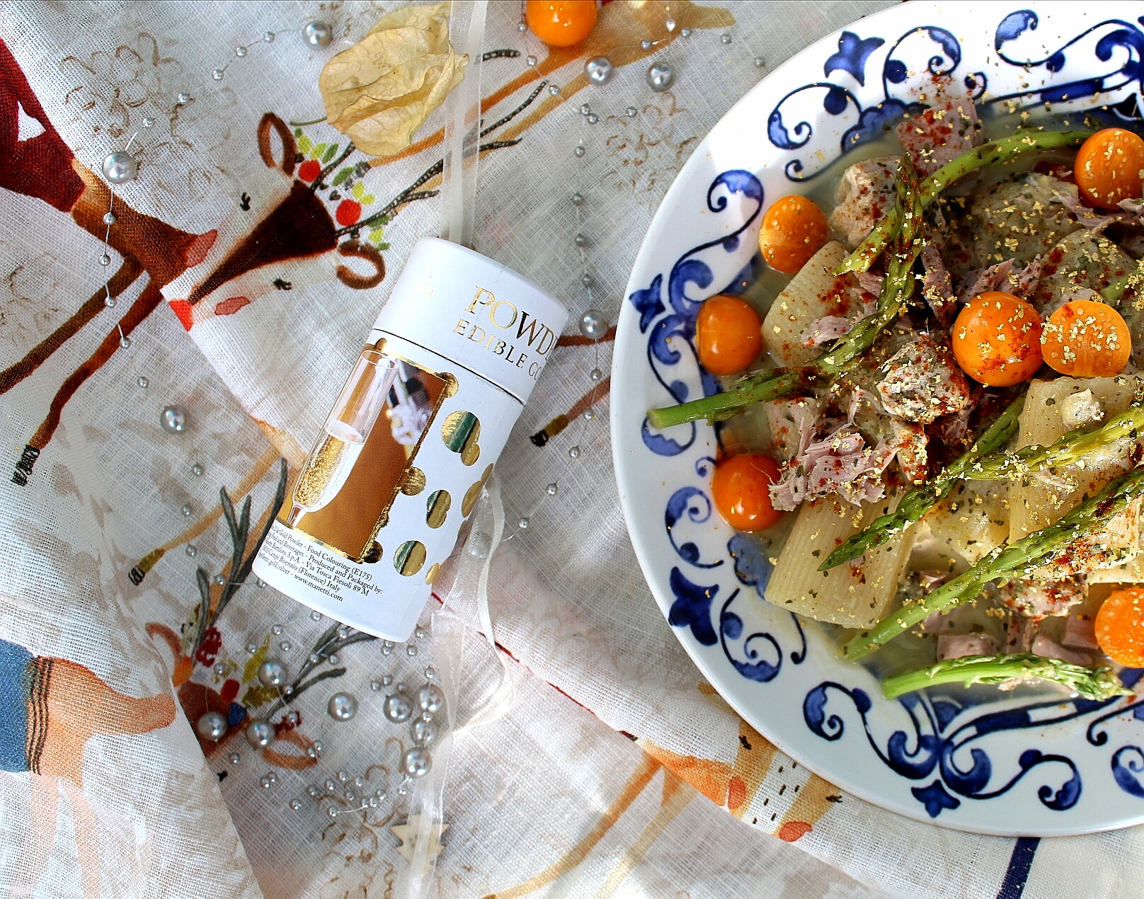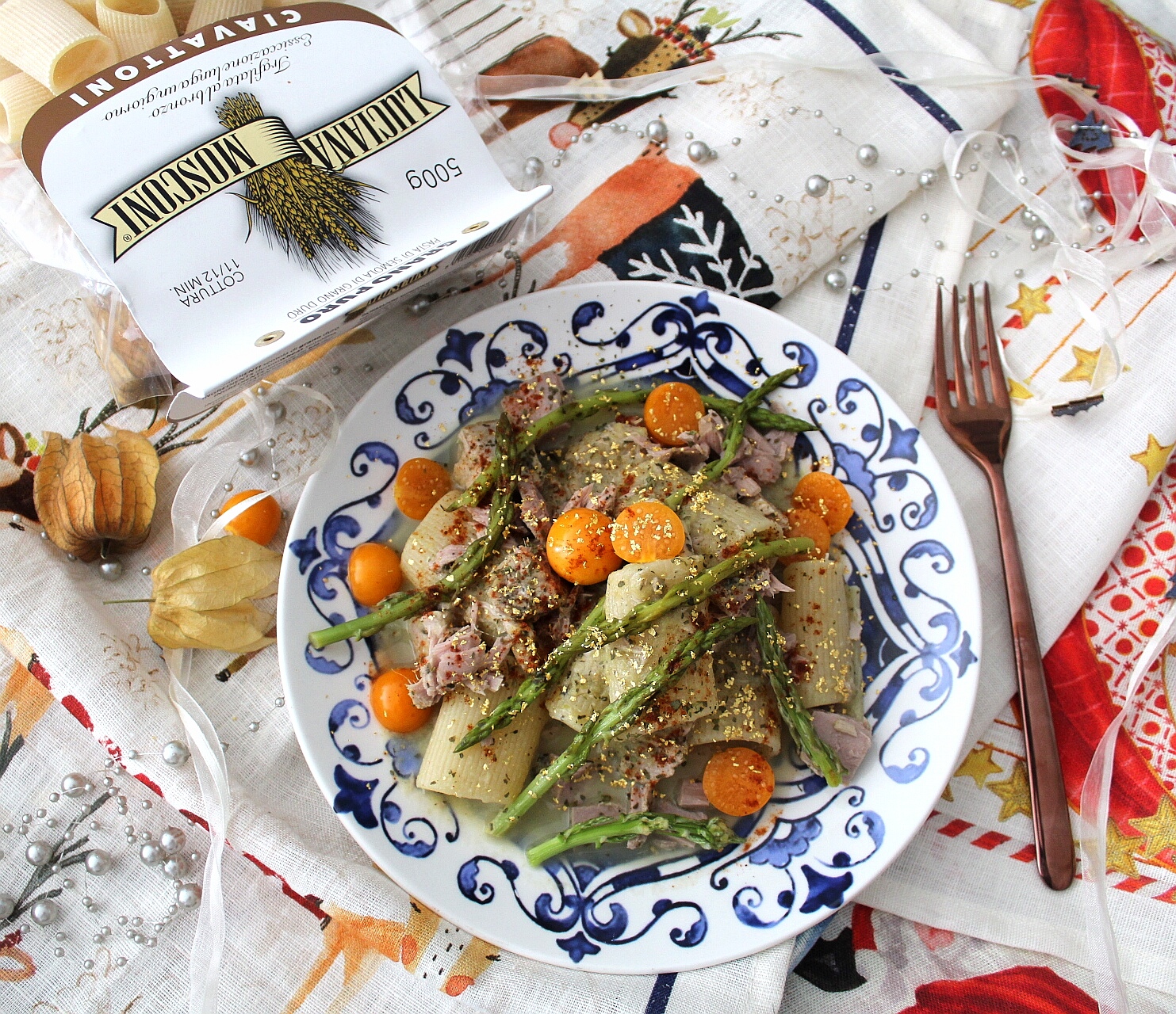 Ho scelto per Capodanno un piatto semplice e raffinato insieme, un primo leggero ma ricco di sapore, un frammento di mare bagnato da bagliori di luce. Tonno e polvere d’oro, gocce arancioni di physalis su onde blu di ceramica. E poi pizzichi di rosso e di verde. Tutto bilanciato, tutto in equilibrio, un piatto che è una congiunzione, inframmezzata da “se” e “ma” personali farciti di bontà e di bellezza…