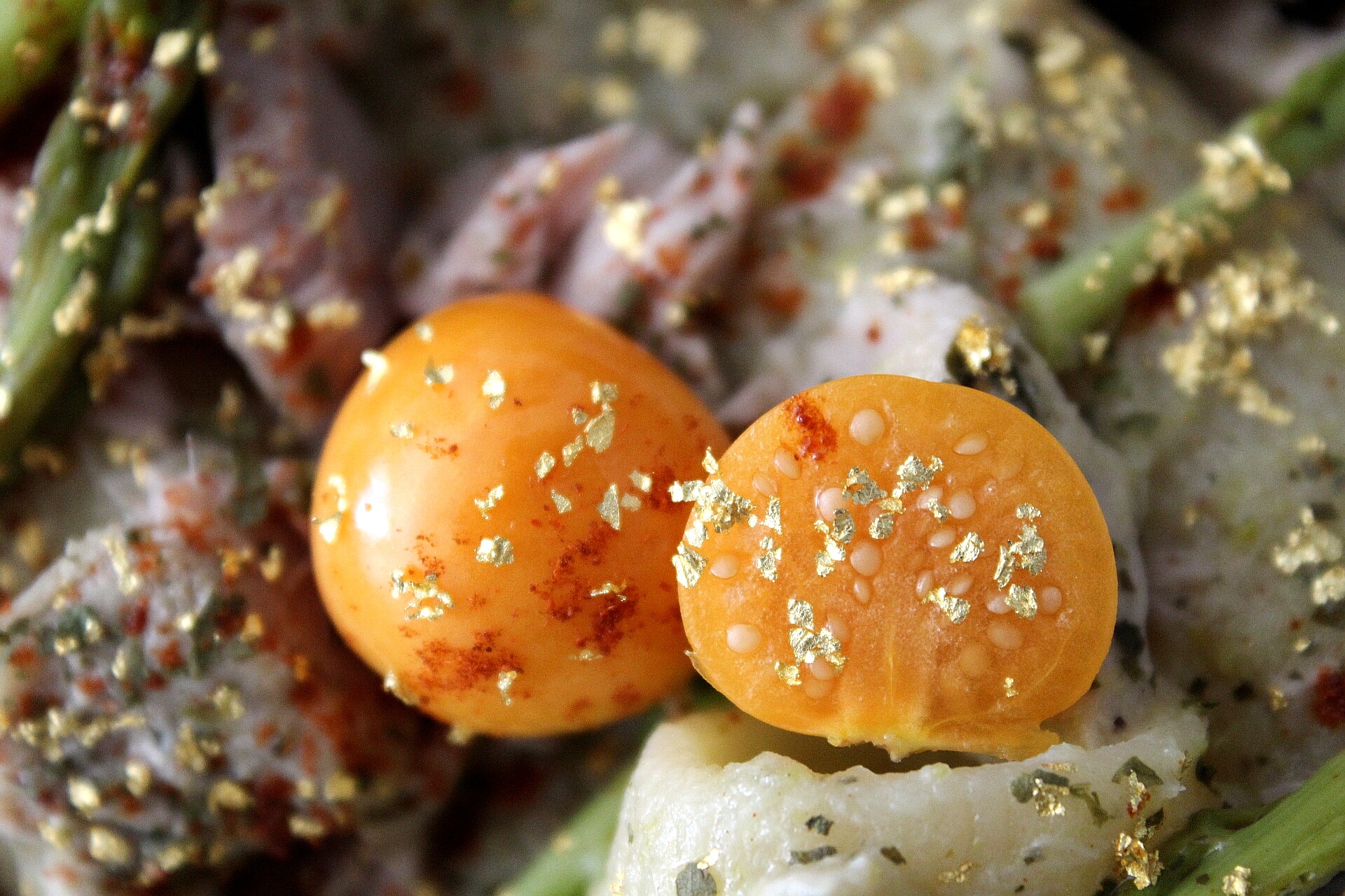 CIAVATTONI ALLA CREMA DI ASPARAGI, TONNO MARINATO AL CORIANDOLO, PHYSALIS E POLVERE D’ORO