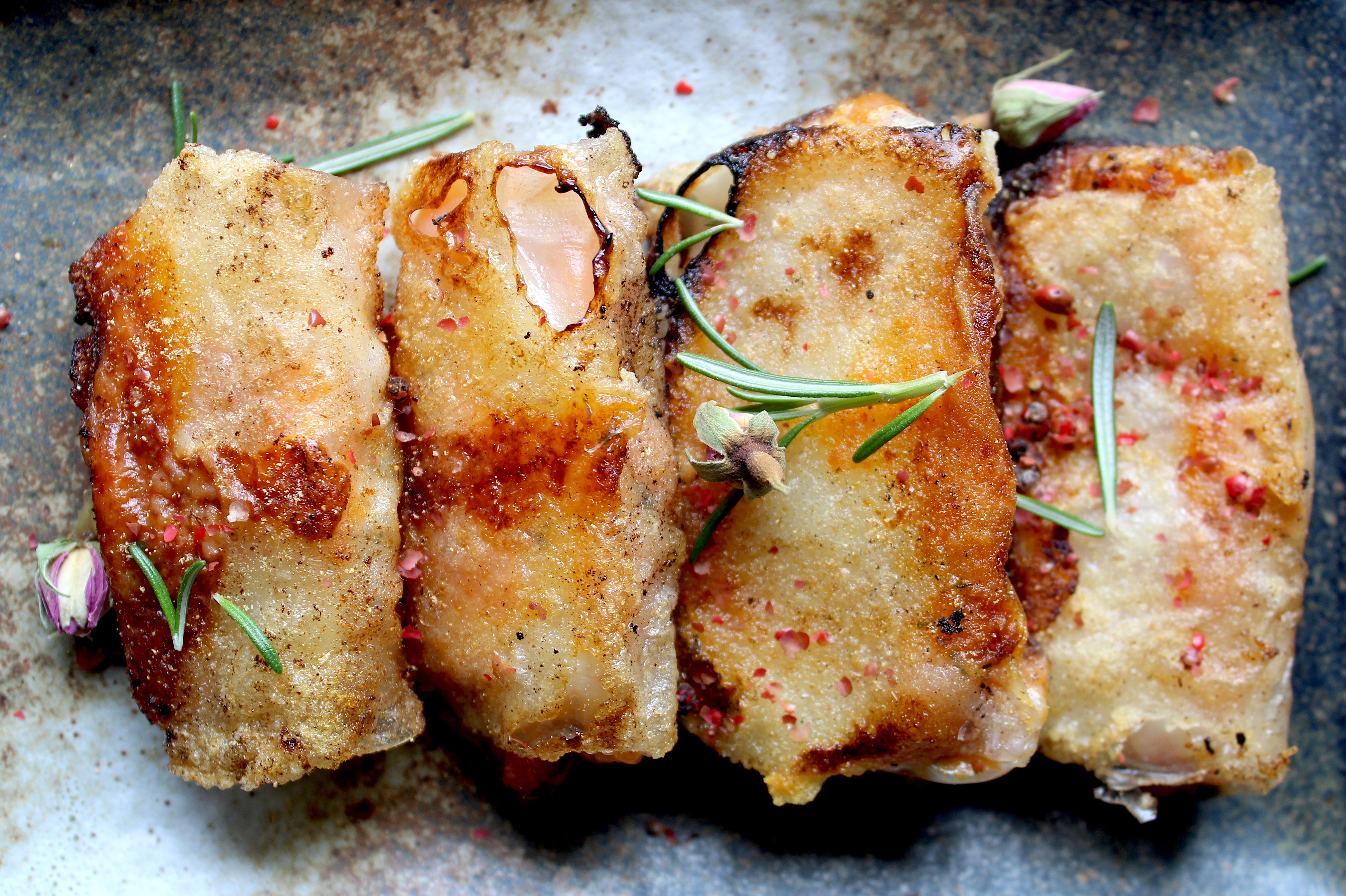 - Friggete gli involtini in olio bollente per 1-2 minuti e scolateli su carta assorbente. Decorate con aghi di rosmarino, del pepe rosa sbriciolato e qualche bocciolo di rosellina.