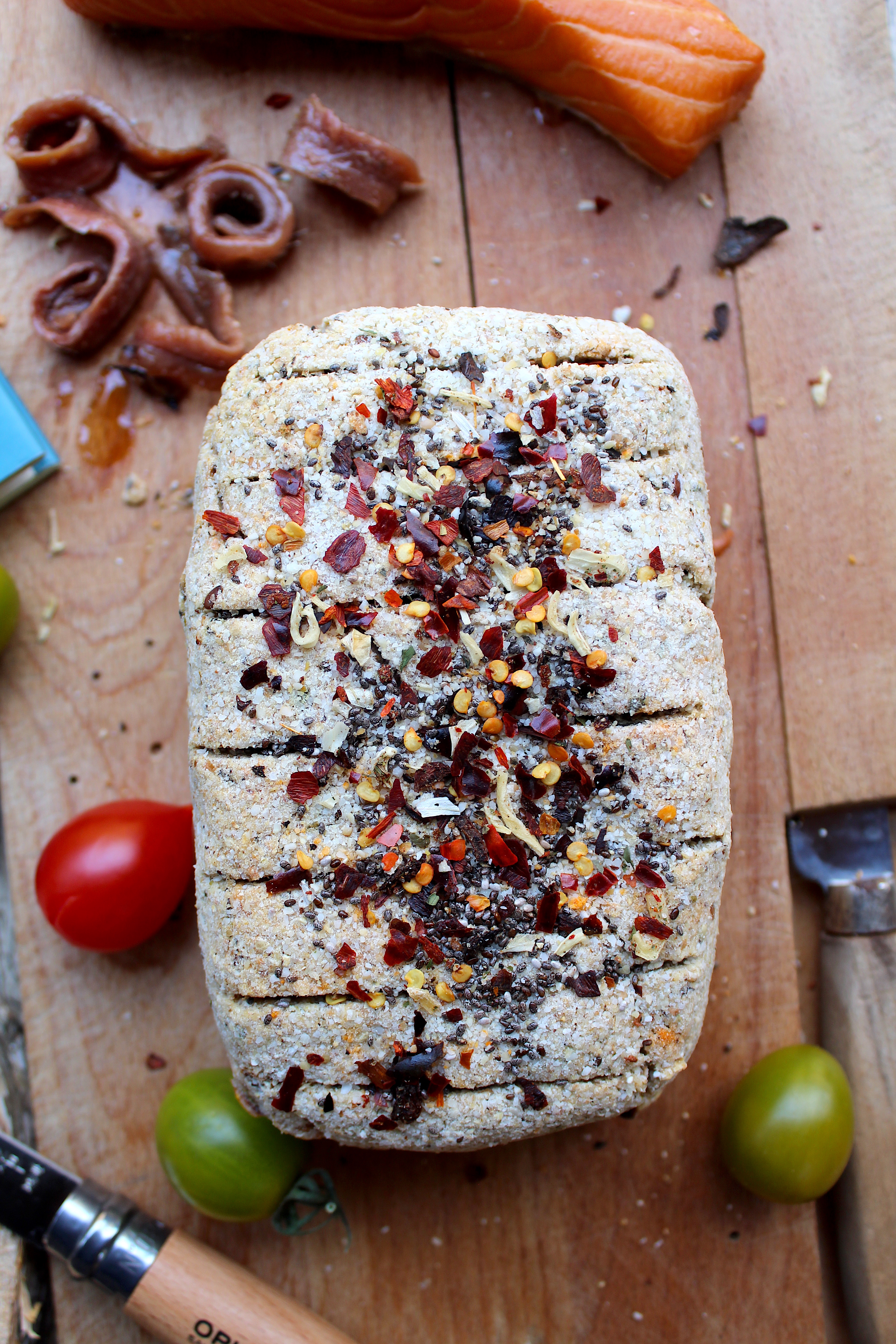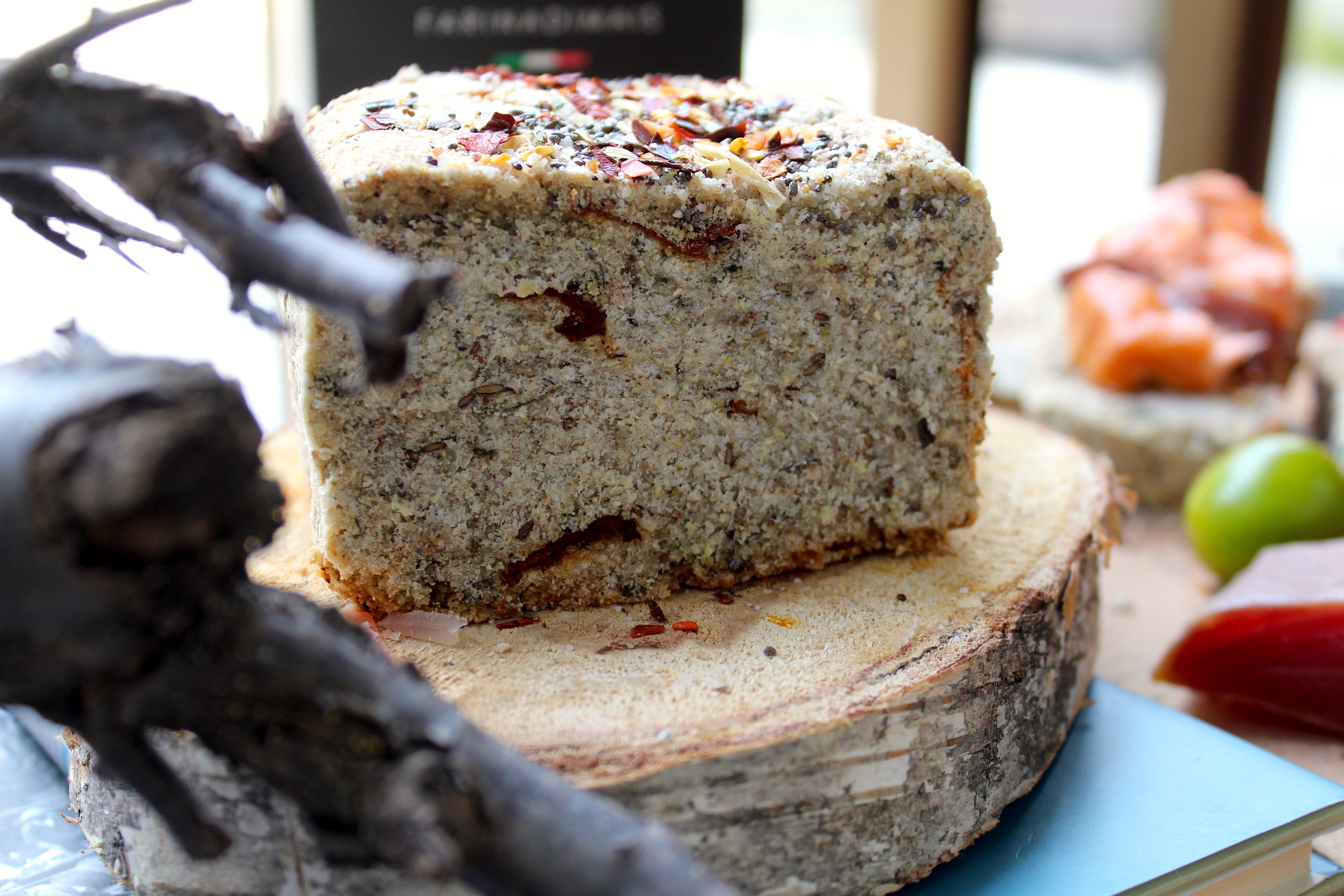 - Preparate il pane: in una ciotola mescolate le farine con i pomodorini, le alghe, i semi misti e in ultimo il lievito, l’acqua tiepida, l’extravergine e un pizzico di aromatiche. Mescolate bene il tutto, date al pane la forma di un plumcake, finite con il peperoncino in polvere e un giro d’olio, e lasciate riposare il pane per una mezz’oretta. Preriscaldate il forno.