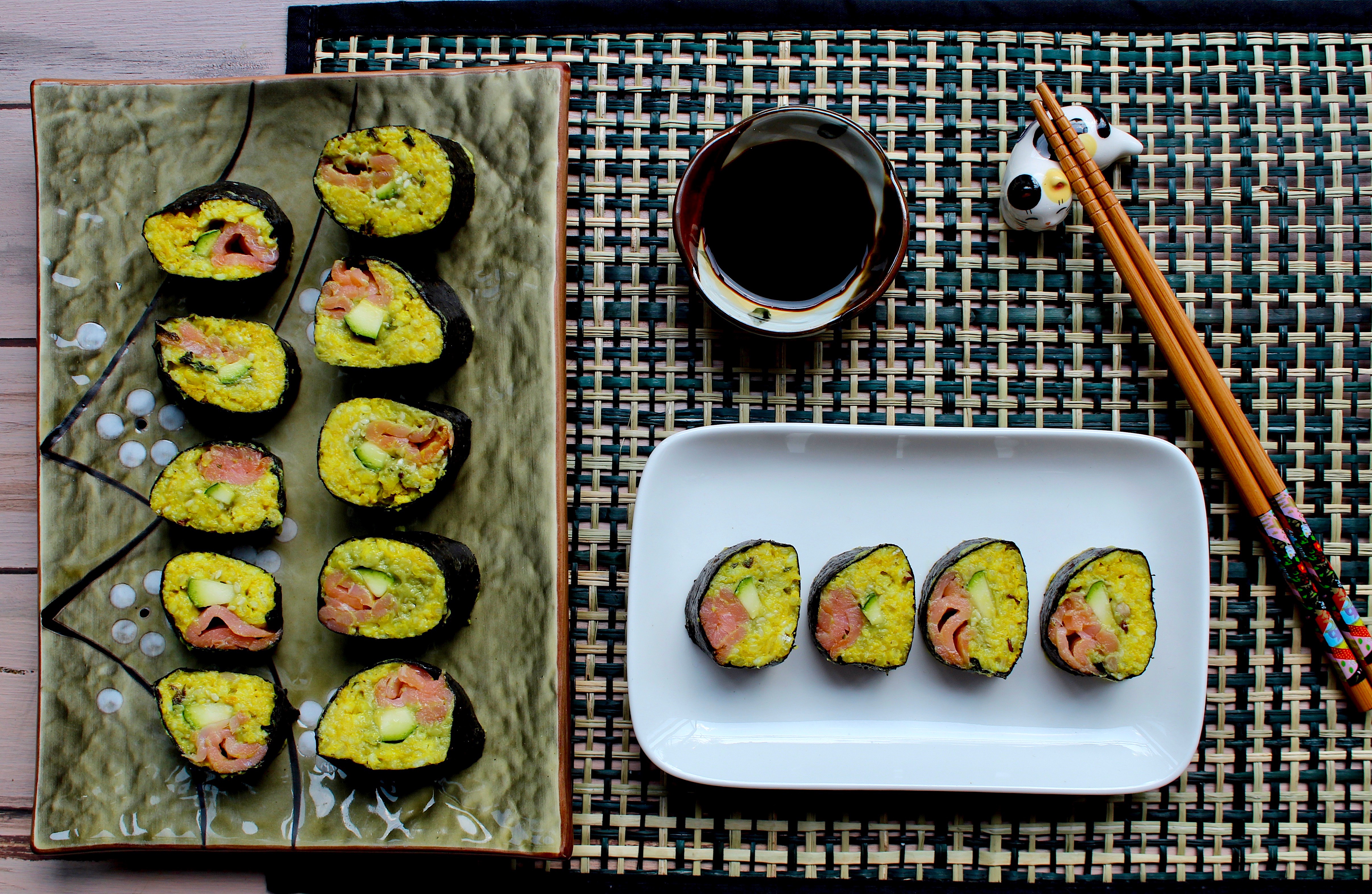 FUTOMAKI CON RISO ALLA CURCUMA, SALMONE E GUACAMOLE