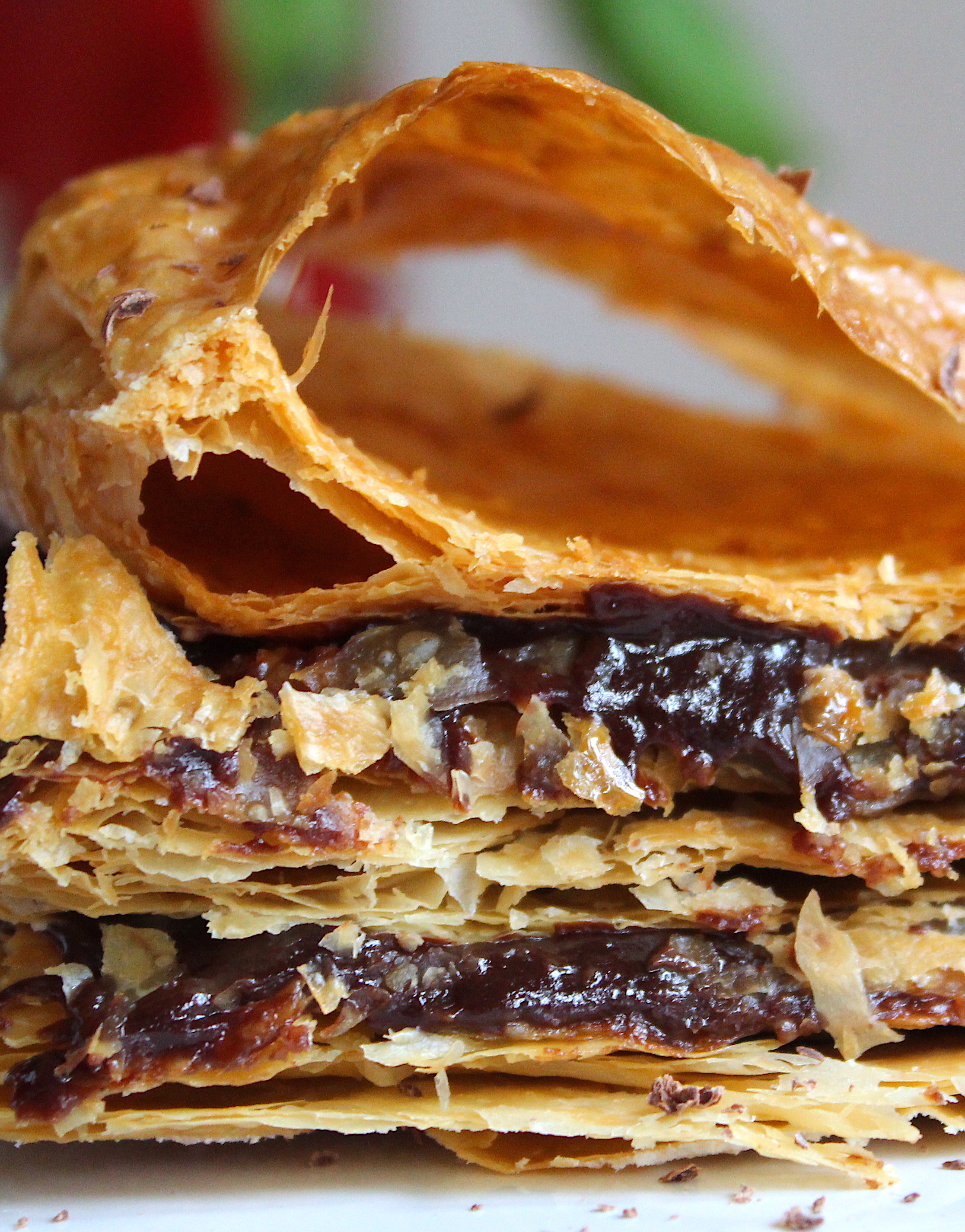 - Spalmate su quattro rettangoli la crema al cioccolato, e poi sovrapponeteli a coppie e coprite con gli ultimi due rettangoli senza crema. Tagliate ogni millefoglie ancora in due parti (otterrete così 4 porzioni).