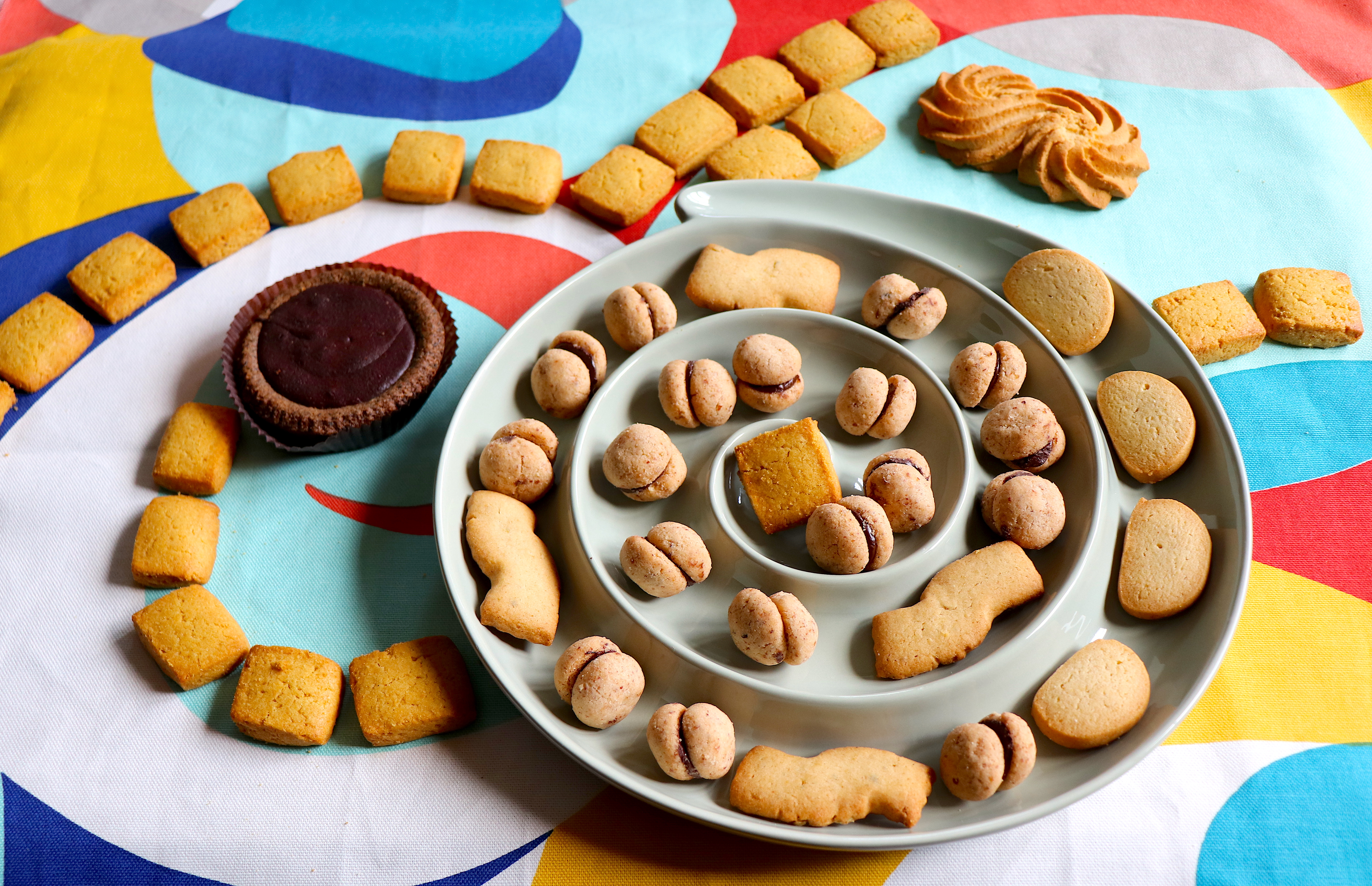 Allora la presentazione di questi biscotti secchi, oggi, è pensata immaginando che ogni elemento sia il tassello di una composizione ritmica, sonora e cadenzata su onde di energia e di colore alla maniera di Robert e Sonia. Perché pensando a loro e alla loro arte, pensiamo anche al cibo come forma, come parte di un tutto, come struttura in senso artistico. È un esercizio di bellezza che ci accompagna nella nostra quotidianità anche nell’apprezzamento di uno stile scomposto del colore e della variabilità dei suoi gradi di saturazione che come un’onda si crea, si plasma, si disfa e si ricrea. Proprio come nelle opere di Robert e Sonia Delaunay.