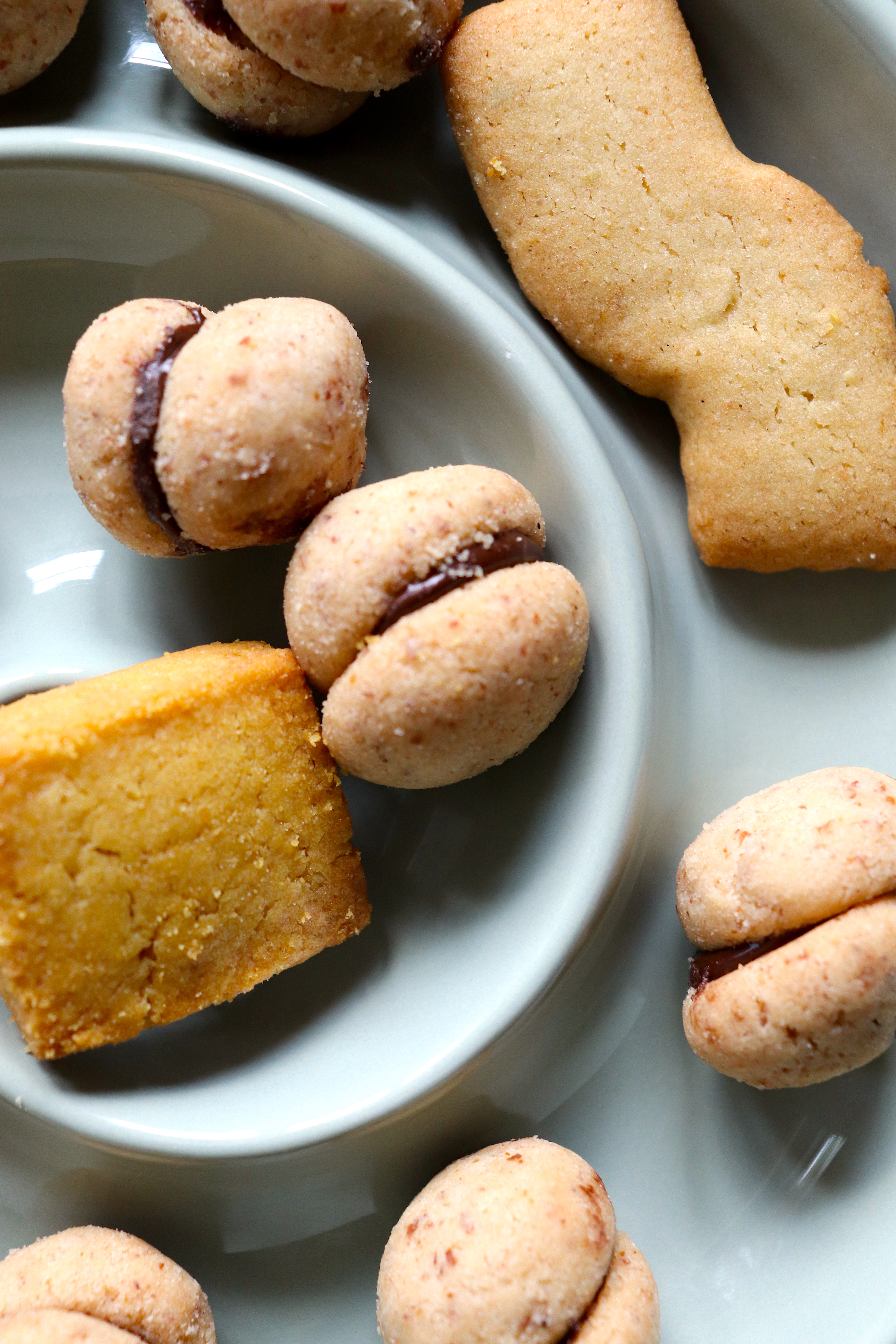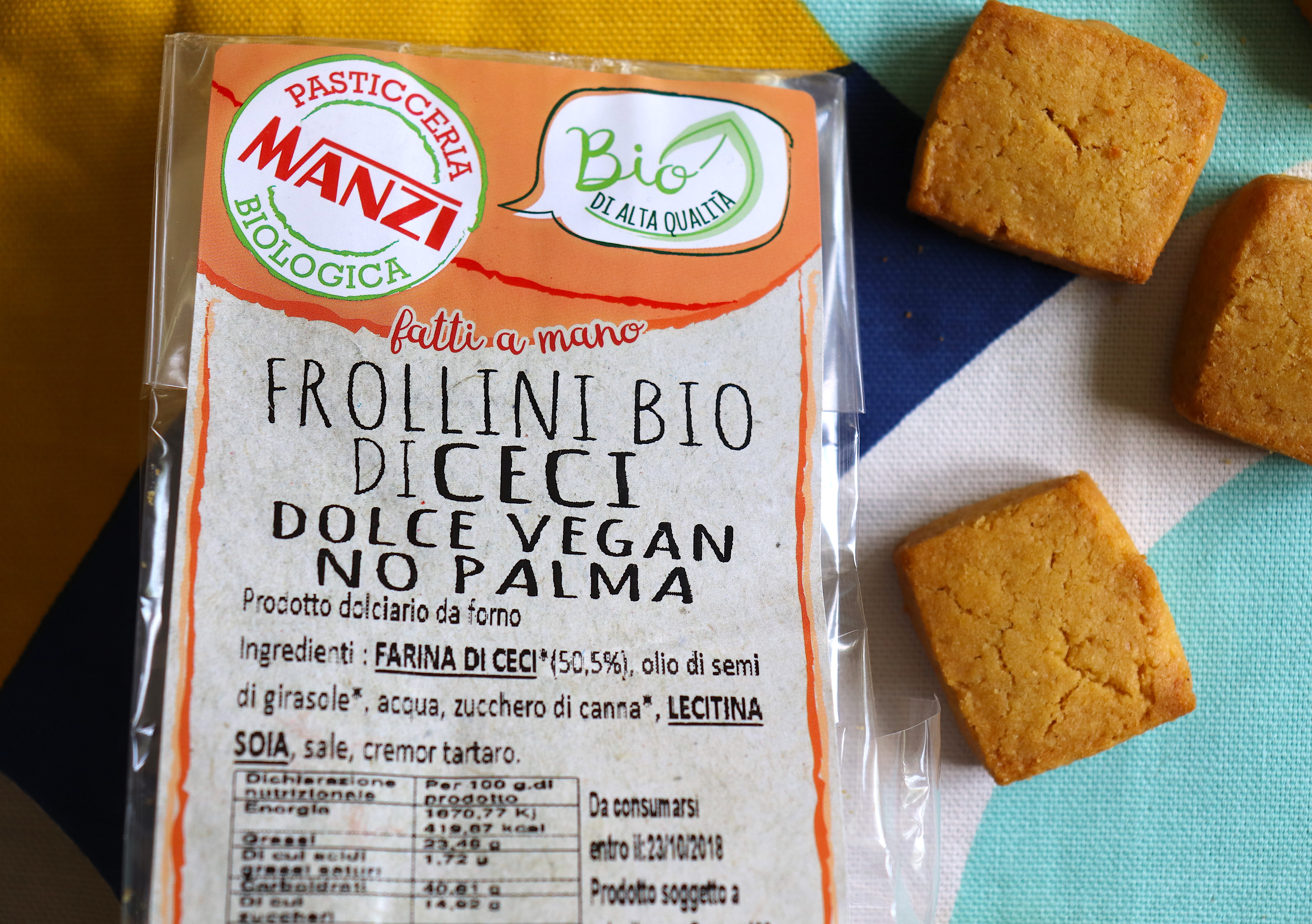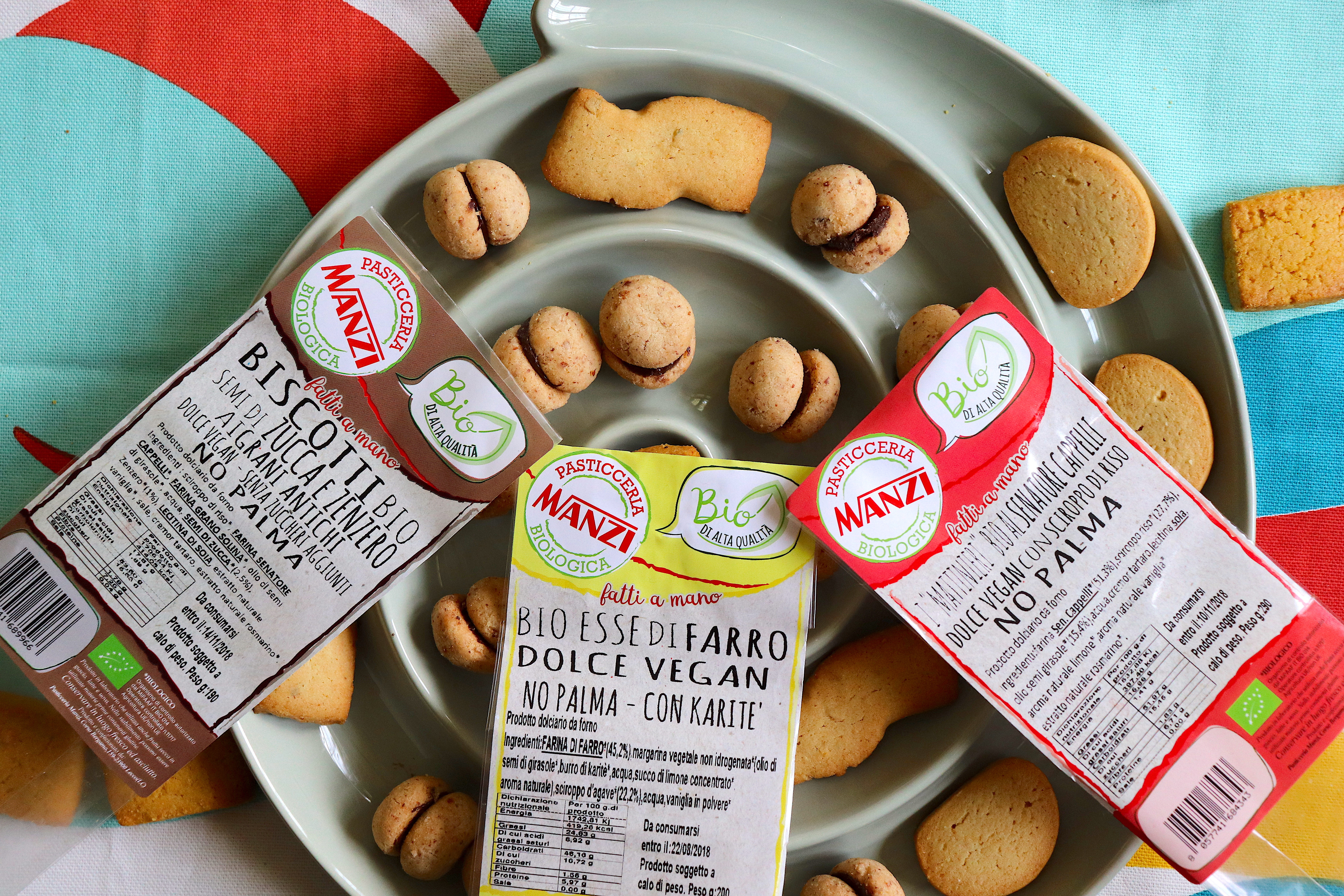 Scelgo Frollini di ceci, alla farina Senatore Cappelli, ai semi di zucca e zenzero con grani antichi. E una crostatina al farro e cioccolato e dei baci di dama di una golosità incredibile. Tutto rigorosamente bio e vegan della PASTICCERIA MANZI