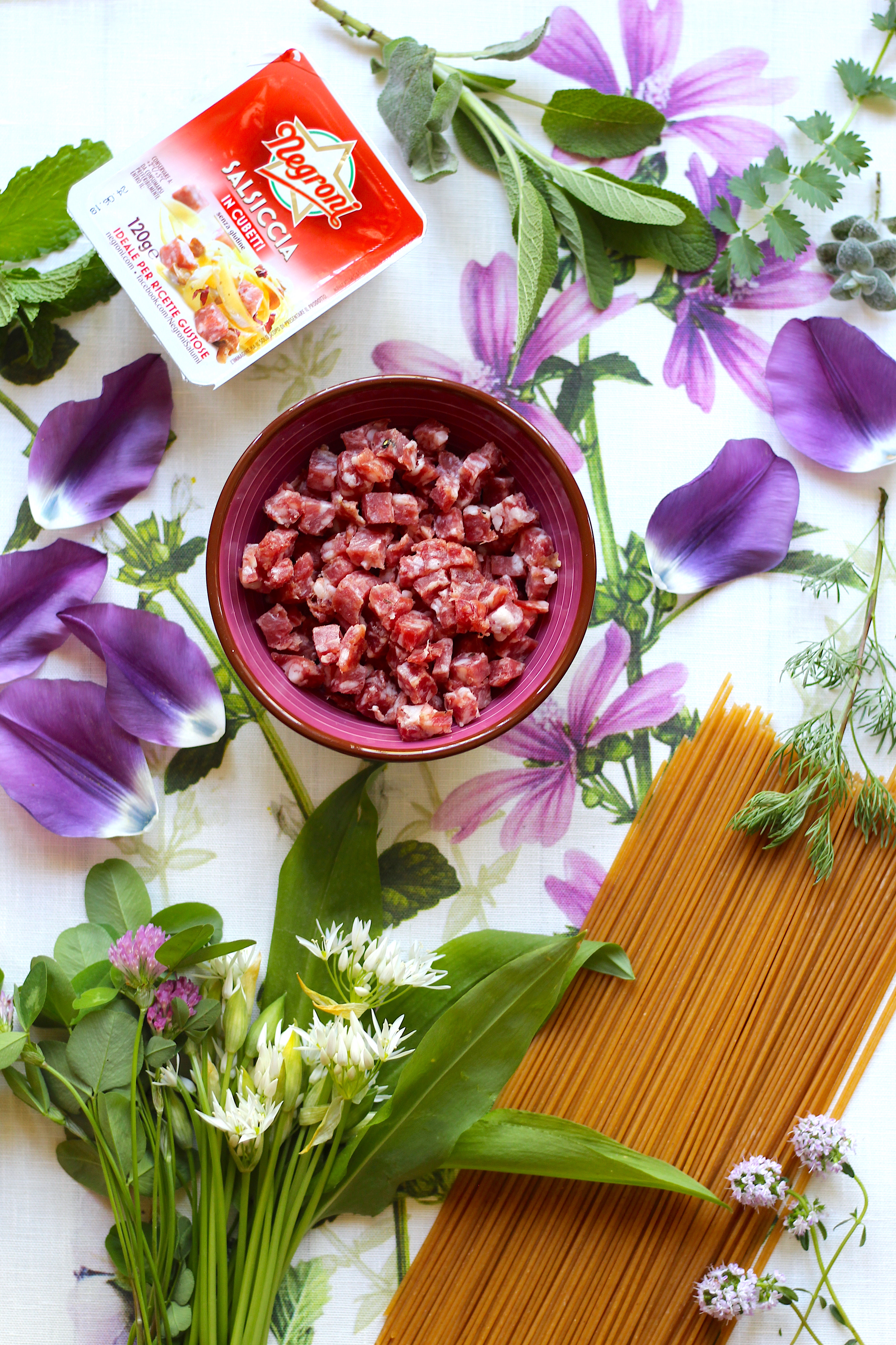 200 g di pasta integrale, 1 manciata di frutta secca mista; 125 g di salsiccia classica a cubetti Negroni; 1 cucchiaio di mandorle pelate; aromatiche miste (aglio orsino, pimpinella, nepetella, rosmarino, menta, timo, timo greco, salvia, santoreggia, santolina); 1 bicchiere di Prosecco; olio evo, sale e pepe q.b.