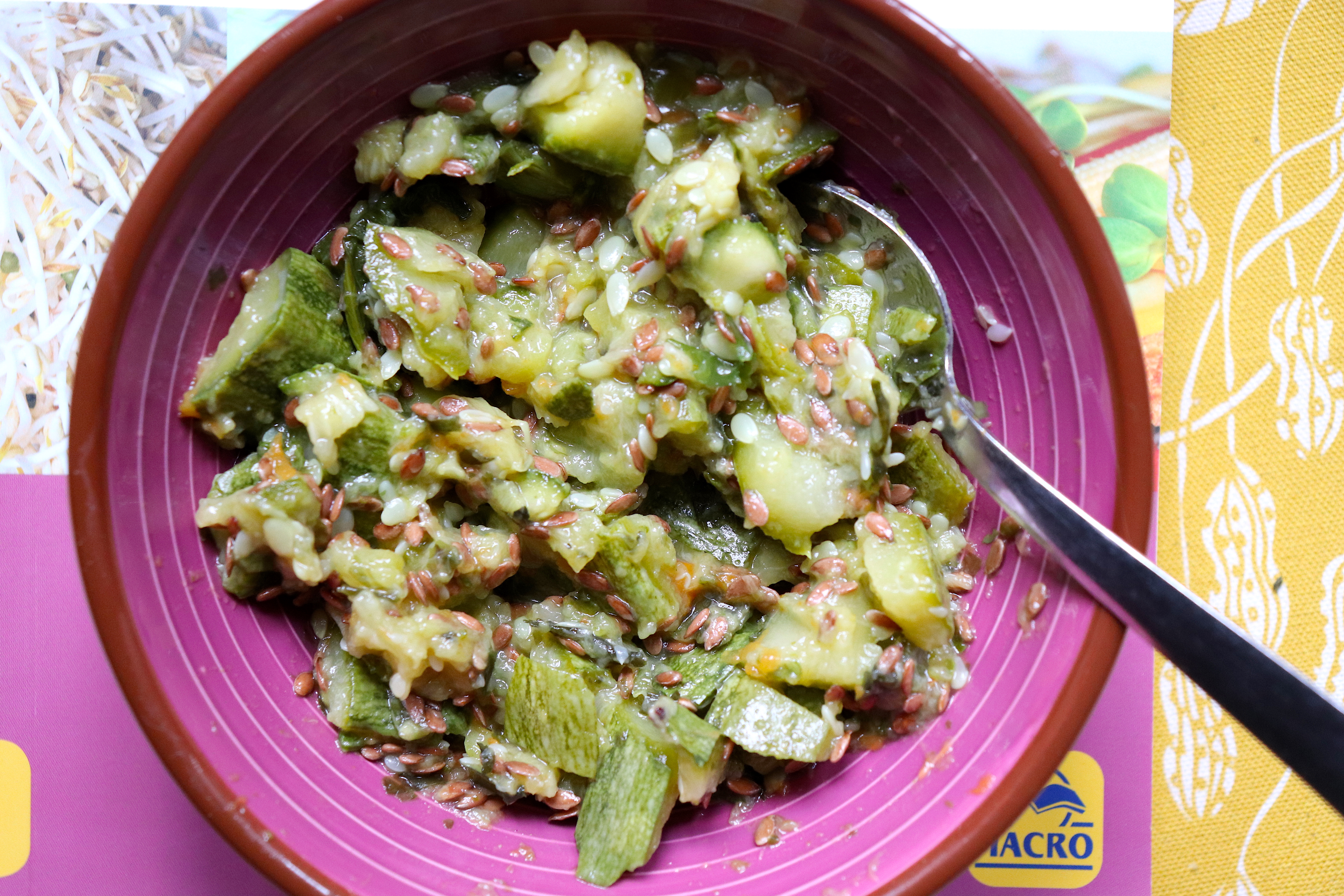 - Fate raffreddare le zucchine, poi trasferitele in una ciotola, aggiungete i semi di lino, la lattuga di mare e un pizzico di pepe e mescolate il tutto energicamente.