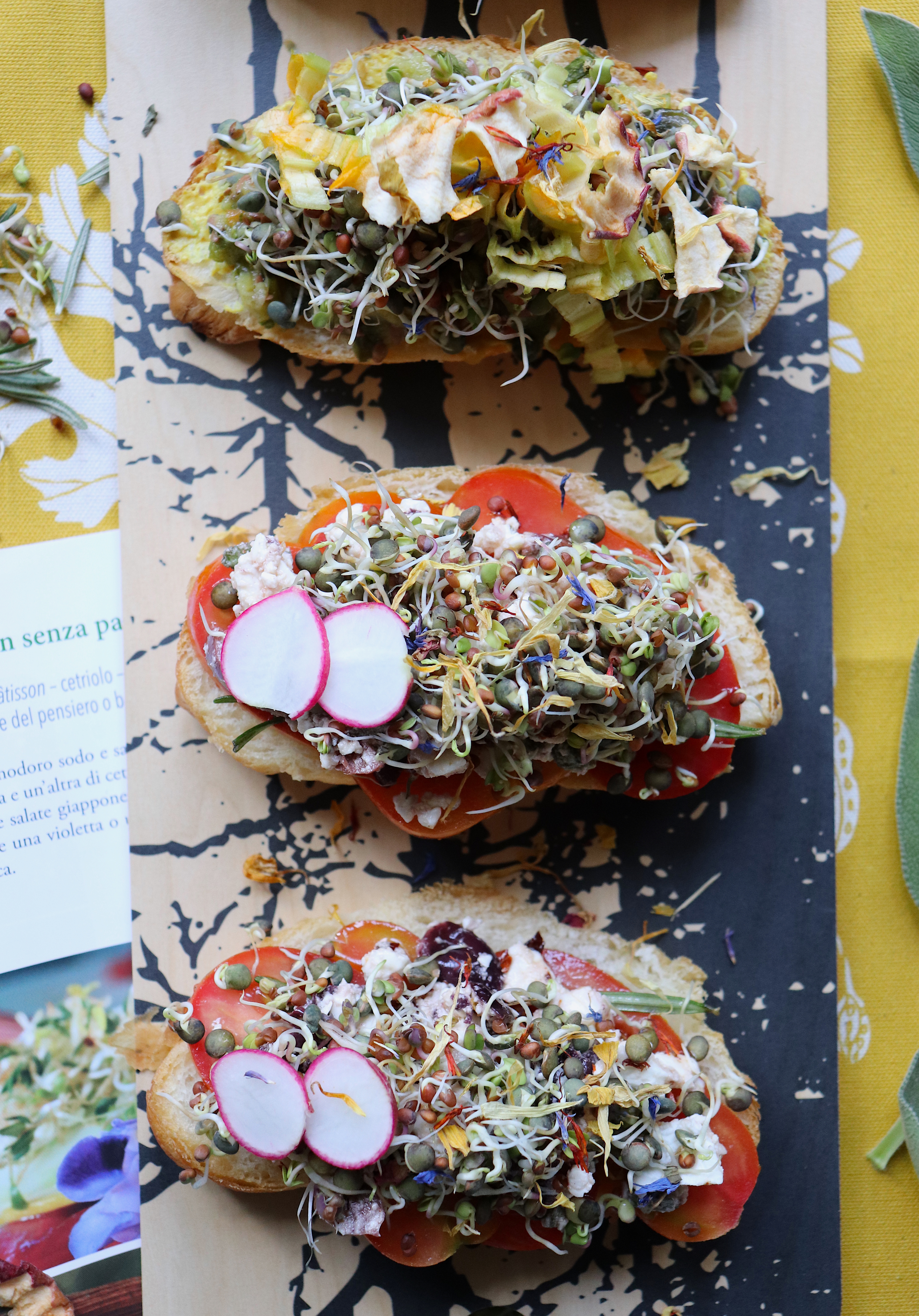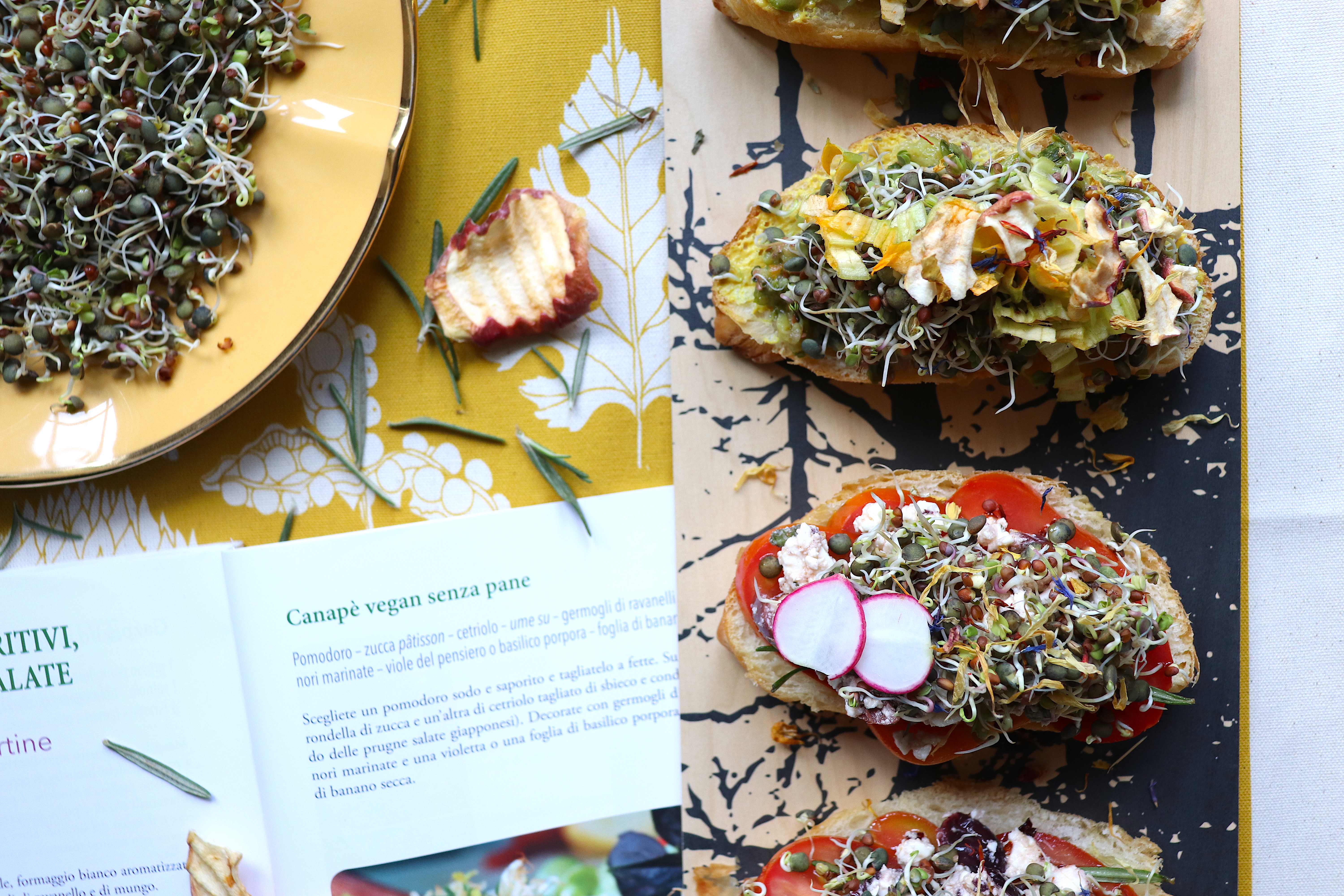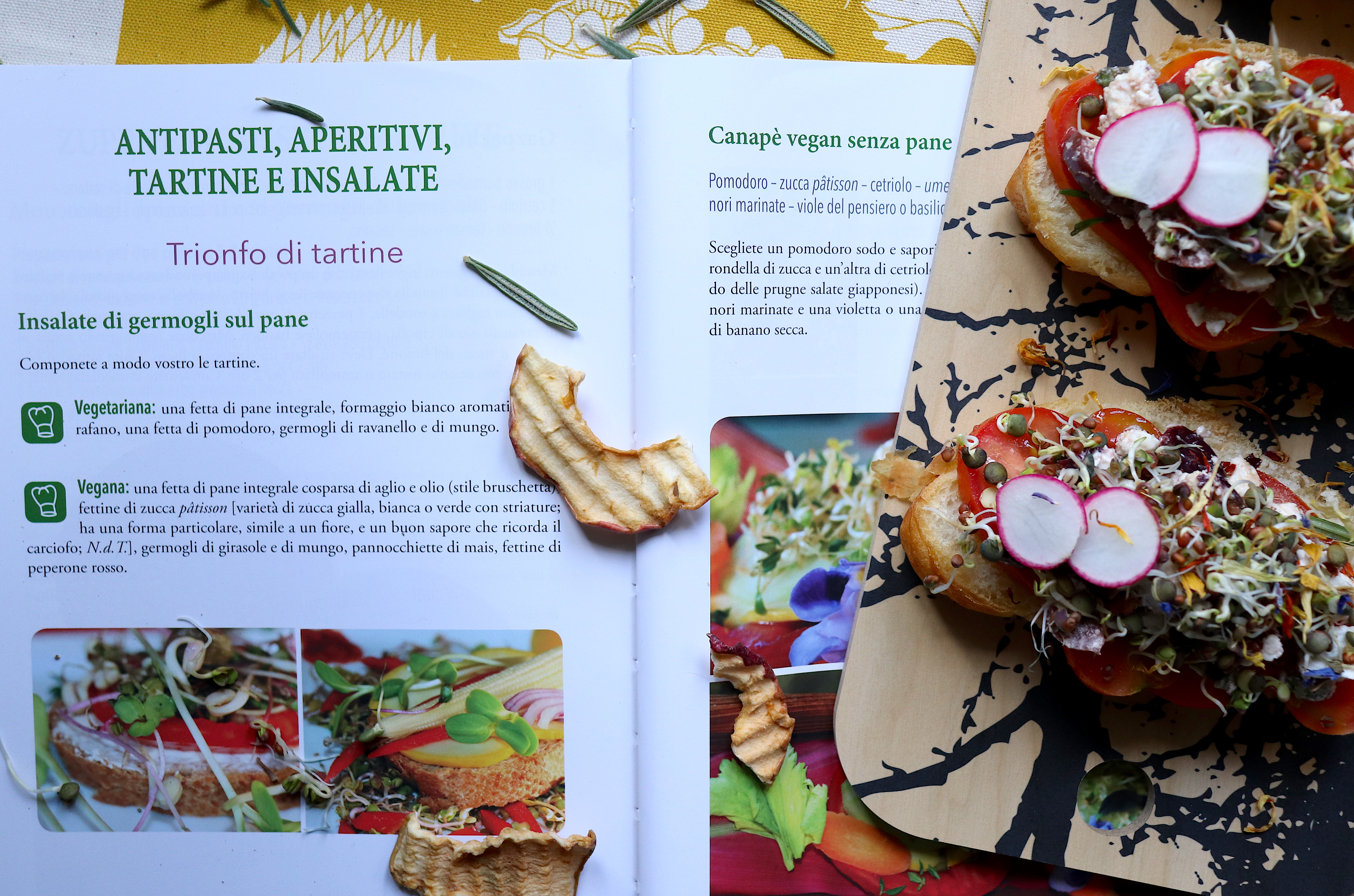 Lasciatevi attraversare dal senso di meraviglia e di stupore che questi piccoli concentrati di vita sanno offrire, e regalatevi anche qualche bella idea di piatto sano e gustoso grazie al piccolo ricettario presente al fondo del libro: da torte per la colazione a zuppe (delizioso il Gazpacho ai germogli!) a insalate gourmet. Io mi sono lasciata ispirare dal Trionfo di tartine, coloratissime e buonissime, e ho preparato dei croissant salati vegan in due versioni: una vegetariana e una vegana. Vi divertirete, e mangerete benissimo!