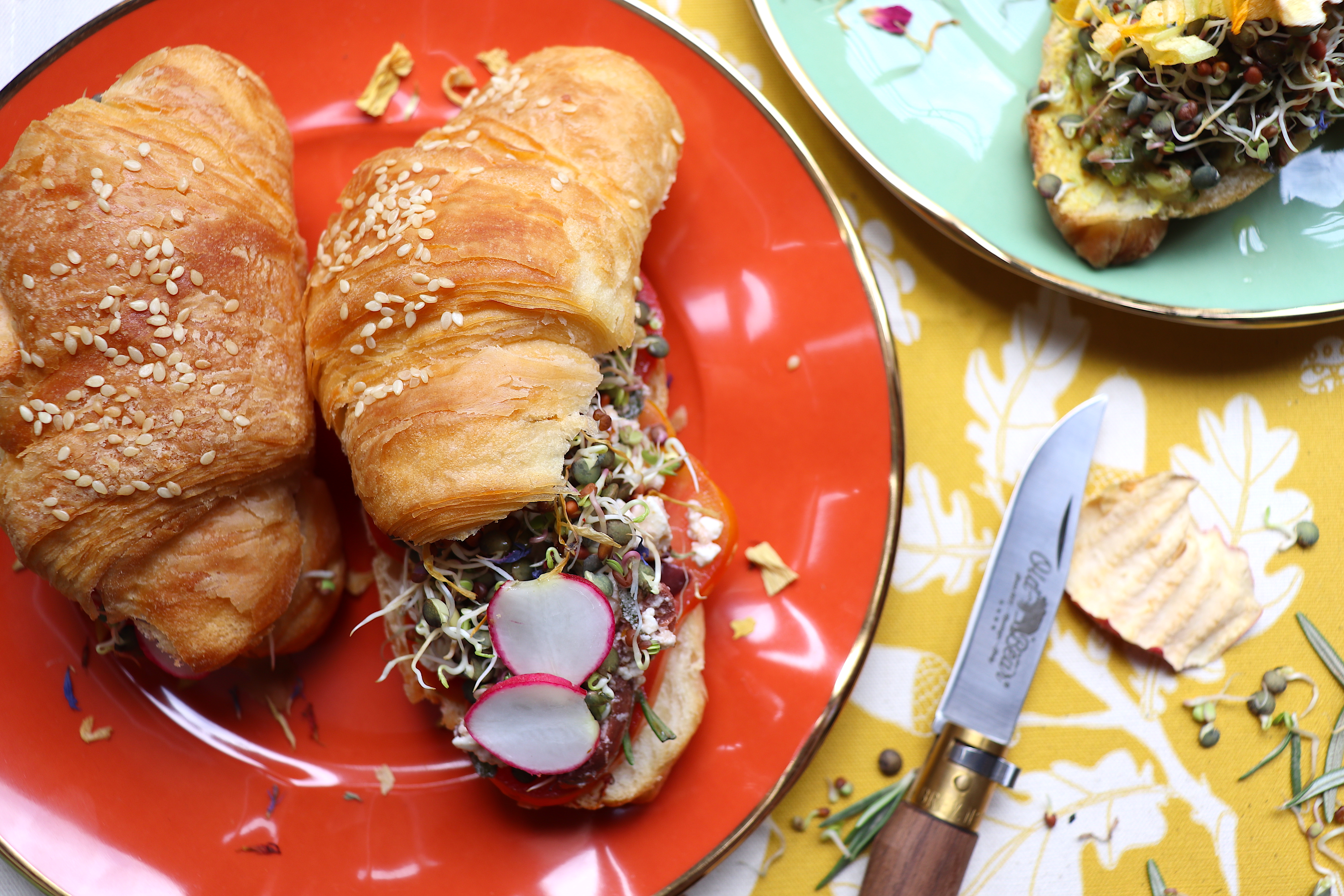 - Assemblate: tagliate a metà i croissant. Bagnate le tre basi con un goccio di olio, poi copritele prima con le fette di pomodoro, poi con la crema di formaggio e olive, infine con i germogli e i ravanelli a fettine.