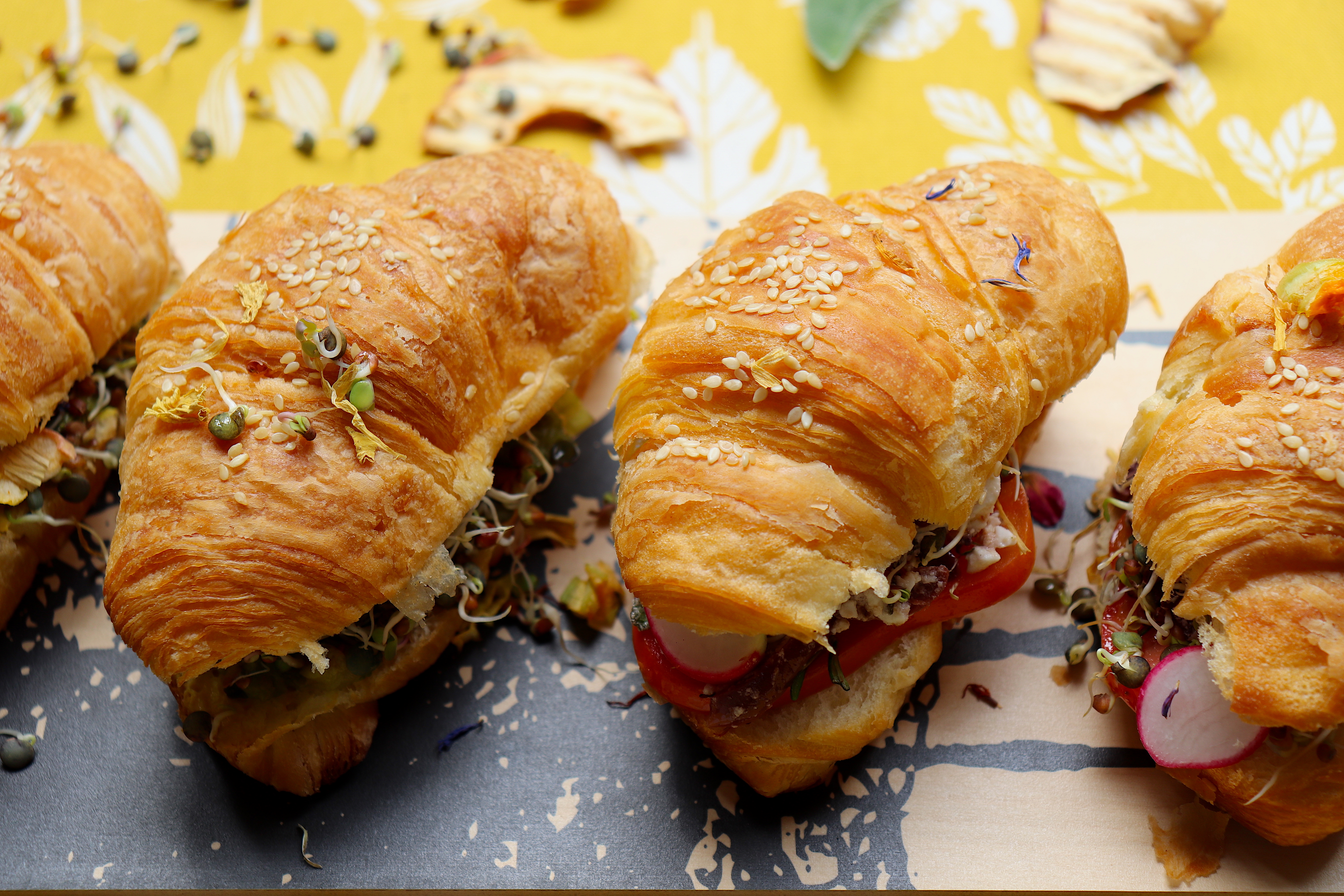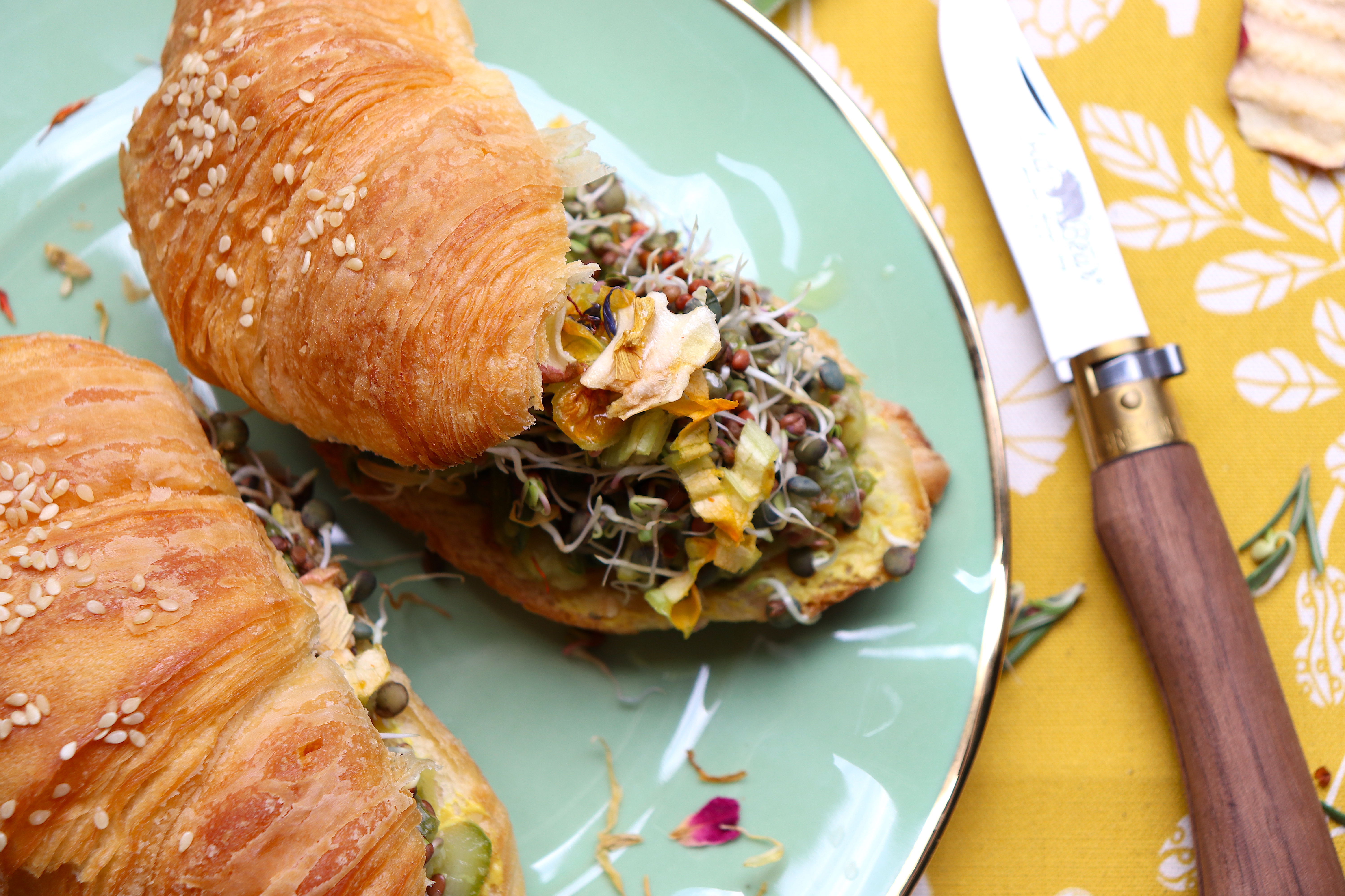 - Servite i croissant con qualche fiore edule e ancora una leggero giro di extravergine.