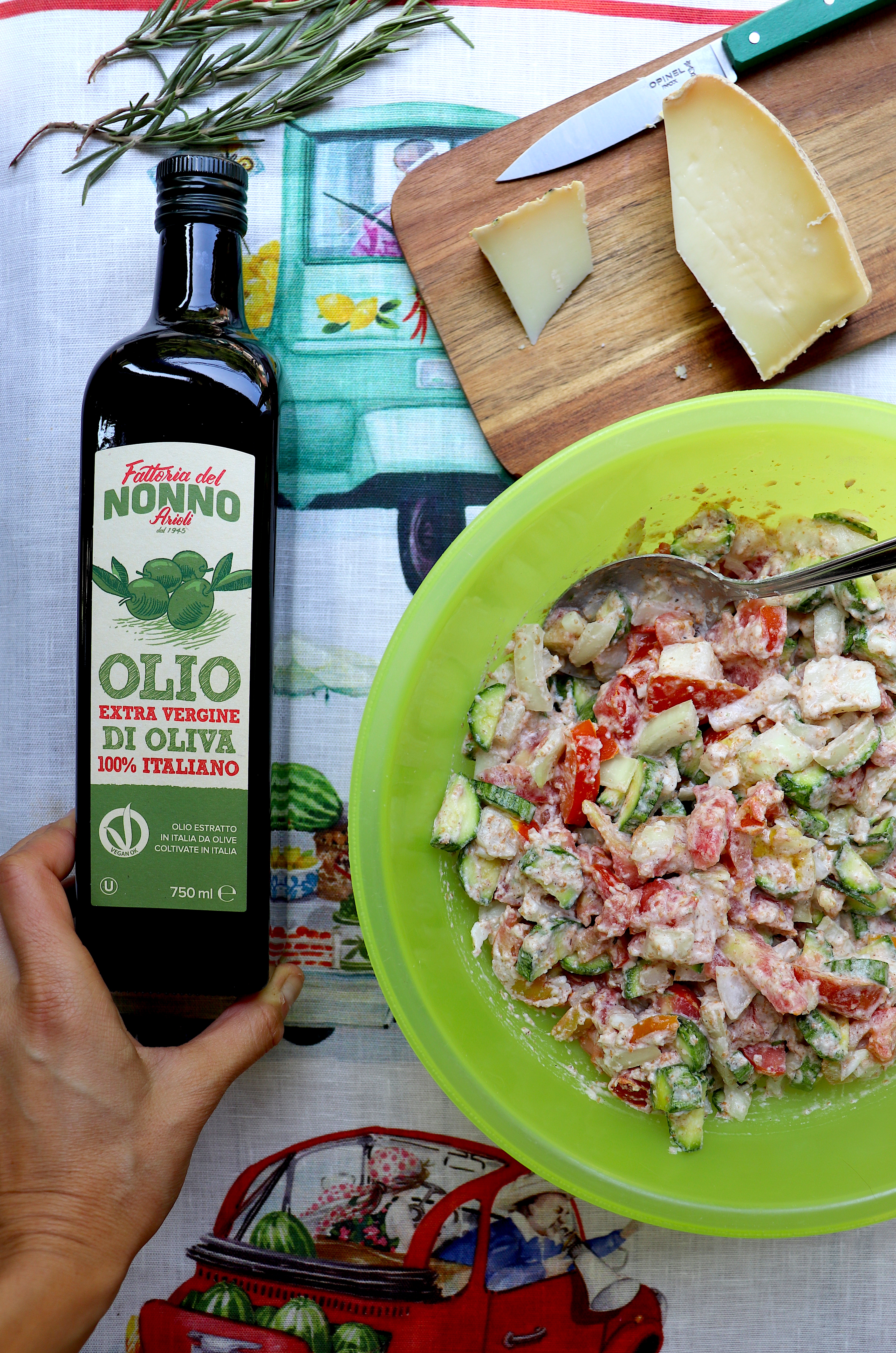 5 zucchine, 2 cipolle gradi, 1 kg di pomodori freschi spellati, 120 g di Pecorino Sardo Maturo, sale, 2 cucchiai di extravergine d’oliva Arioli; 125 g di farina; pomodorini e rosmarino per decorare.