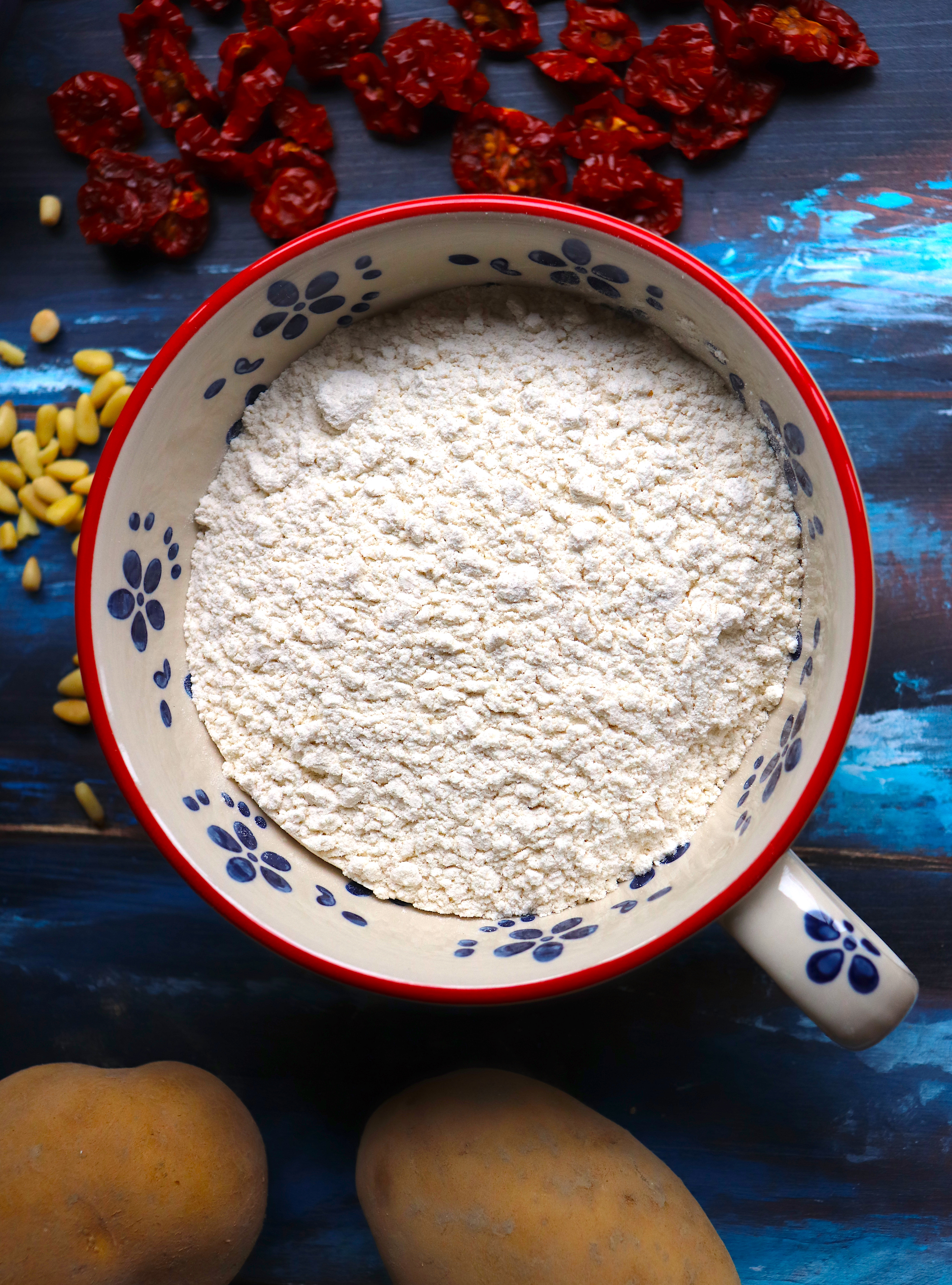 - Preparate la crema di patate: bollite le patate in abbondante acqua bollente salata, pelatele e frullatele insieme alla panna e a un cucchiaio di extravergine. Aggiungete i pinoli dopo averli tostati un minuto (tenetene da parte qualcuno per la decorazione), mescolate bene il tutto.