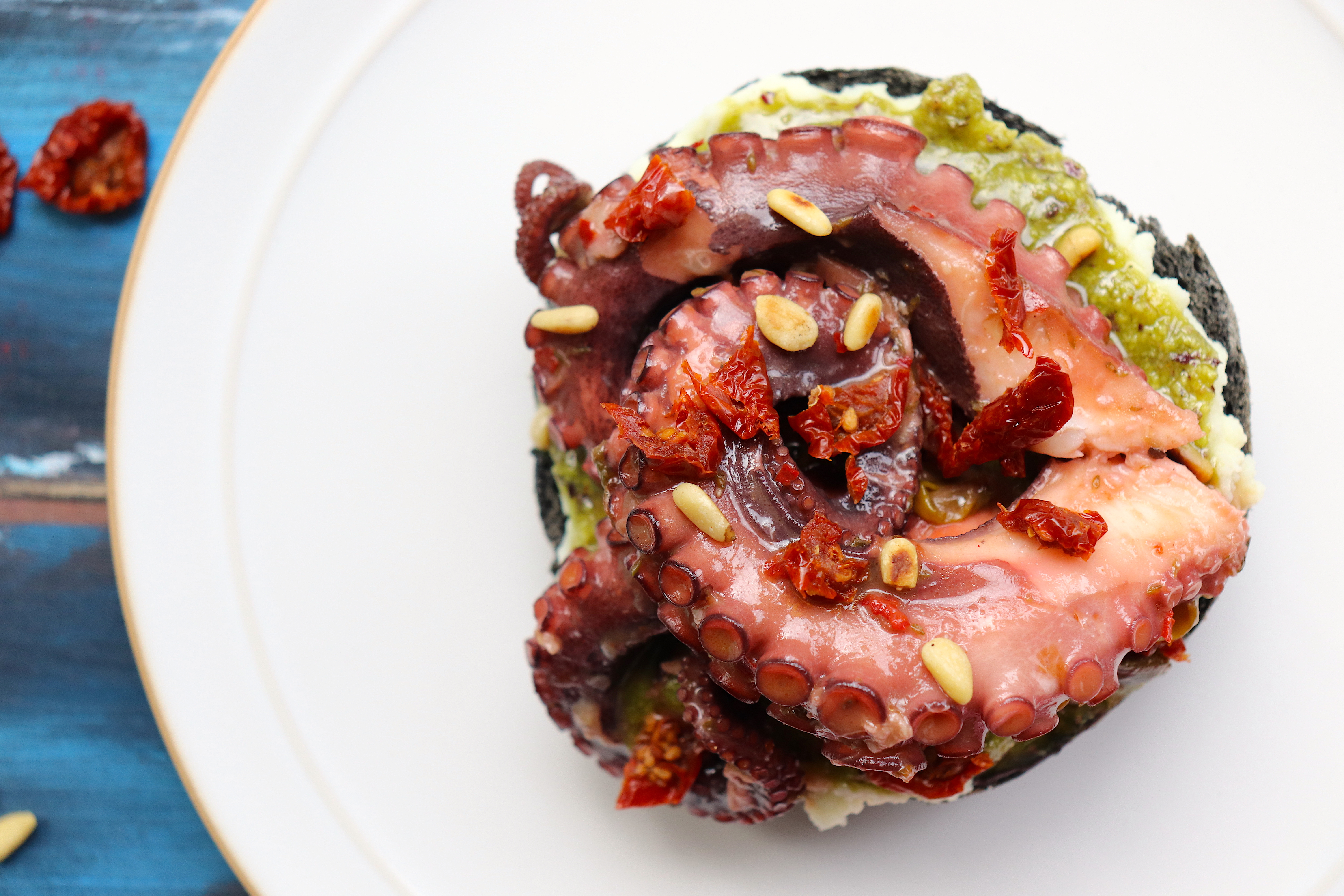 PANINO AL NERO DI SEPPIA CON CREMA DI PATATE E PINOLI, POLPO ALL’AGLIO, PESTO DI PISTACCHIO E POMODORINI SECCHI