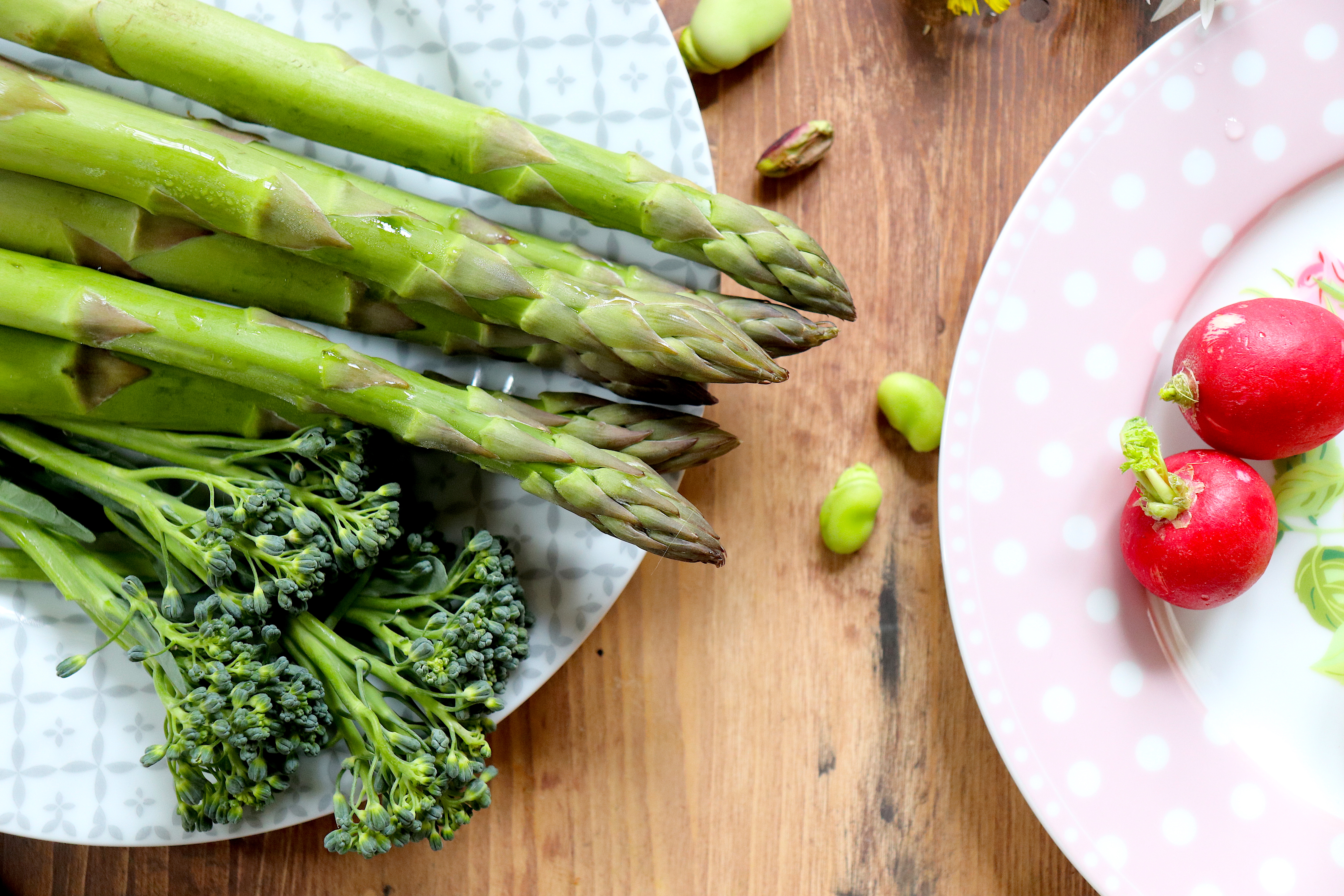 - In una padella scottate qualche minuto le punte di asparagi e le cime di broccolo in un po’ di acqua con un pizzico di sale e di pepe.
