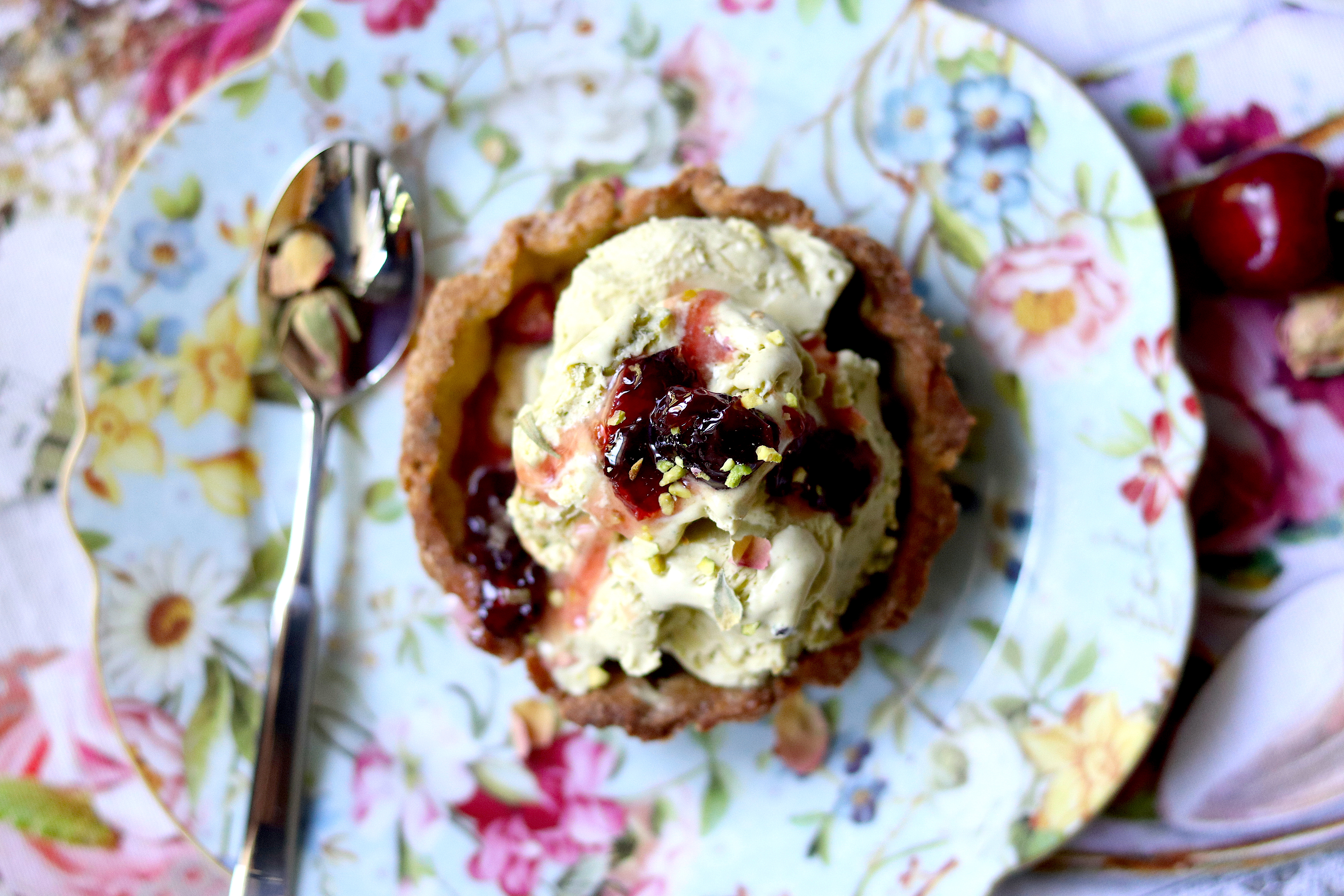 CROSTATINE CON GELATO AL PISTACCHIO E CILIEGIE SCIROPPATE