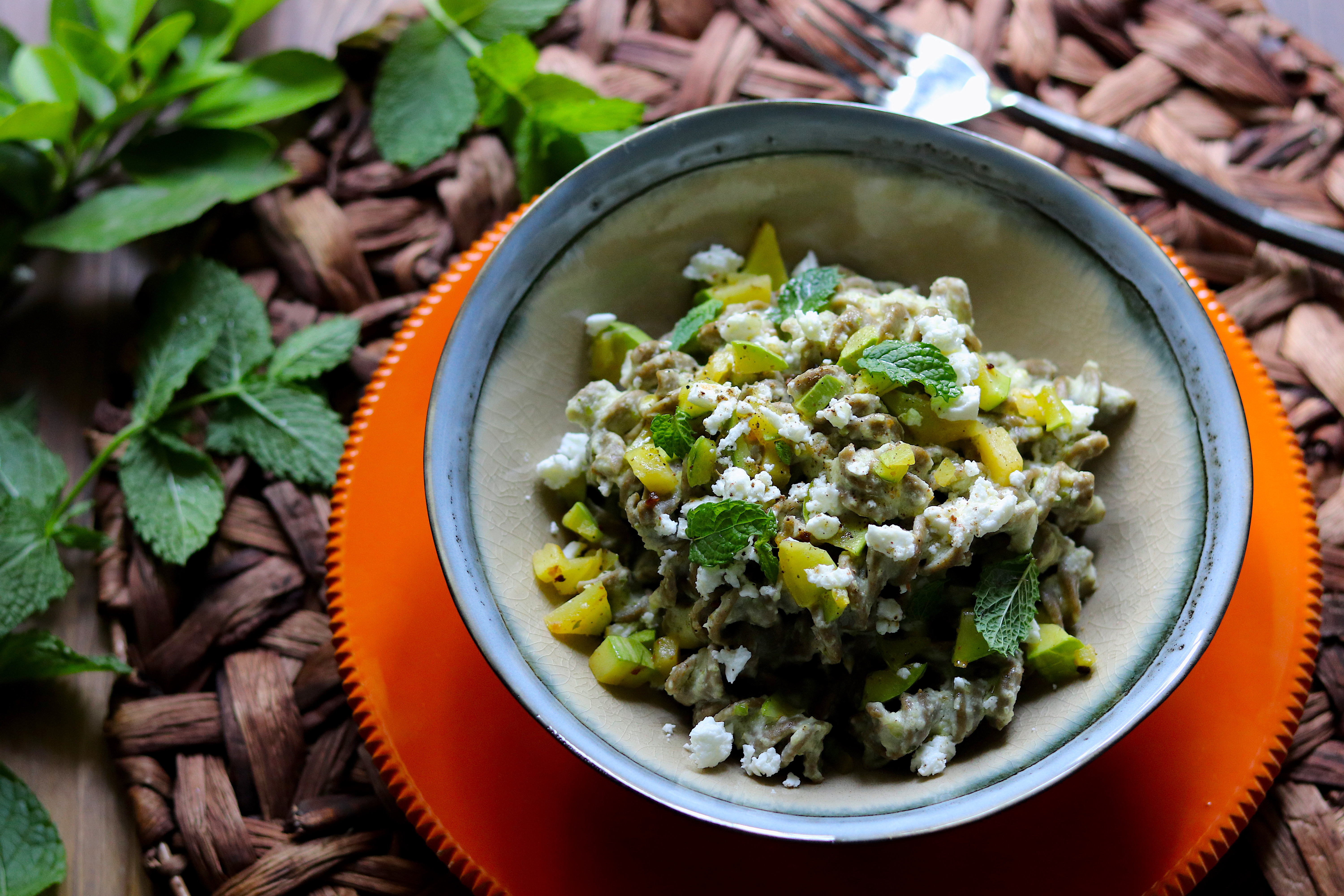 FUSILLI DI FARRO ALL’ORTICA CON FETA E MENTA. Piatto vegetariano