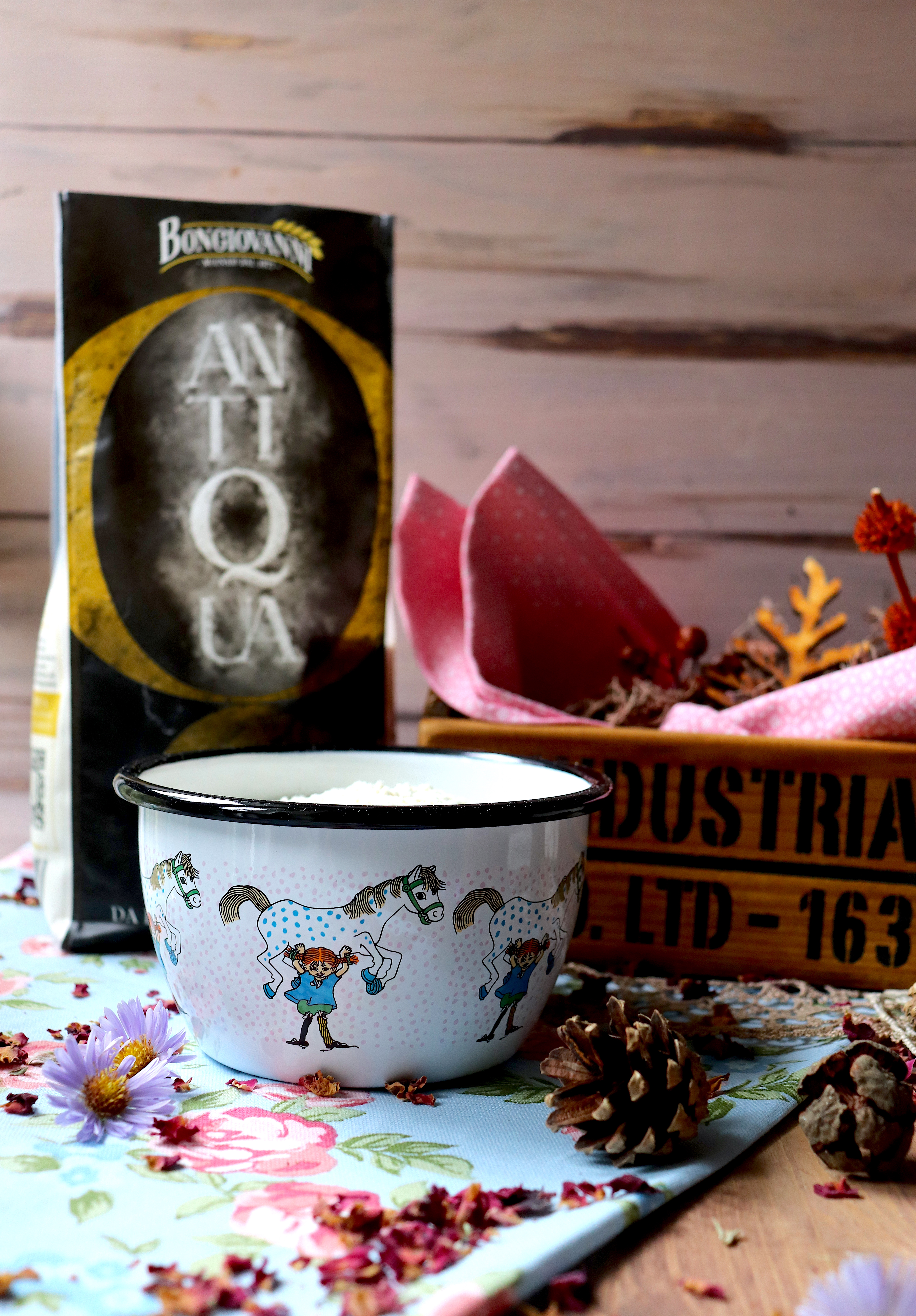 250 g di farina Antiqua Tipo 2 con cereali; 80 g di farina integrale Antiqua; 1 cucchiaio di miele; 300 ml di acqua a temperatura ambiente; 12.5 g di pasta madre disidratata con lievito Biosun;; 2 cucchiai di panna fresca + 1 per cuocere; 1 pizzico di sale; 1 cucchiaio di petali di rosa secchi eduli + 1/2 cucchiaio per decorare