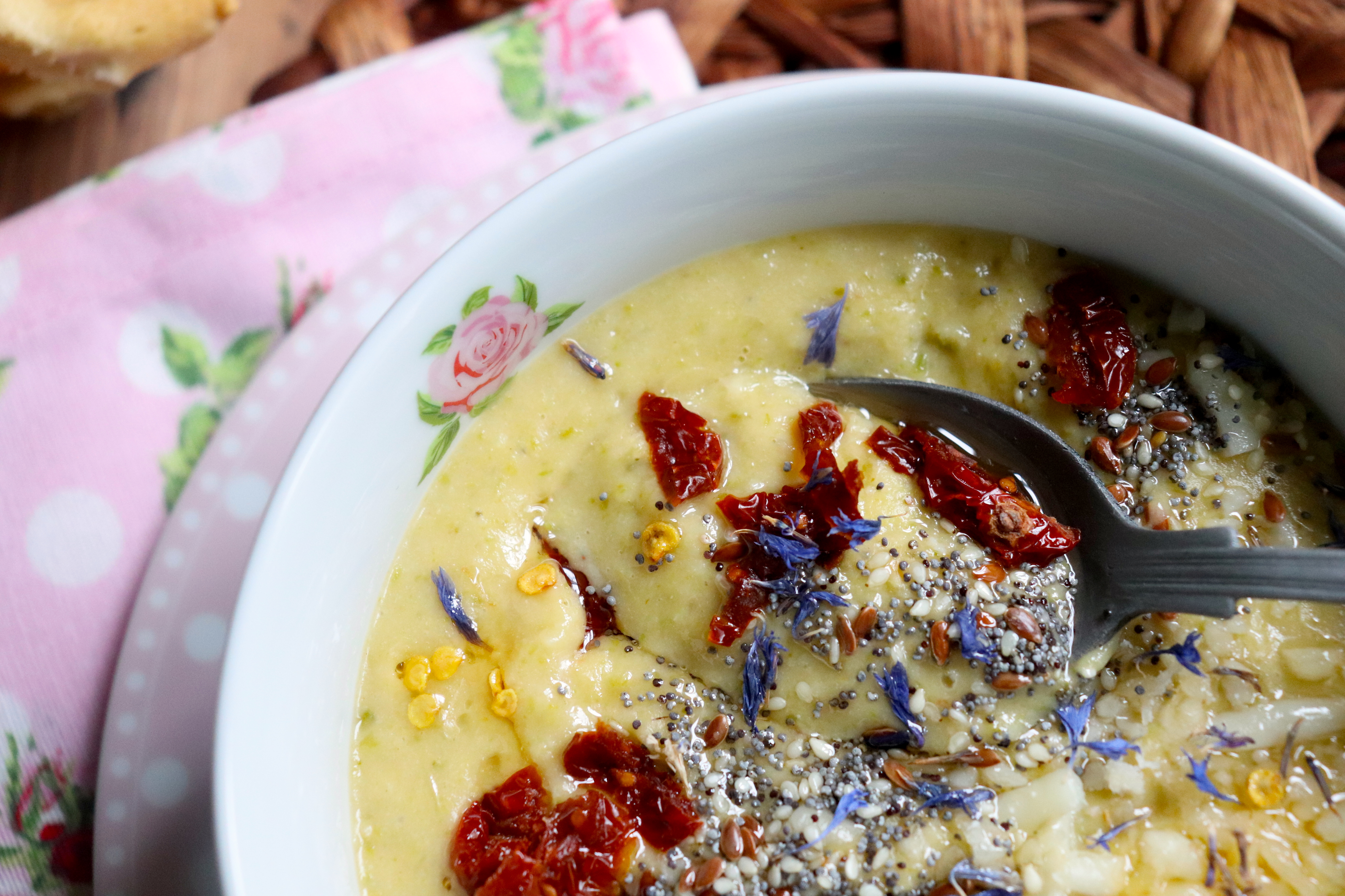 Allora ecco una bella zuppa confort a base di cavolfiore e decorata con un trito di pomodorini secchi siciliani.