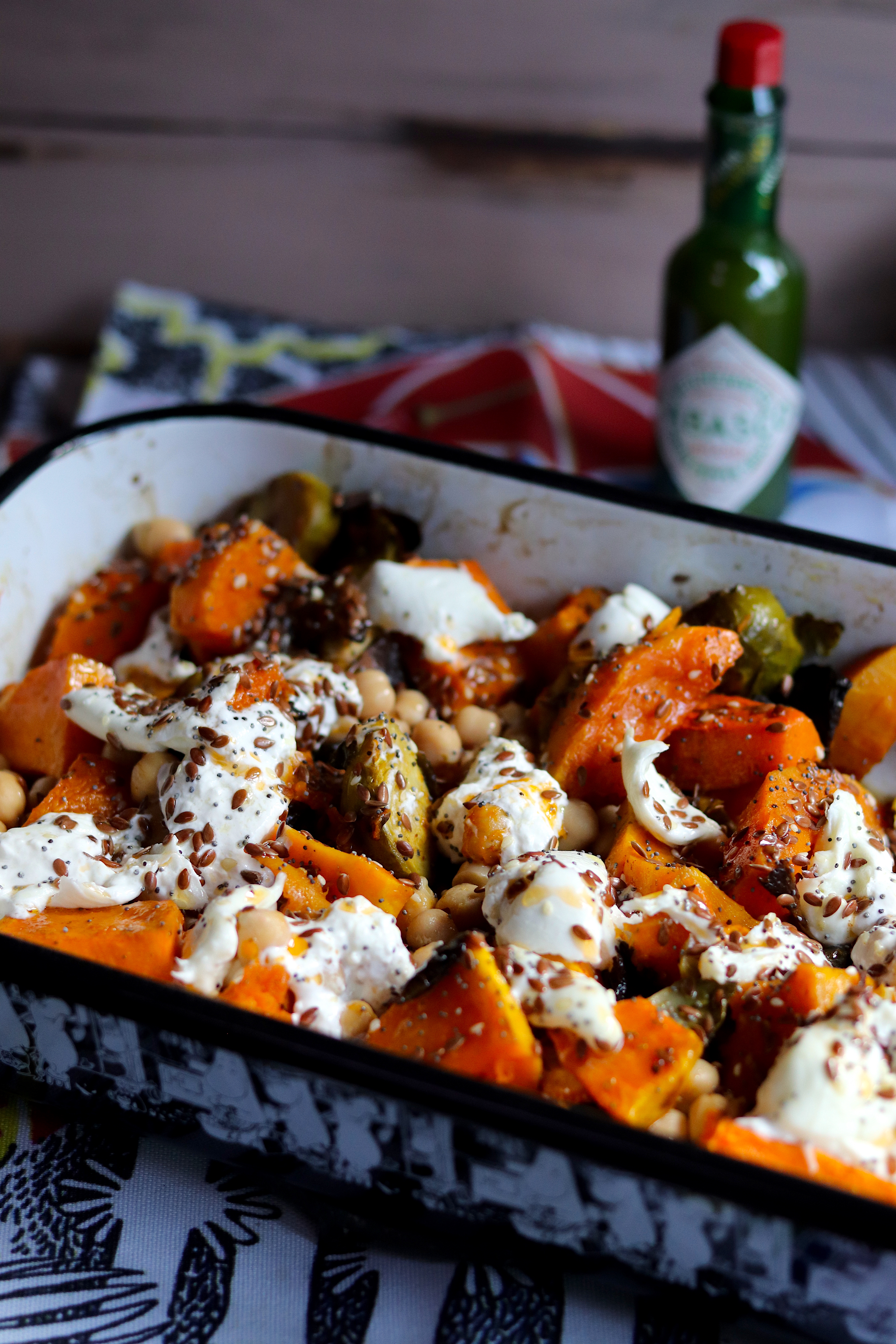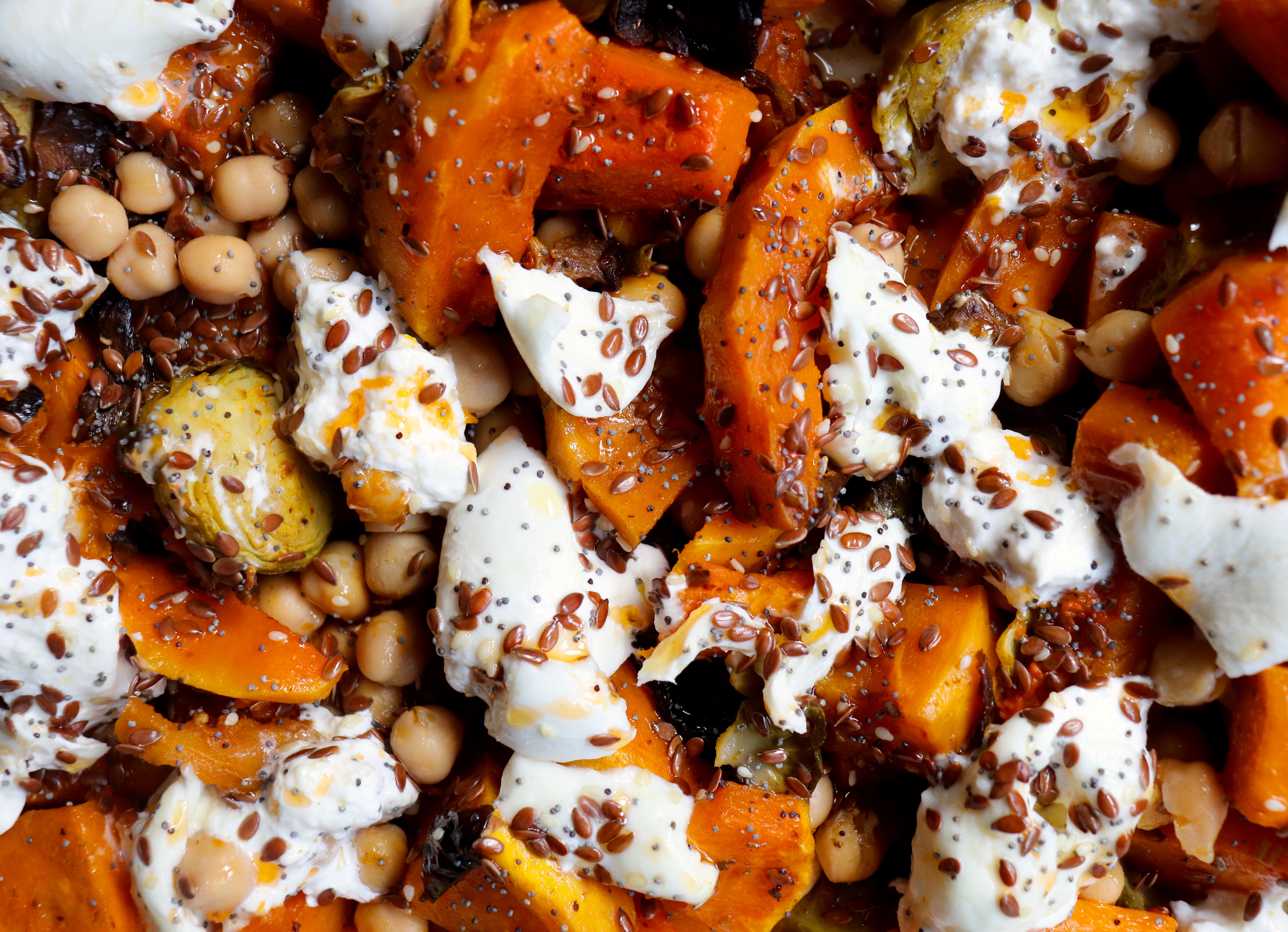 ZUCCA AL FORNO CON CECI, BURRATA E TABASCO. Piatto vegetariano