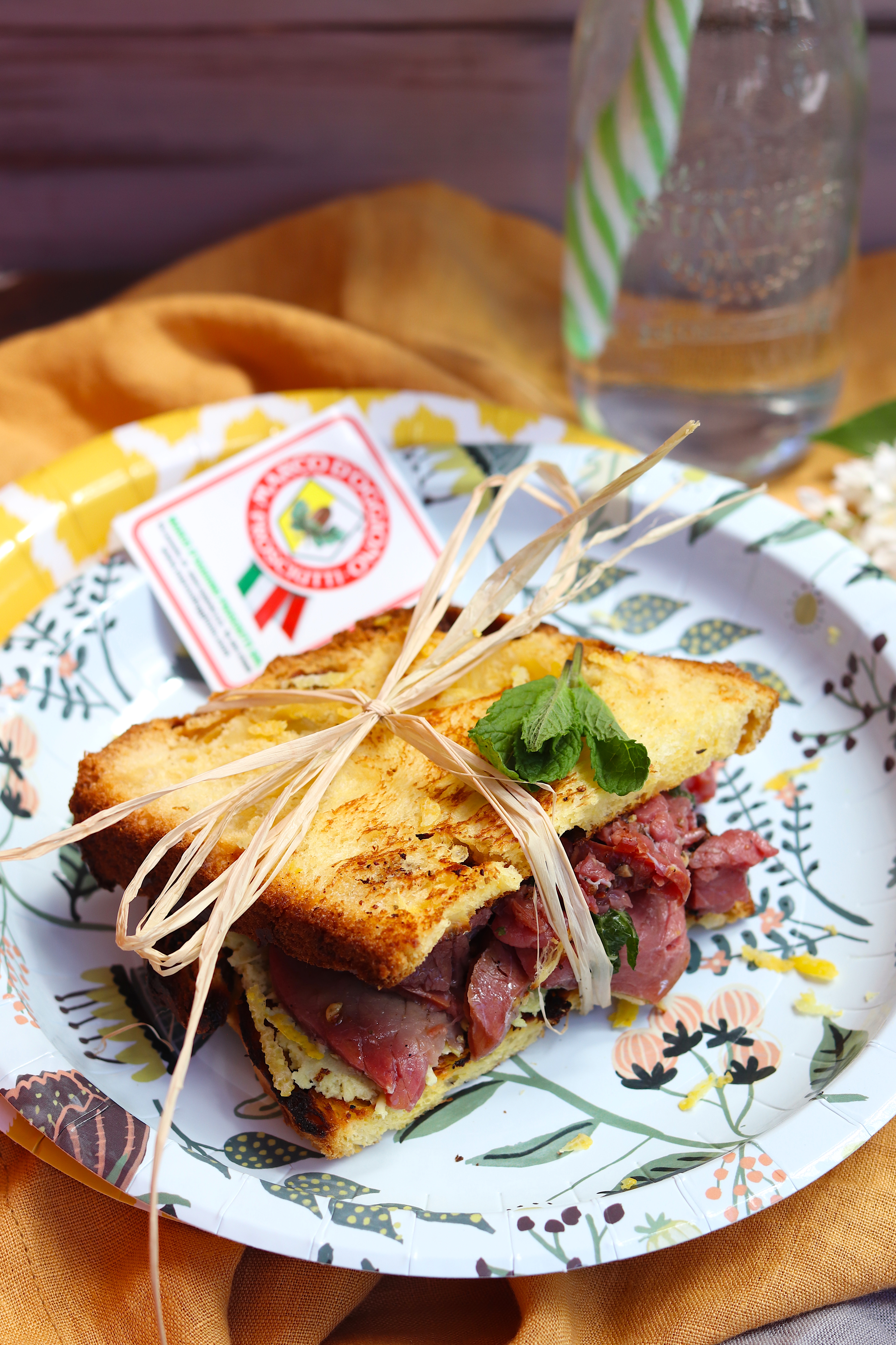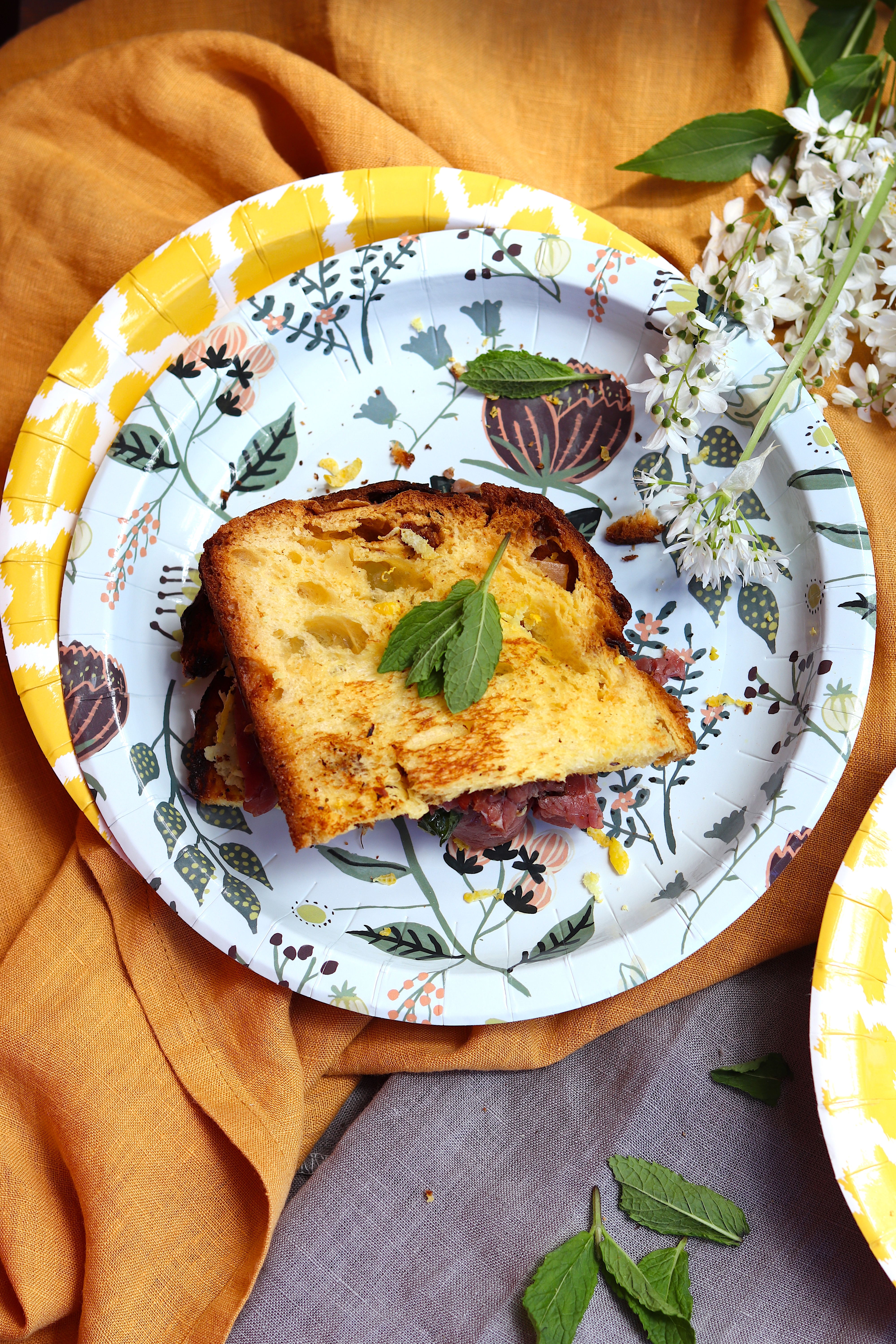E poi c’è lui, il MIO personalissimo Croque. Preparato con deliziosefette di panettone leggermente tostate nel burro, del carpaccio di chianina così buono, fresco, saporito che lo mangereste perfino a colazione. E poi la mia amata crema di fave marchigiana, a metà strada tra il dolce del panettone e il salato della chianina. Insomma, un Croque perfetto!