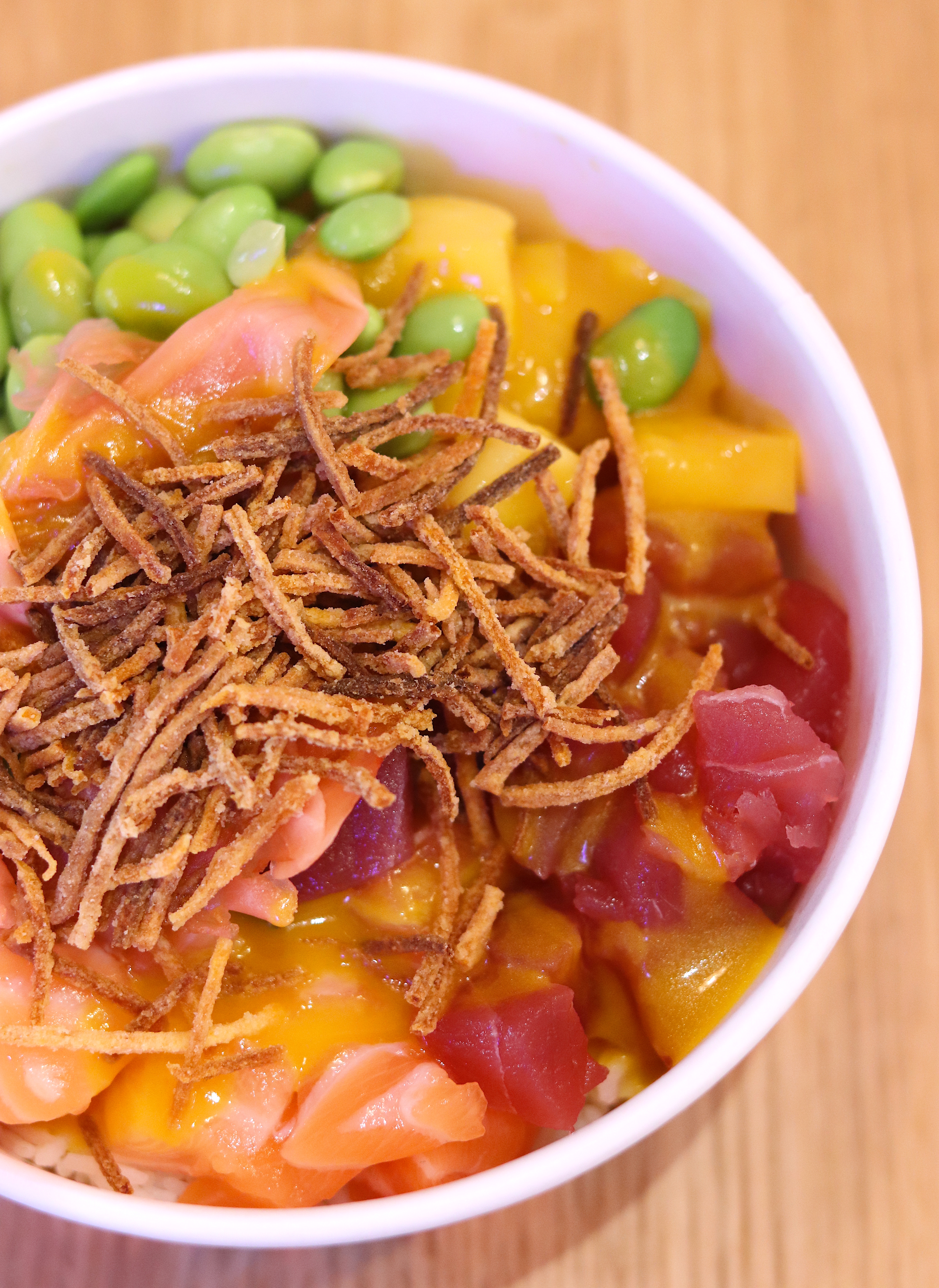 LA MIA POKE. Scelta da me con i consigli dei ragazzi di Poke House: riso integrale, riso basmati, salmone e tonno crudi, edamame, pink ginger, mango, alghe, salsa mango, crispy patate dolce.