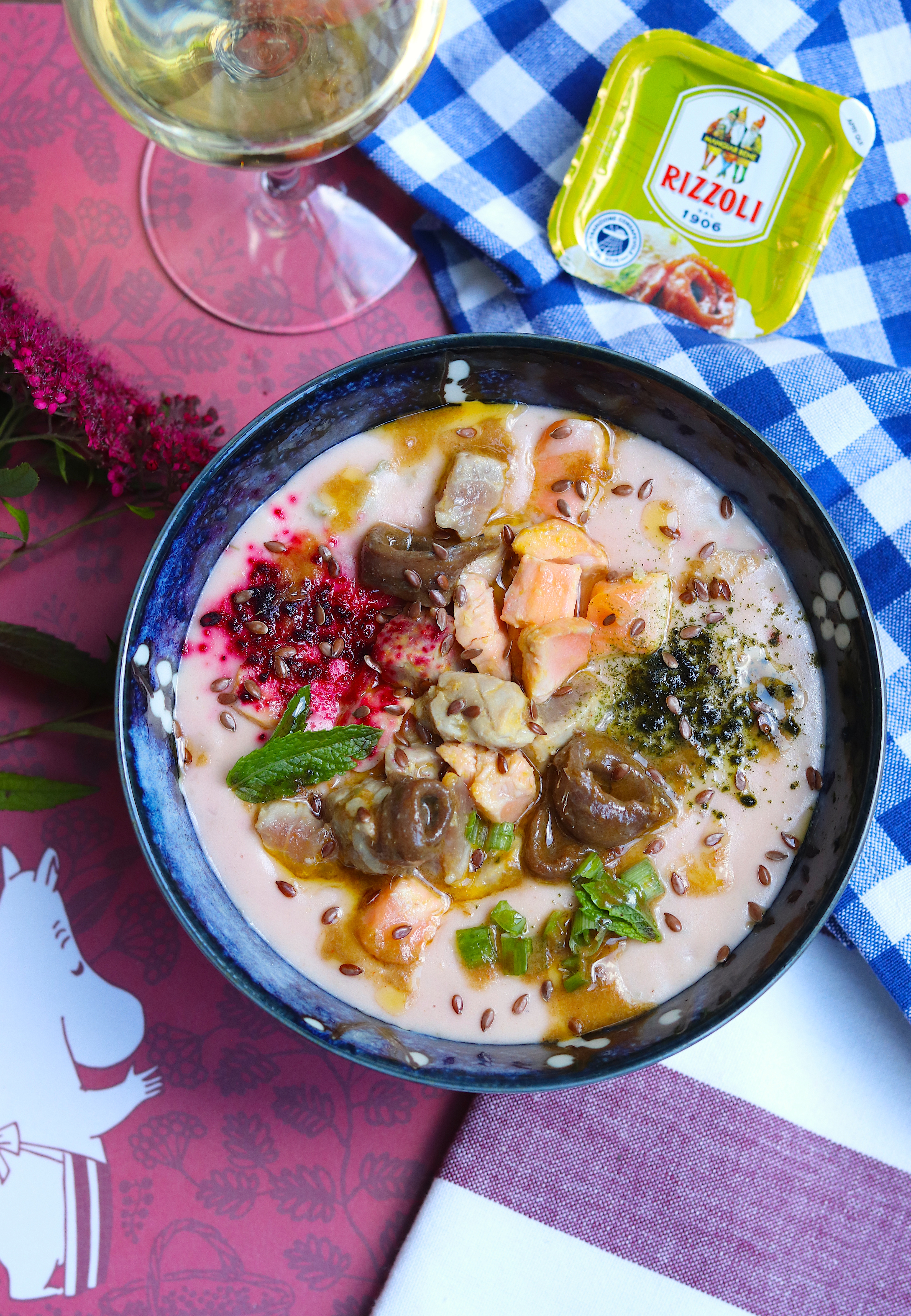 - Trasferite la zuppa nelle ciotole, aggiungete i cubetti di tonno e salmone, le alici arrotolate, qualche cucchiaino di spinacio e barbabietola e i semi di lino. Finite con un giro di extravergine e qualche fogliolina di menta (anche quello delle alici se desiderate un sapore più deciso).
