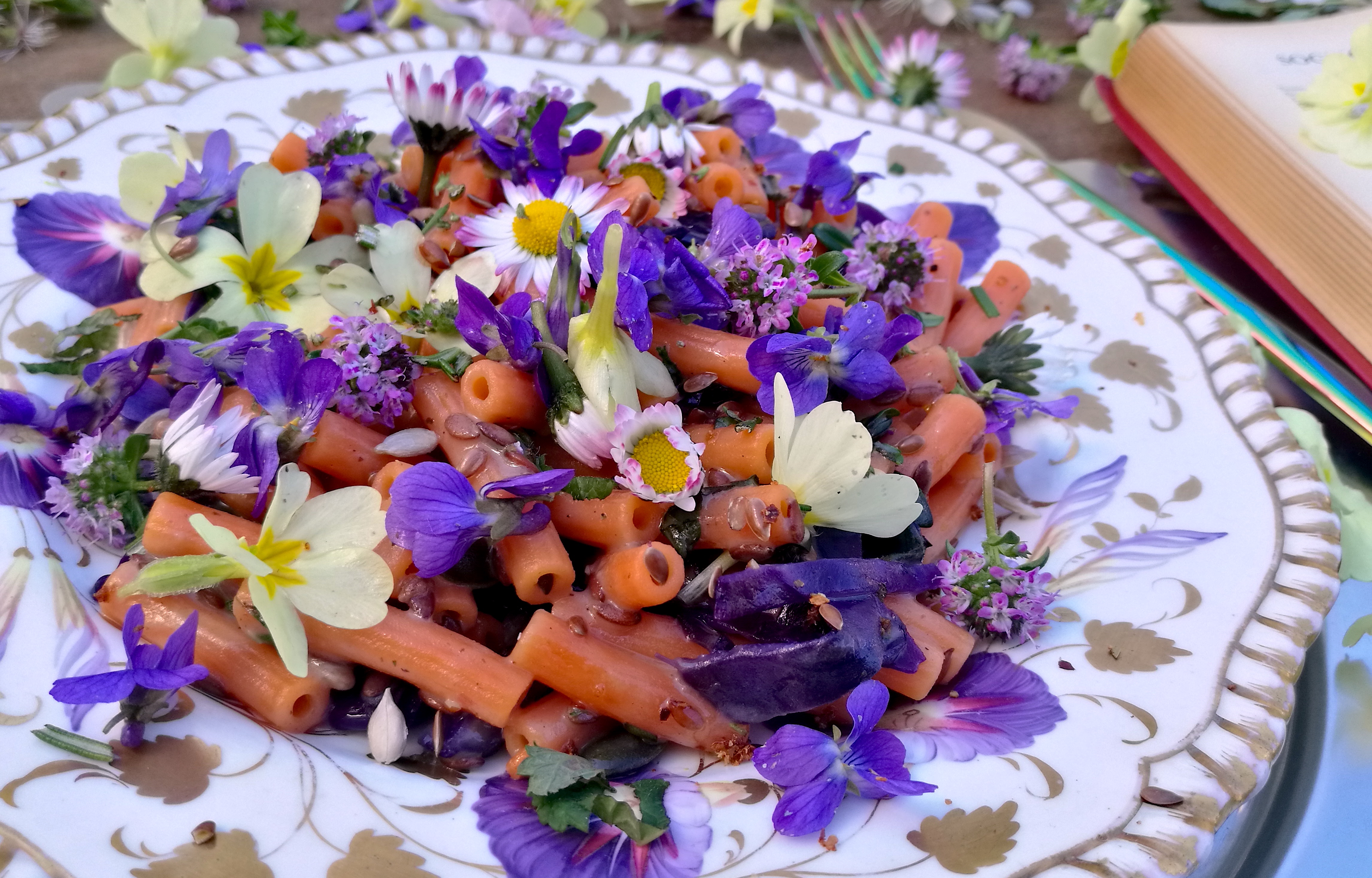 Fermiamoci un attimo a osservare questo piatto e ci renderemo che potremo “mangiare i colori”. È infatti una tavolozza che vede l’arancio, il verde e il nero protagonisti visivi, all’insegna di un equilibrio nel bilanciamento delle due tinte secondarie squillanti, con il nero. Il nero, in questo caso, dato dal pigmento della pasta spirulina, costituisce il non-colore di sfondo, l’opposto di compensazione al contrasto energetico dell’arancio e del verde. Questi, simboli il primo della vitalità suprema e il massimo dell’energia, il secondo dell’inno alla natura e alla stagione dei germogli, sono l’allegoria del risveglio e della bellezza, le note armoniche e musicali di un piatto che intende esaltare, con un tocco di artisticità, l’energia dei due colori più vitali e vitaminici.