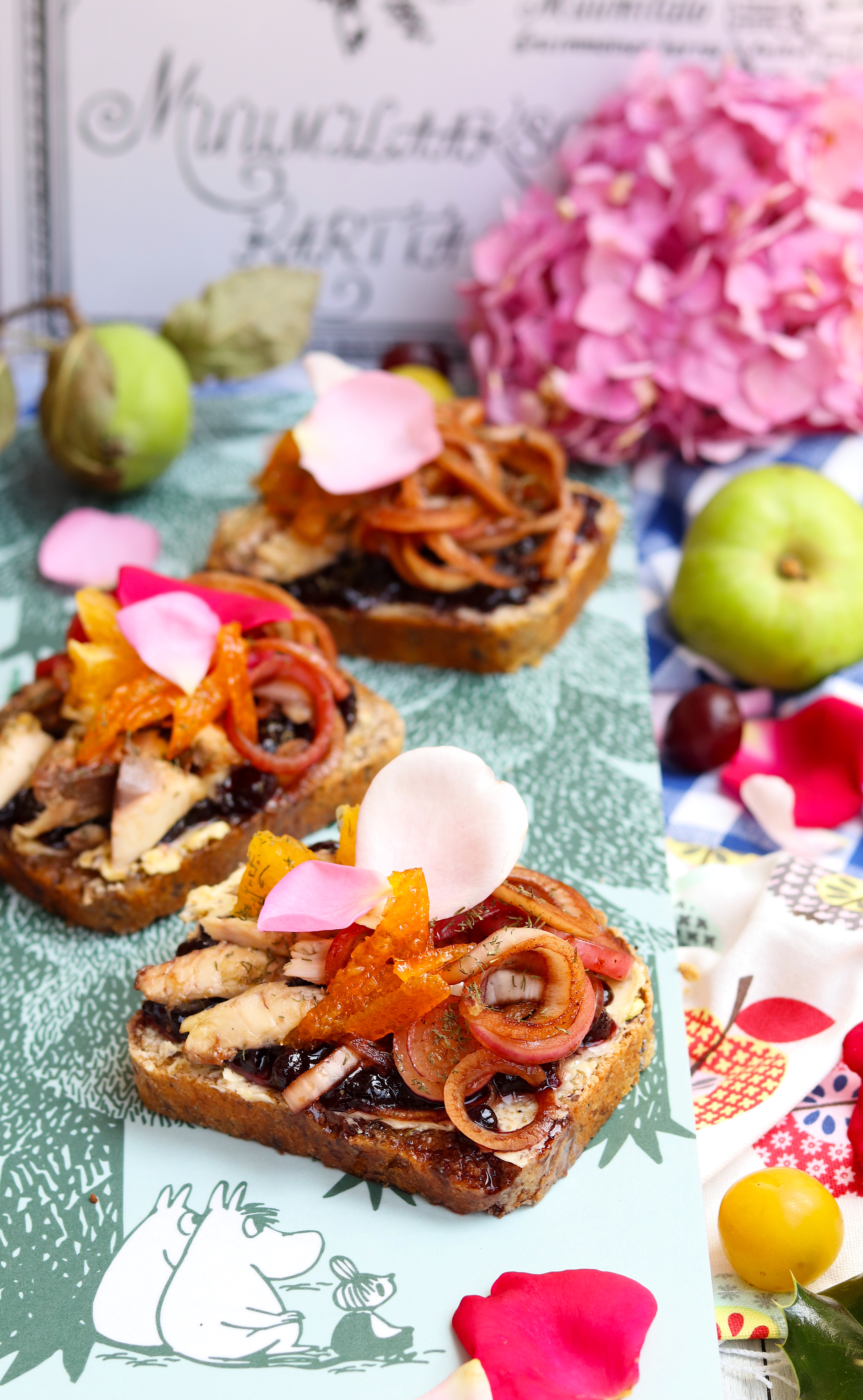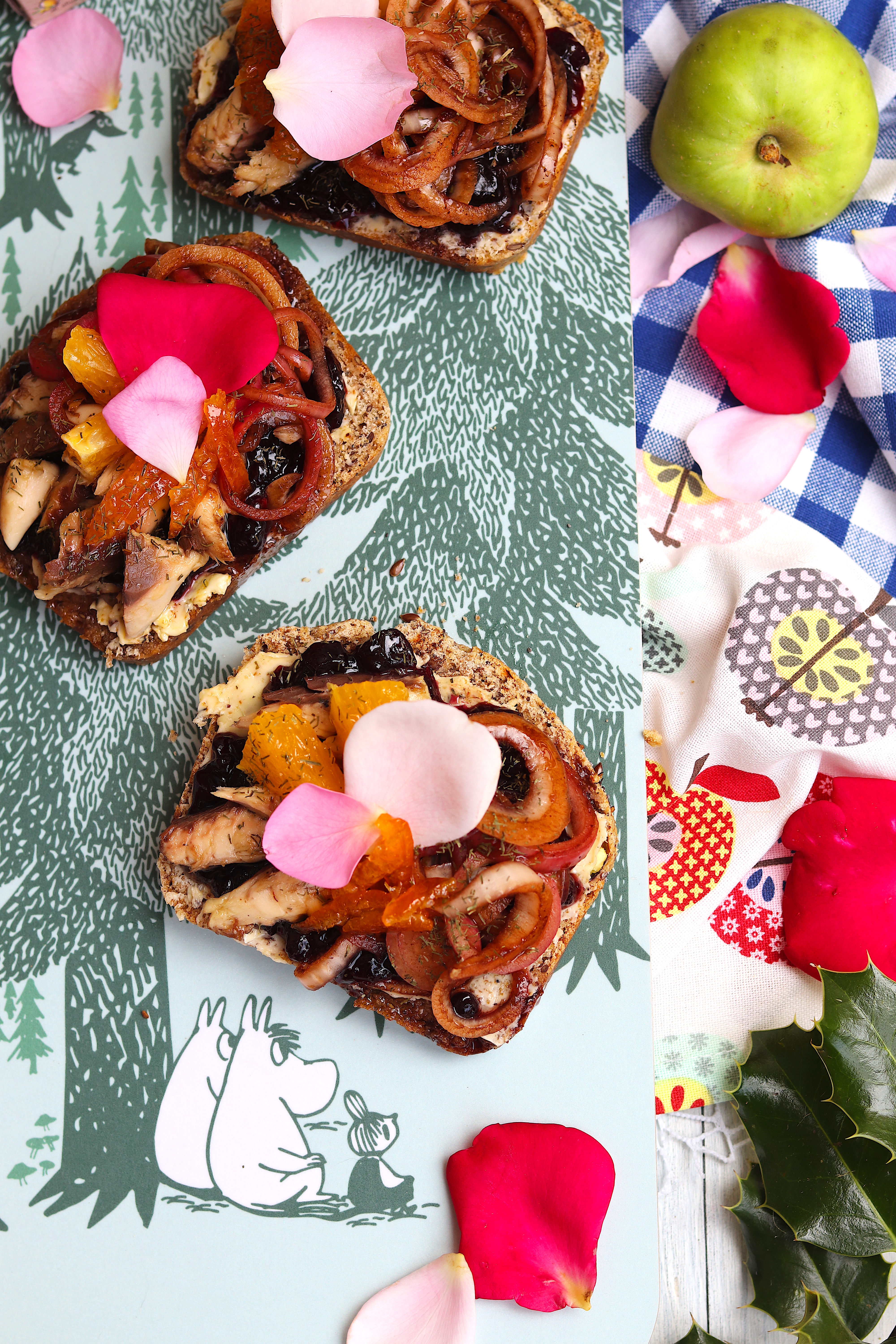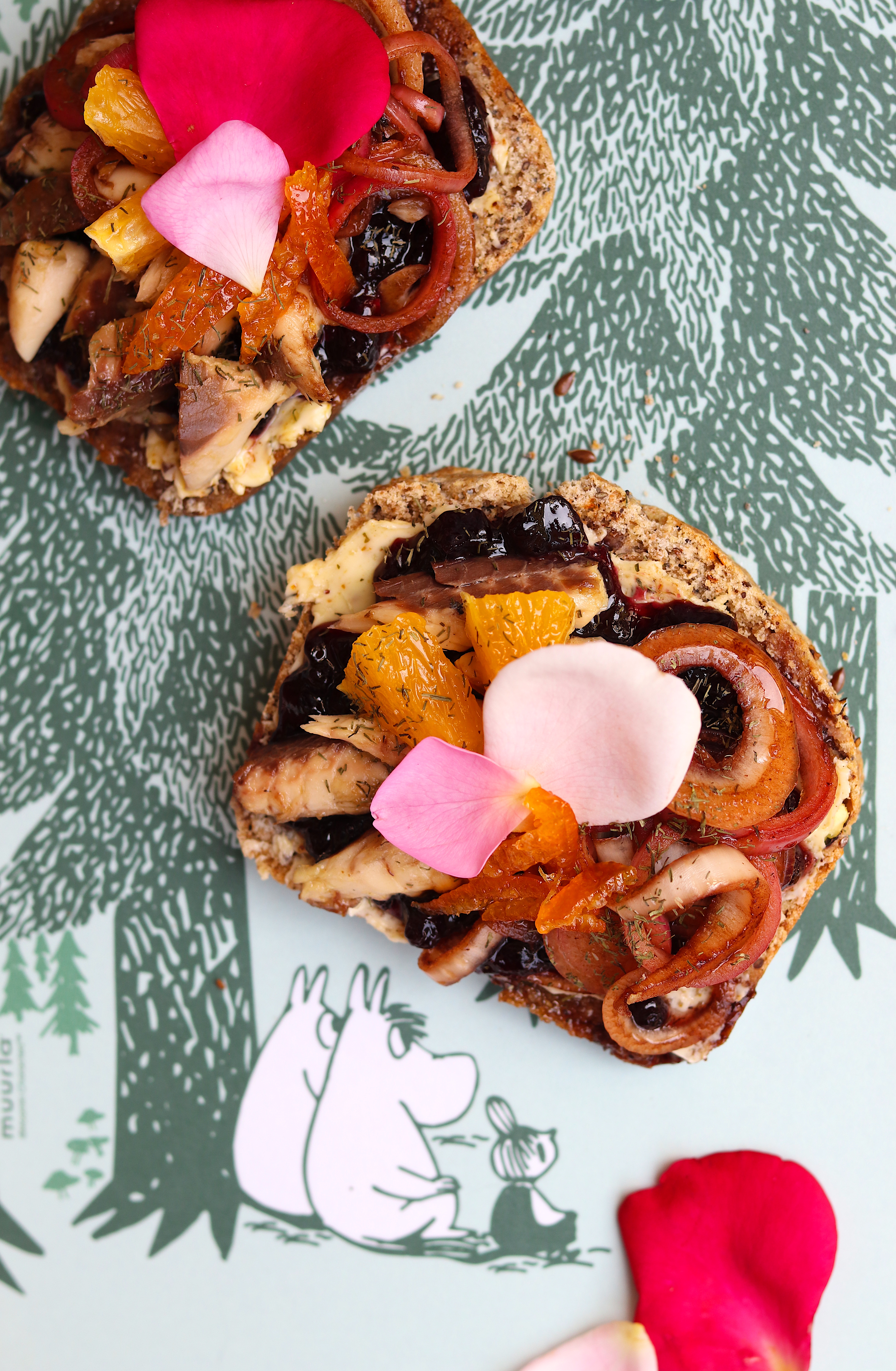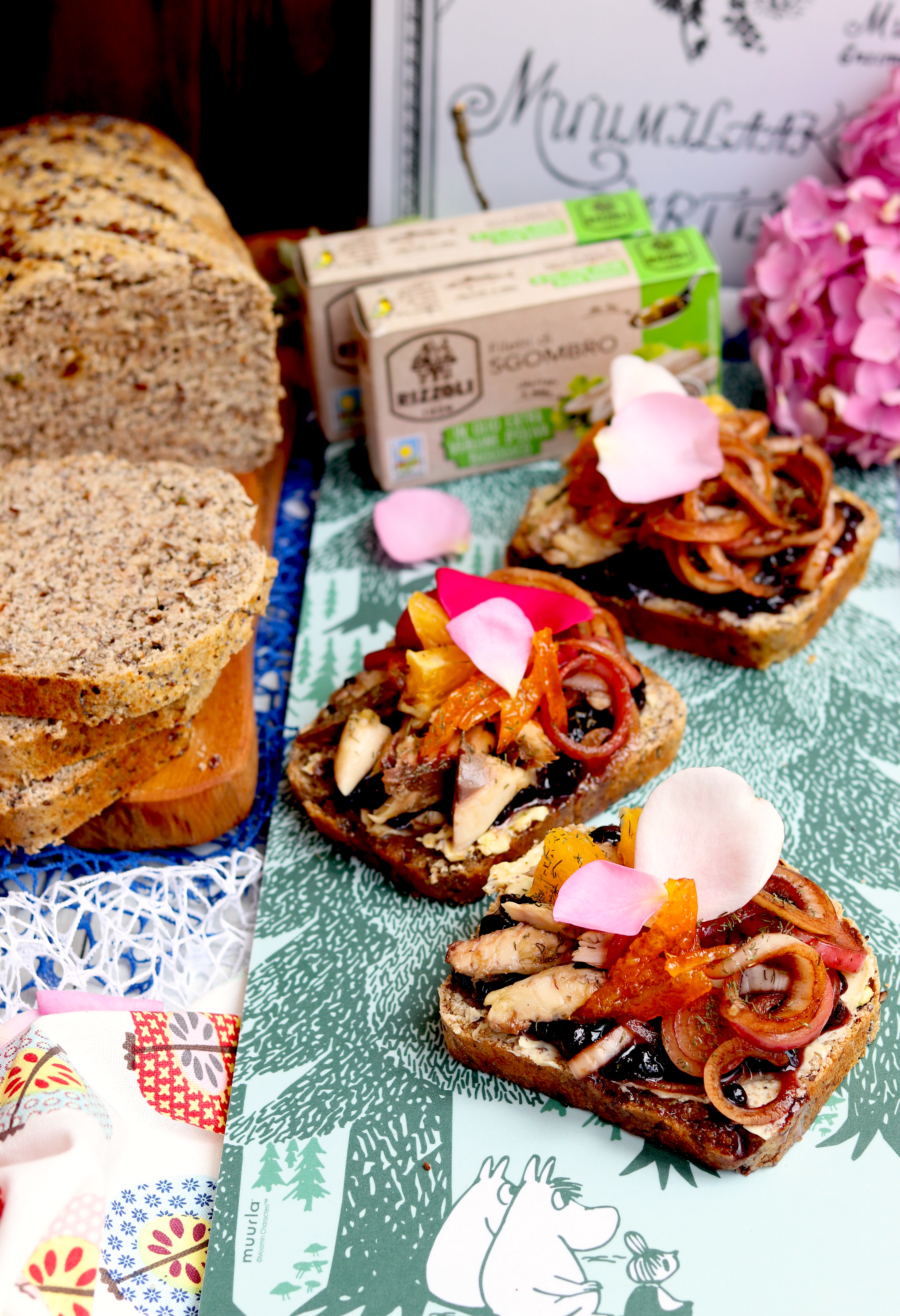 SMØRREBRØD CON FILETTI DI SGOMBRO IN OLIO EVO BIO, CIPOLLE IN AGRODOLCE E SCORZE DI MANDARINO CONFIT
