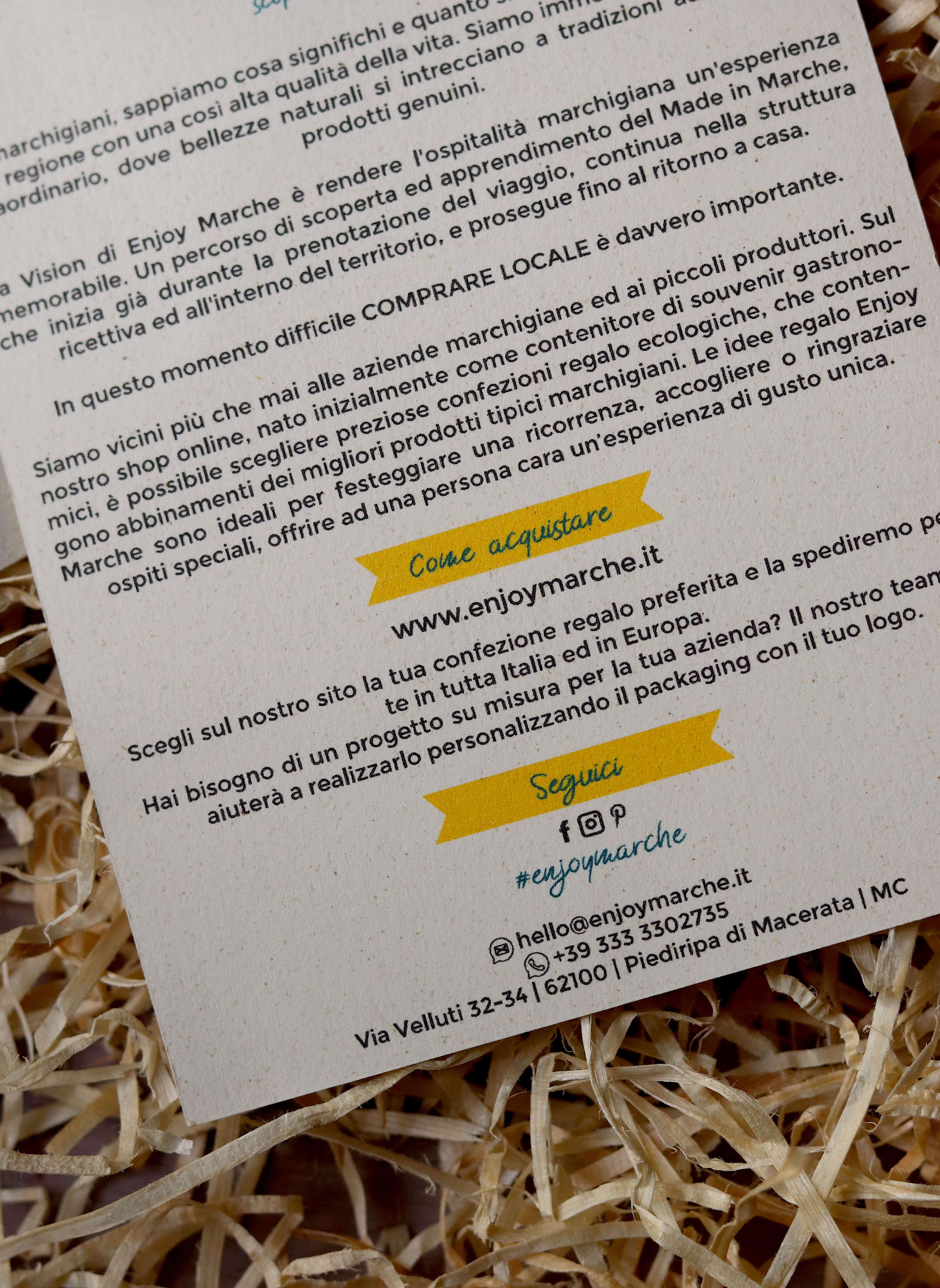 I prodotti tipici sono anche abbinati a cultura ed artigianato locale. Nelle bag sono infatti contenuti libri sulle Marche e materiale informativo per prenotare esperienze nelle botteghe degli artigiani locali.