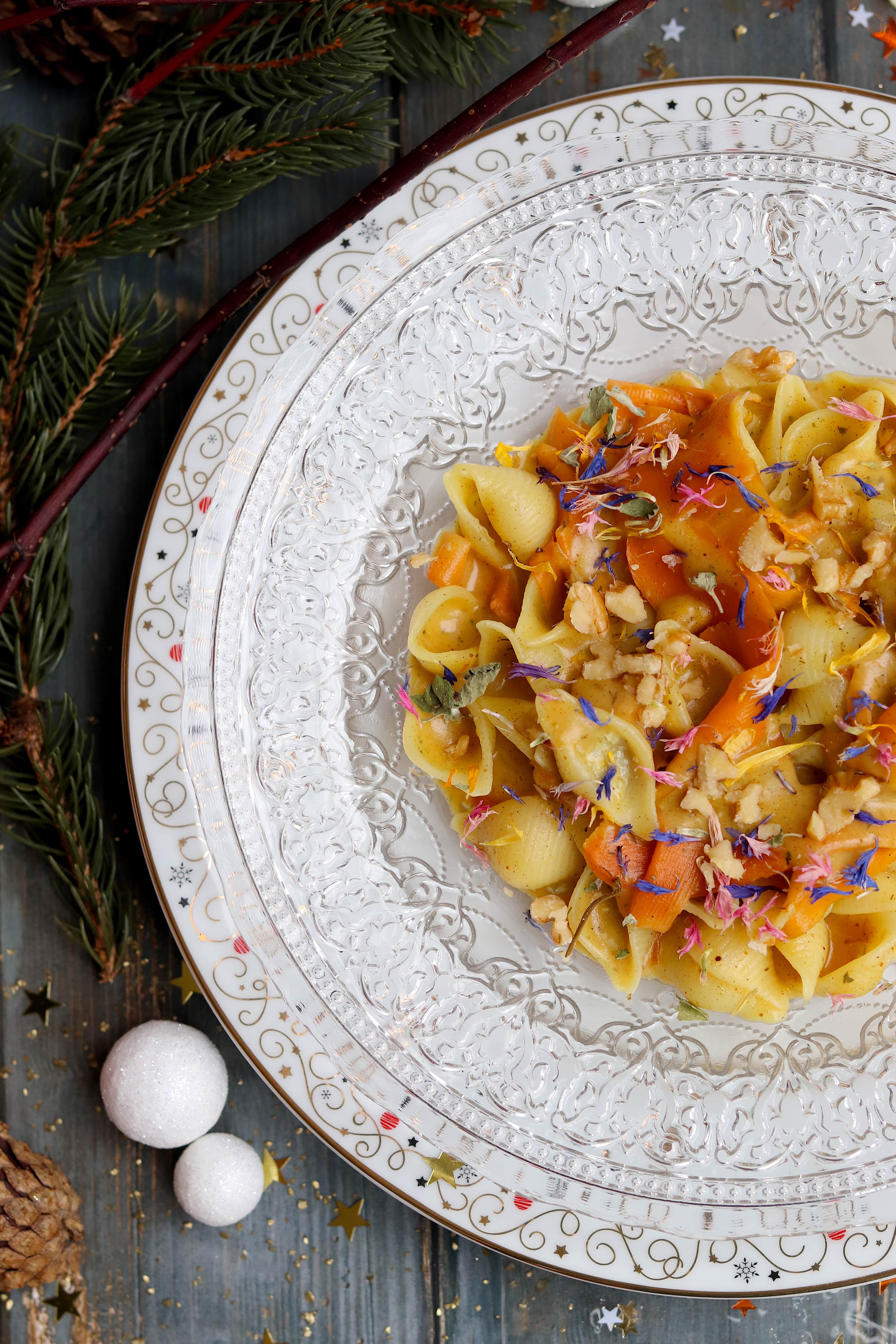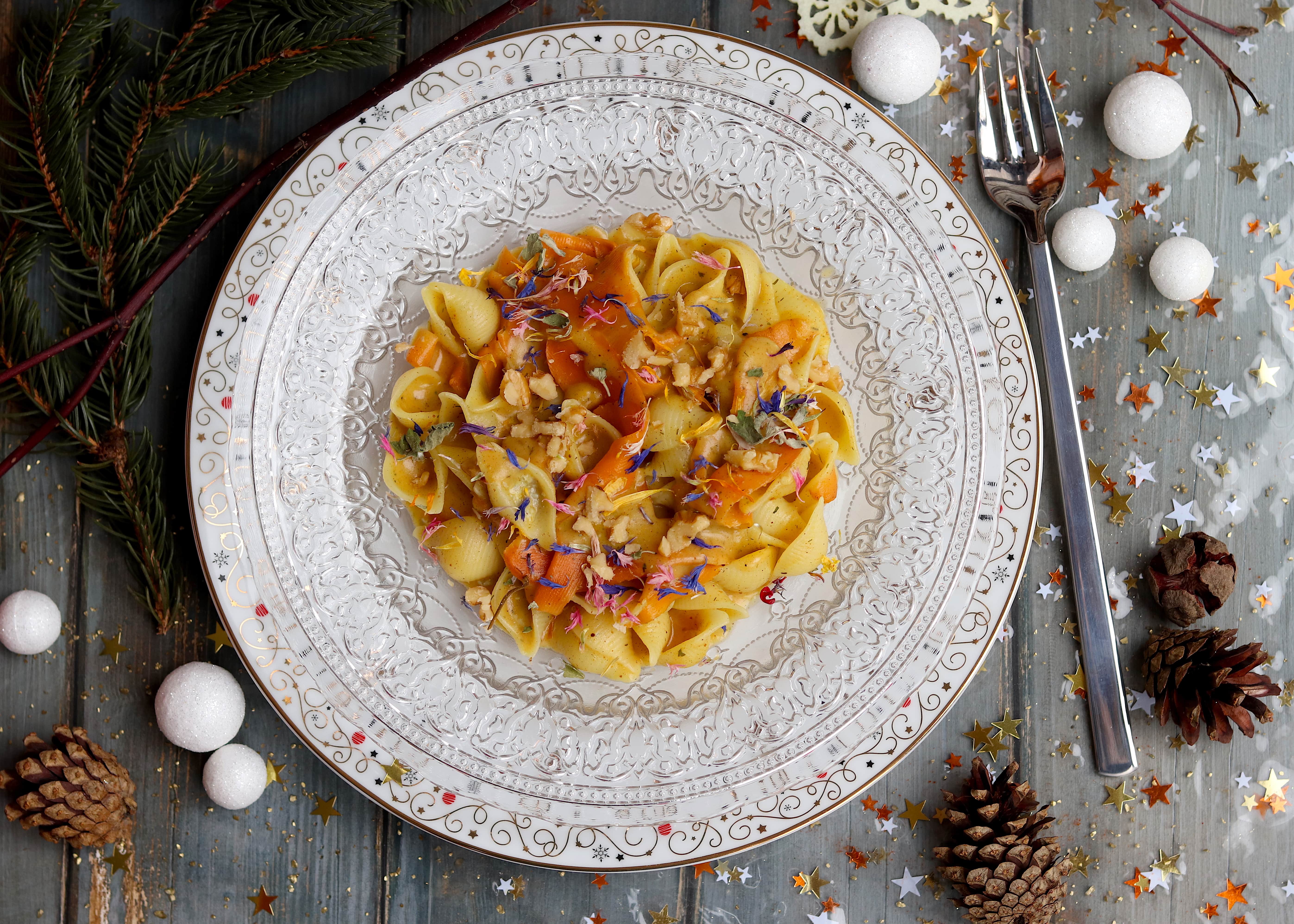 CONCHIGLIE AL MAIS BIANCO CON GORGONZOLA, CAROTE E CANNELLA. Piatto senza glutine e vegetariano