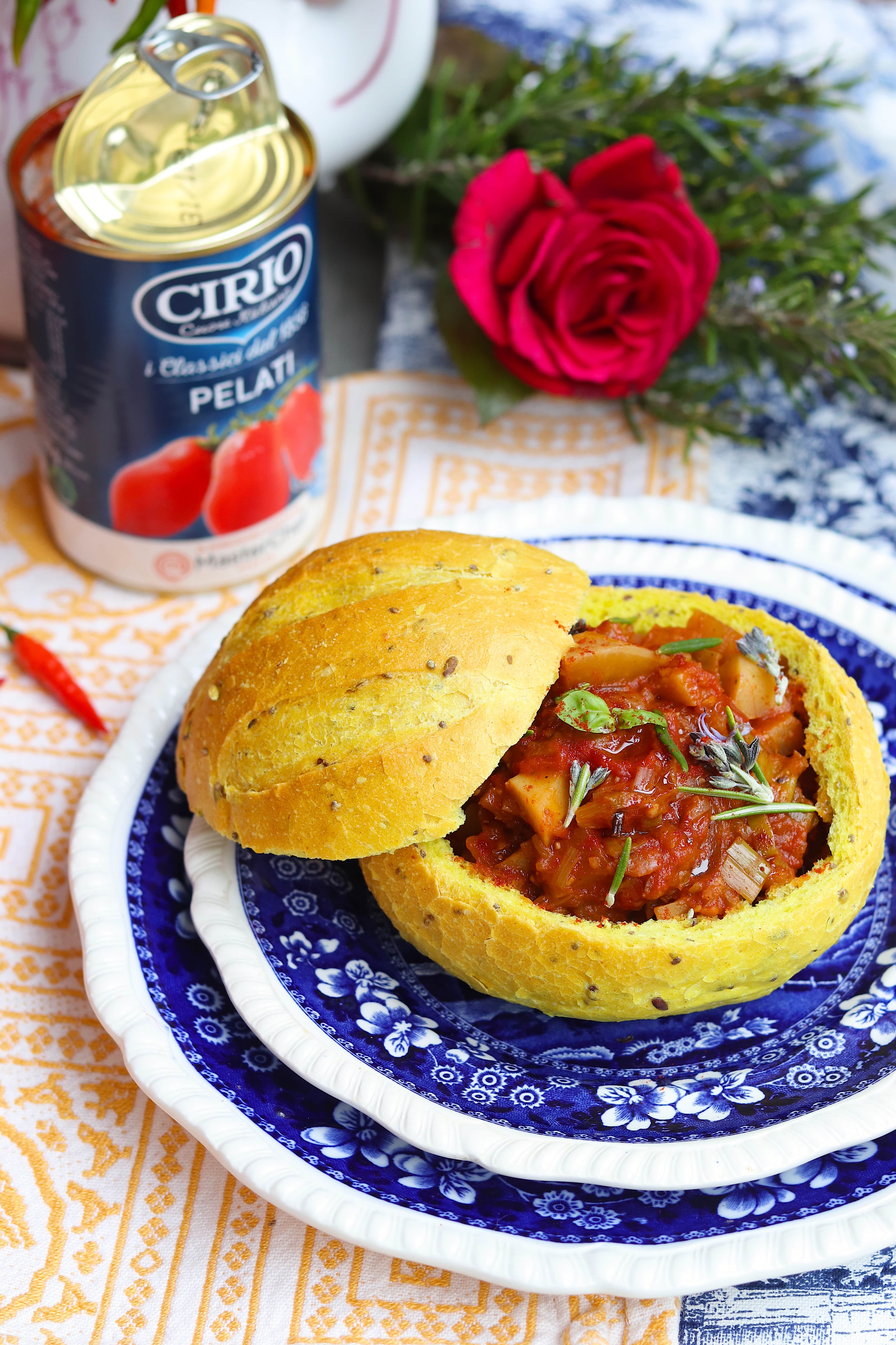 Allora prendiamo una pagnotta di pane, la svuotiamo e la trasformiamo in un piatto per servire uno speciale gulash ungherese in versione veg.