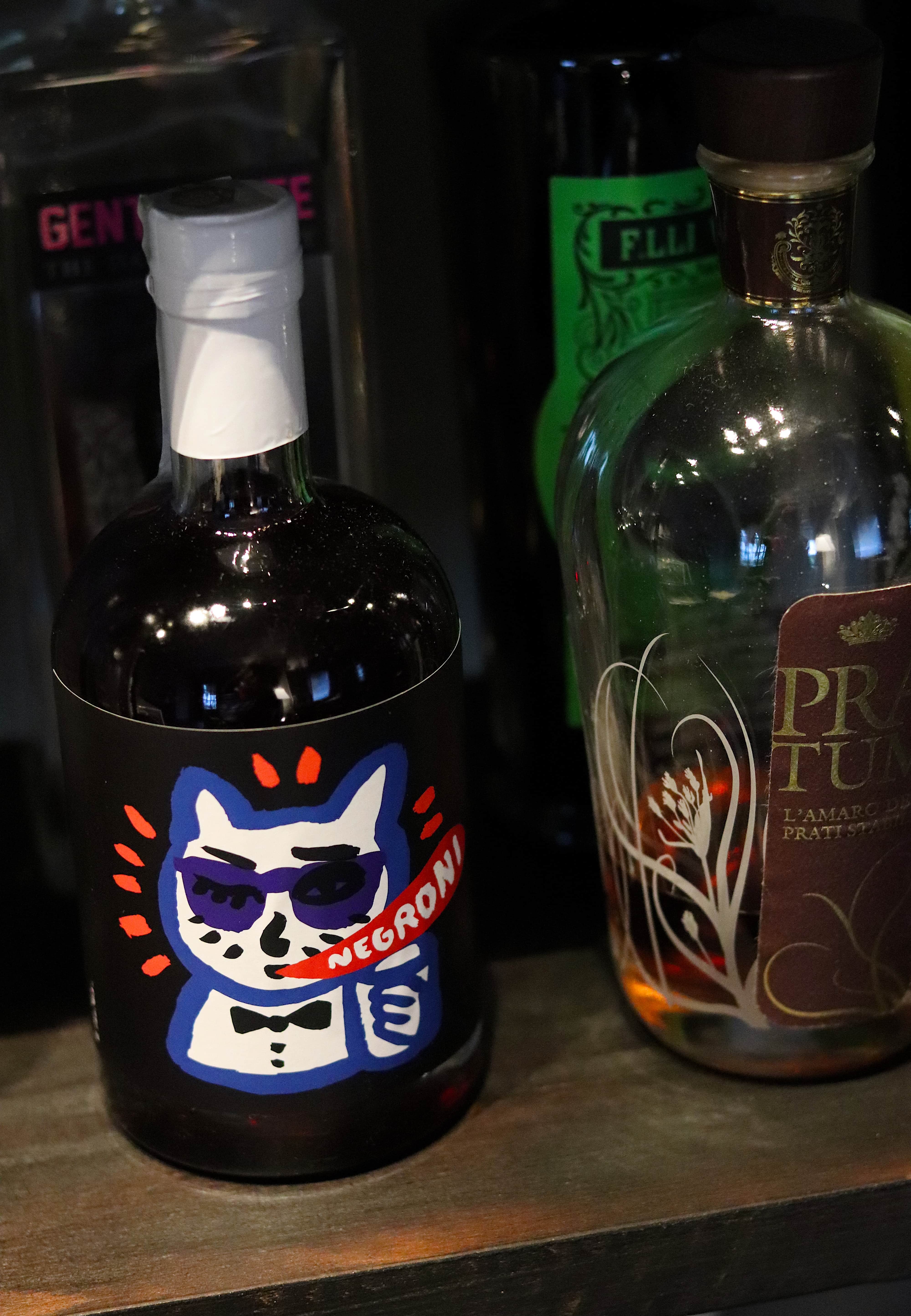 Anche loro fanno parte del linguaggio: sono del creativo Gianluca Cannizzo ed esprimono al massimo l’anima più nascosta di ogni cocktail. Come il gatto in stile 007 del “cazzutissimo” Negroni (mi concedo la licenza poetica, ma anche voi lo definireste così…), o la seduttiva gatta sfinge del Boulevardier, o lui e lei nel Mi-To: torinese sofisticato lui, altezzosa milanese lei, “e qui – mi sorride il Mago – c’è anche un po’ l’anima dei miei due nonni”.