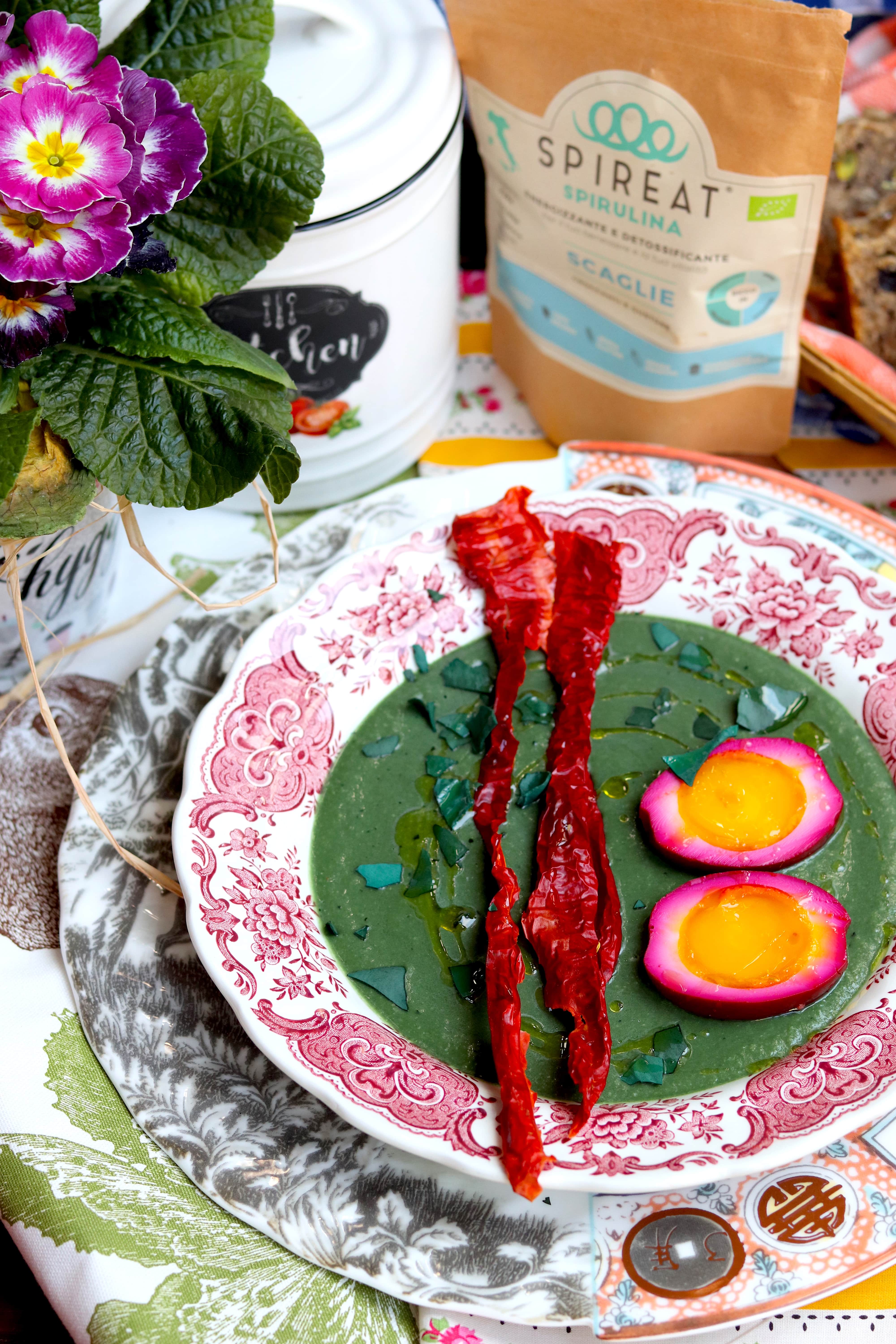 UOVA ROSA SU CREMA DI CECI ALLA SPIRULINA. Piatto vegetariano