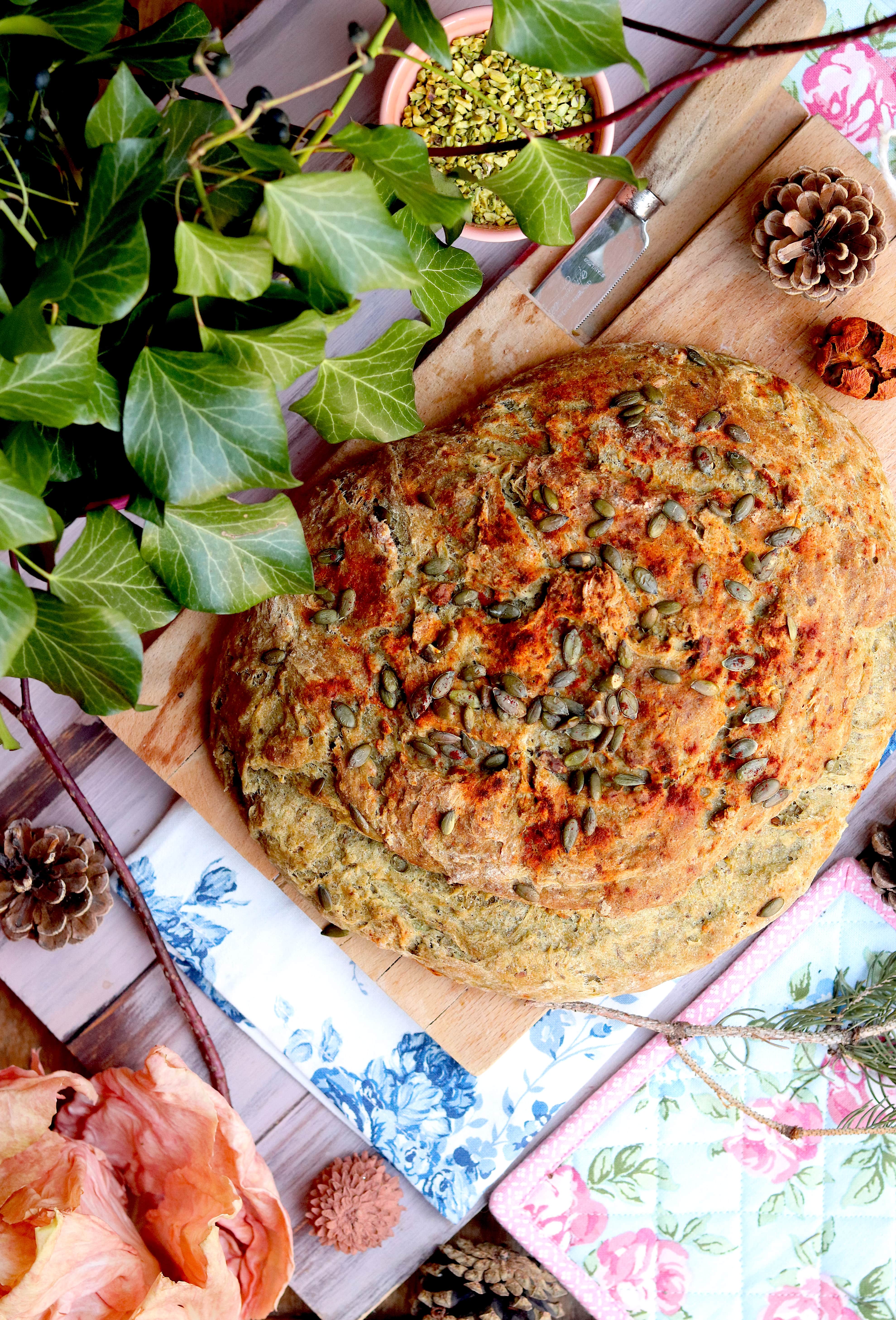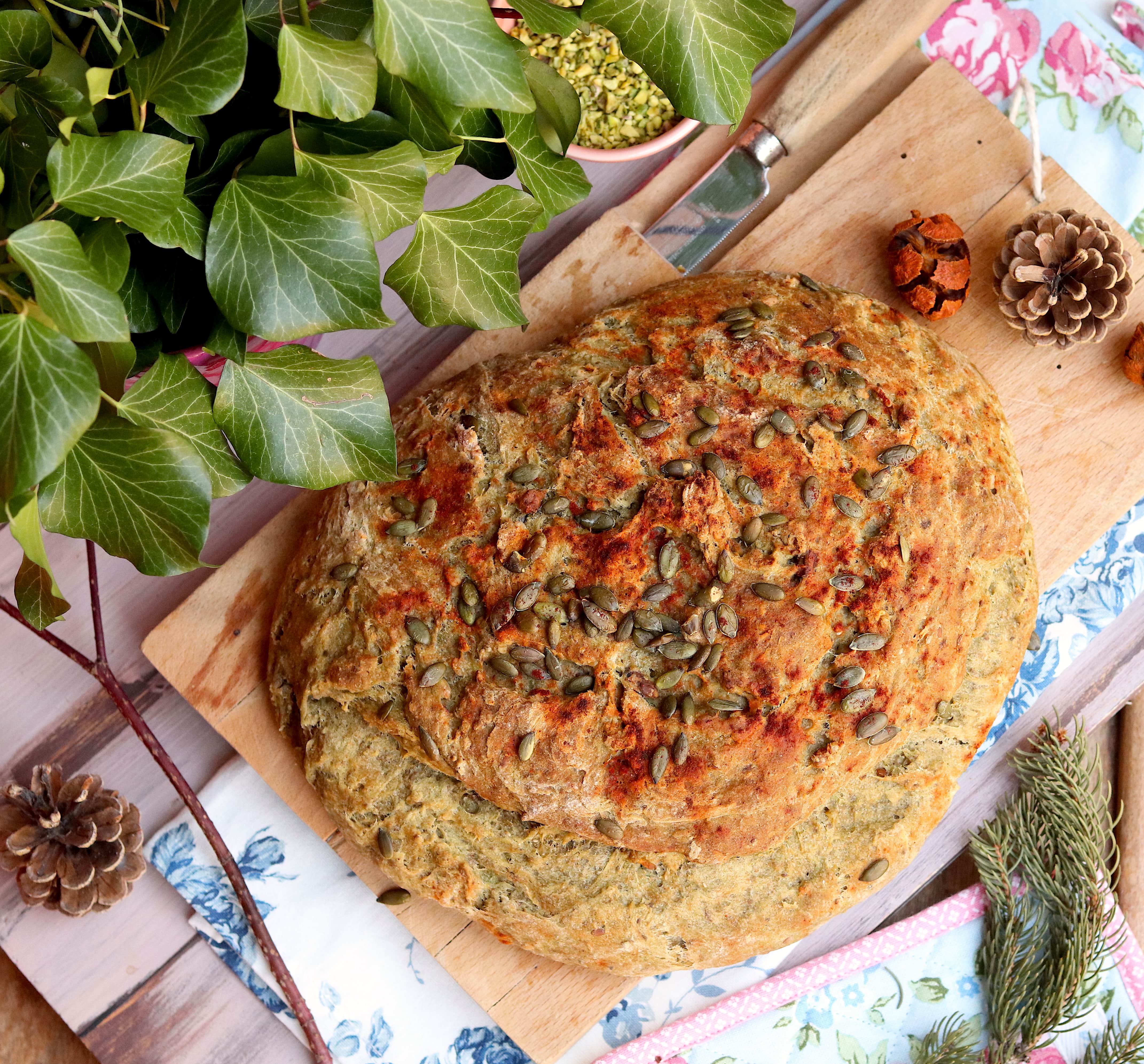 - Riprendete l’impasto, dategli la forma di una pagnotta, e ponetelo su una teglia rivestita di carta forno. Incidete sulla superficie del pane dei tagli, decorate con i semi e infornate a 200° per circa 30 minuti. Ricordatevi, durante la cottura, di inserire nel forno un pentolino pieno d’acqua.