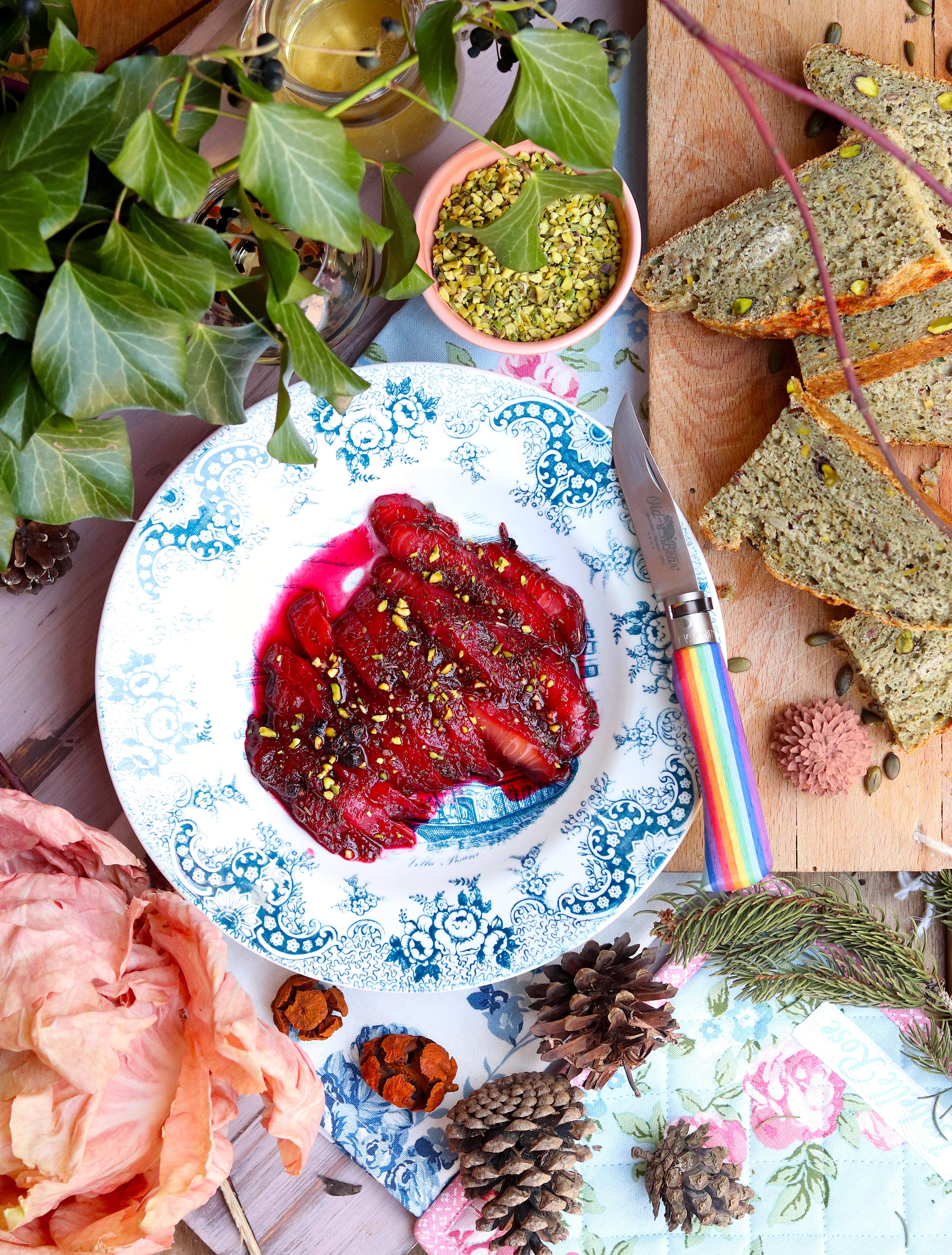 E allora preparo uno speciale salmone marinato in stile gravlax con barbabietola (qui la ricetta tradizionale) da servire come un tesoro su una fetta di pane al pistacchio. Perché la poesia va rivelata piano piano, svelandone i misteri e consegnandola agli occhi e al gusto, in un processo estetico che è conoscenza sensibile, fino alla bellezza, che è verità.