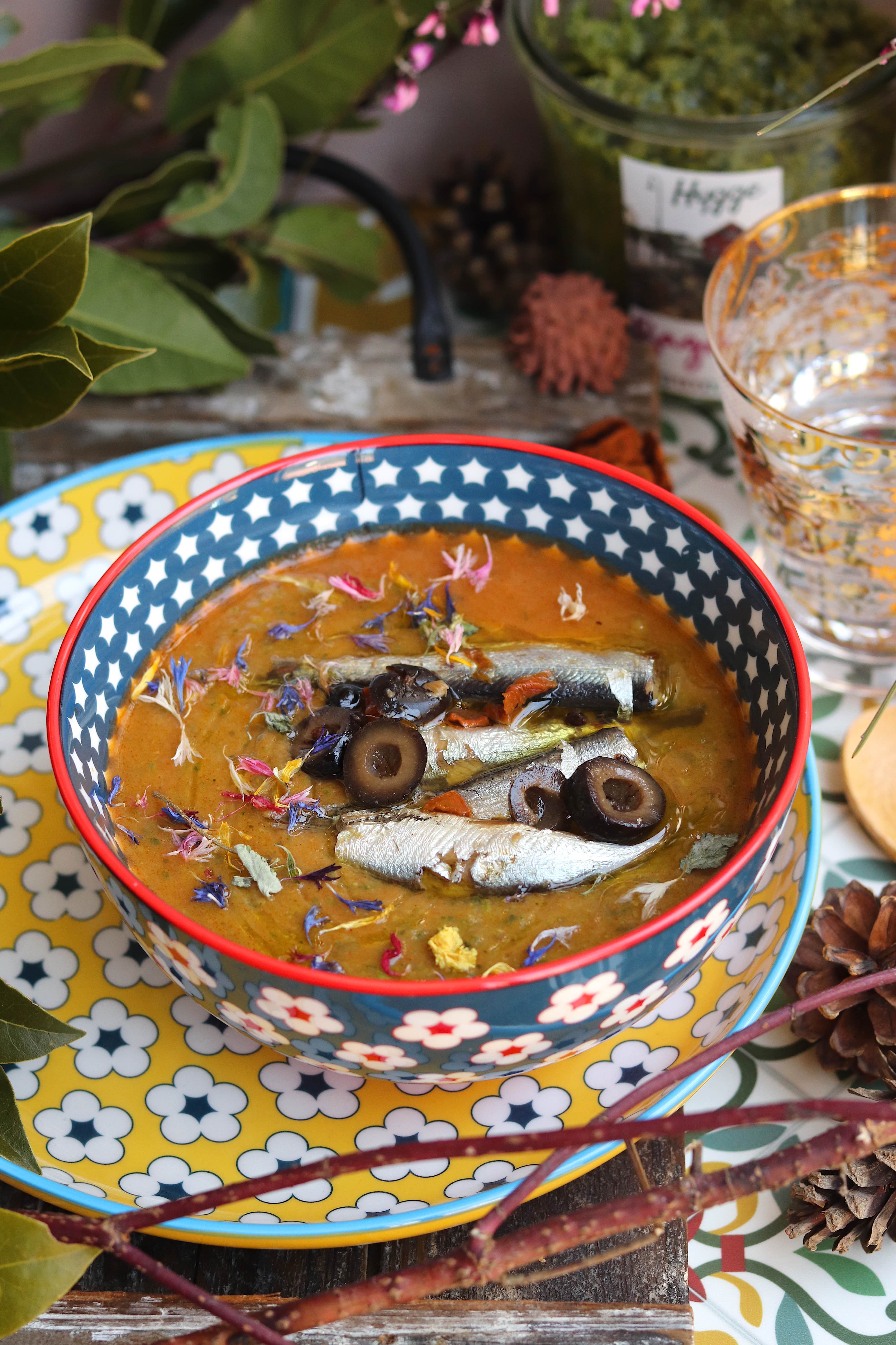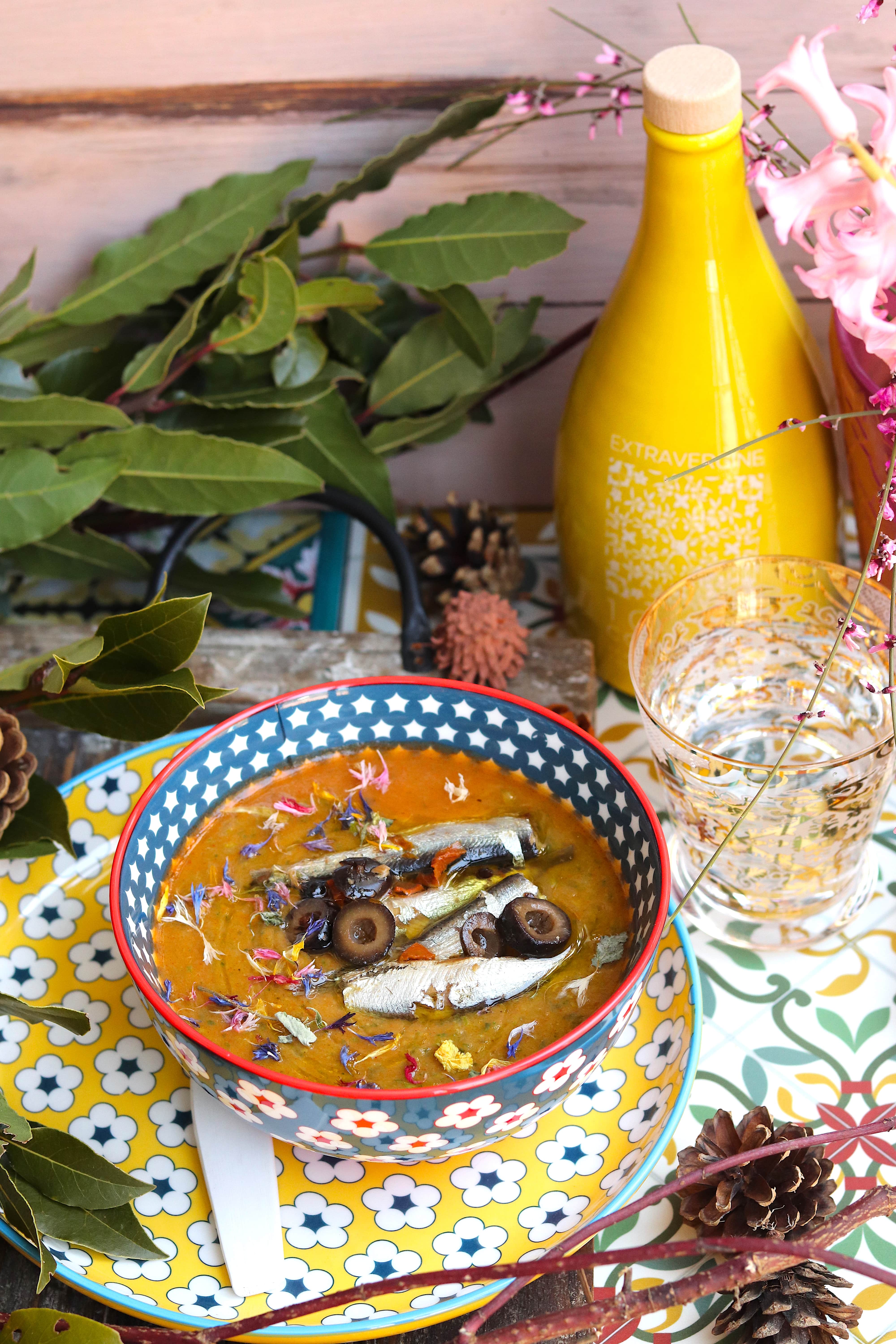 - Servite il passato caldo nei piatti e disponete sopra i filetti di spratti. Ultimate con le olive a rondelle, qualche pezzetto di pomodorino secco, fiori eduli e un giro d’olio.