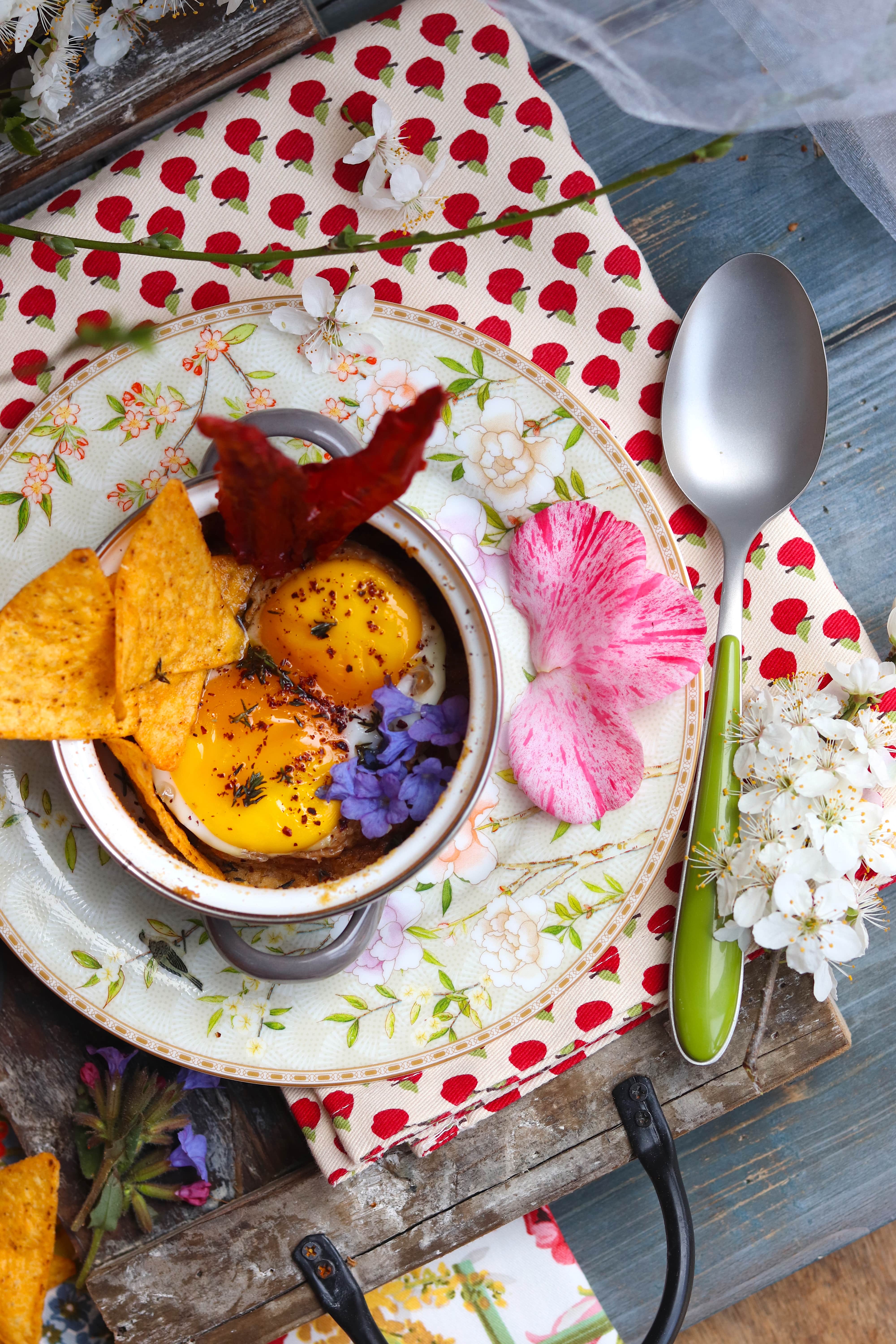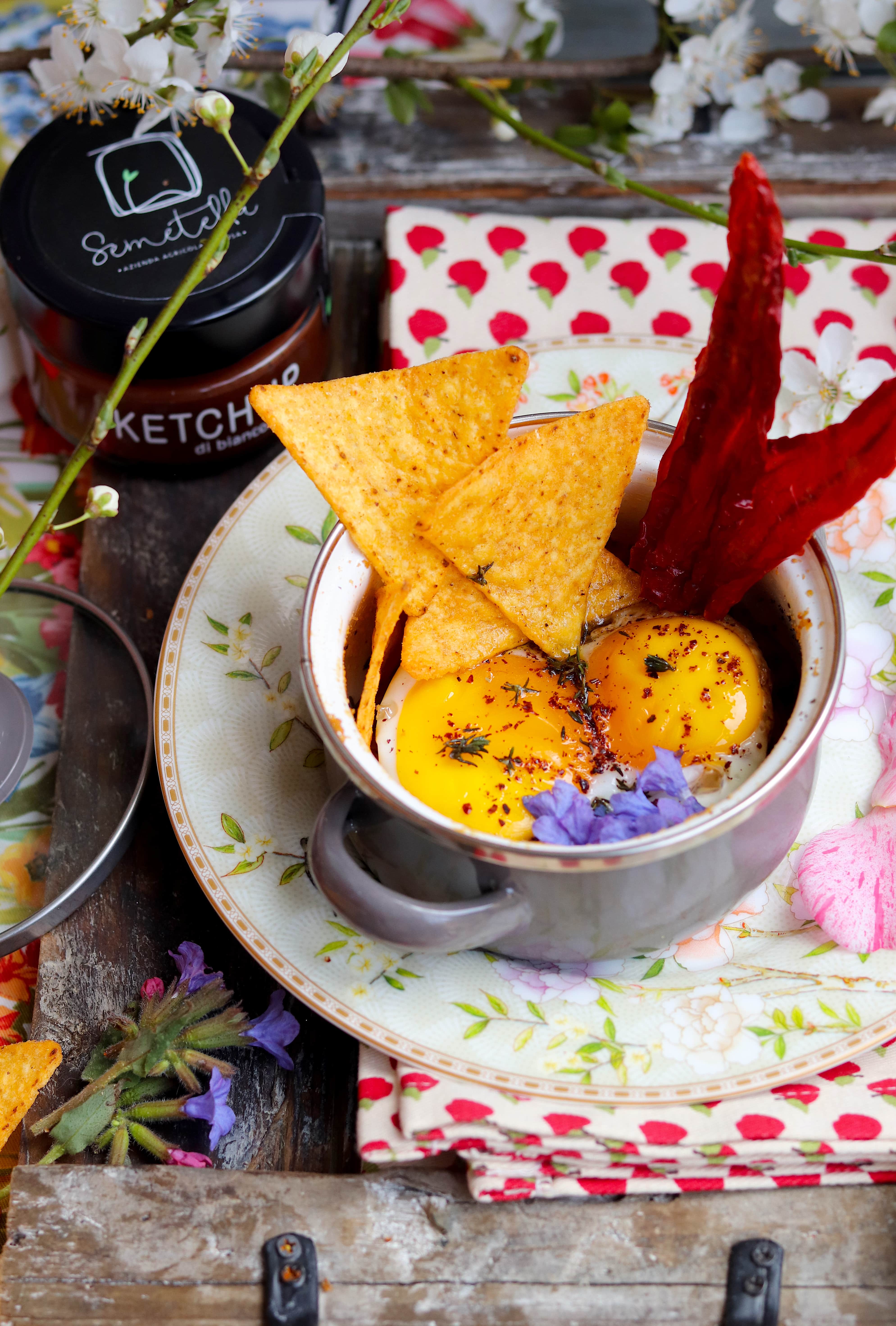 Due semplici uova, del Ketchup di biancospino fatto con amore da mani sapienti che conoscono i segreti della natura a menadito, qualche violetta sparsa, dei peperoni Cruschi rosso fuoco e tortilla color oro: dove i dettagli sono i colori e i gusti insieme, le terre lontane e vicine, le richieste e le attese.