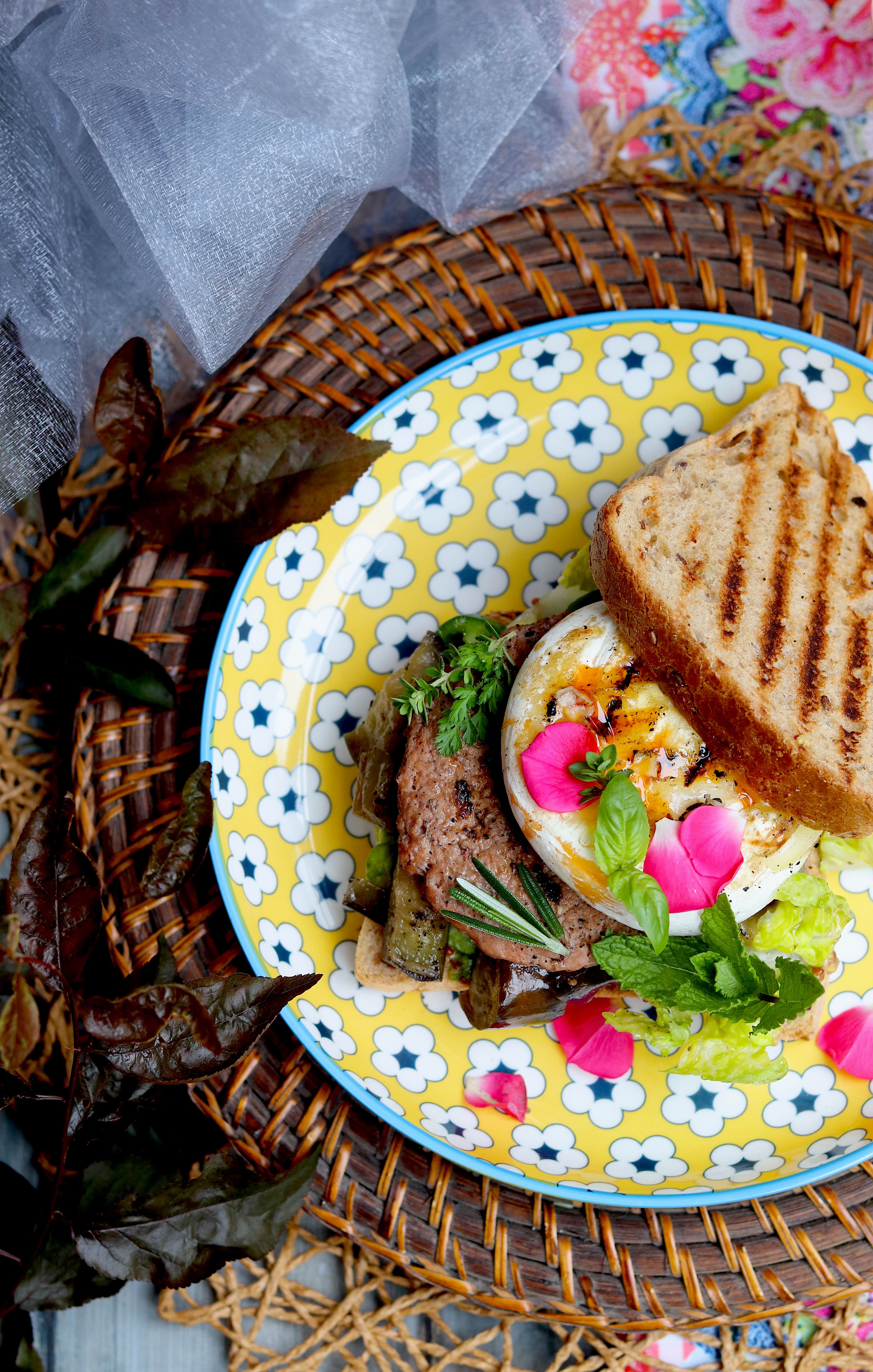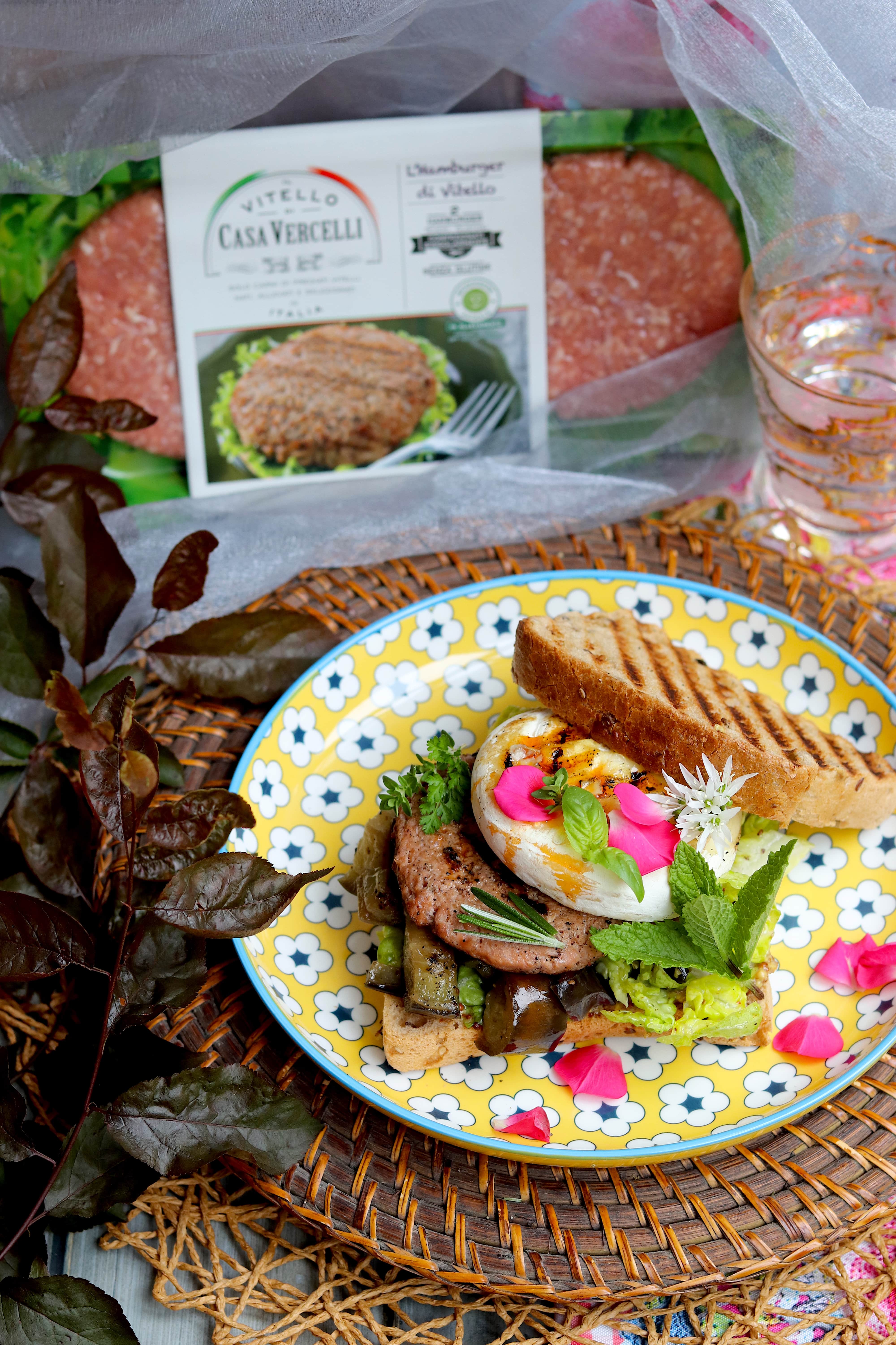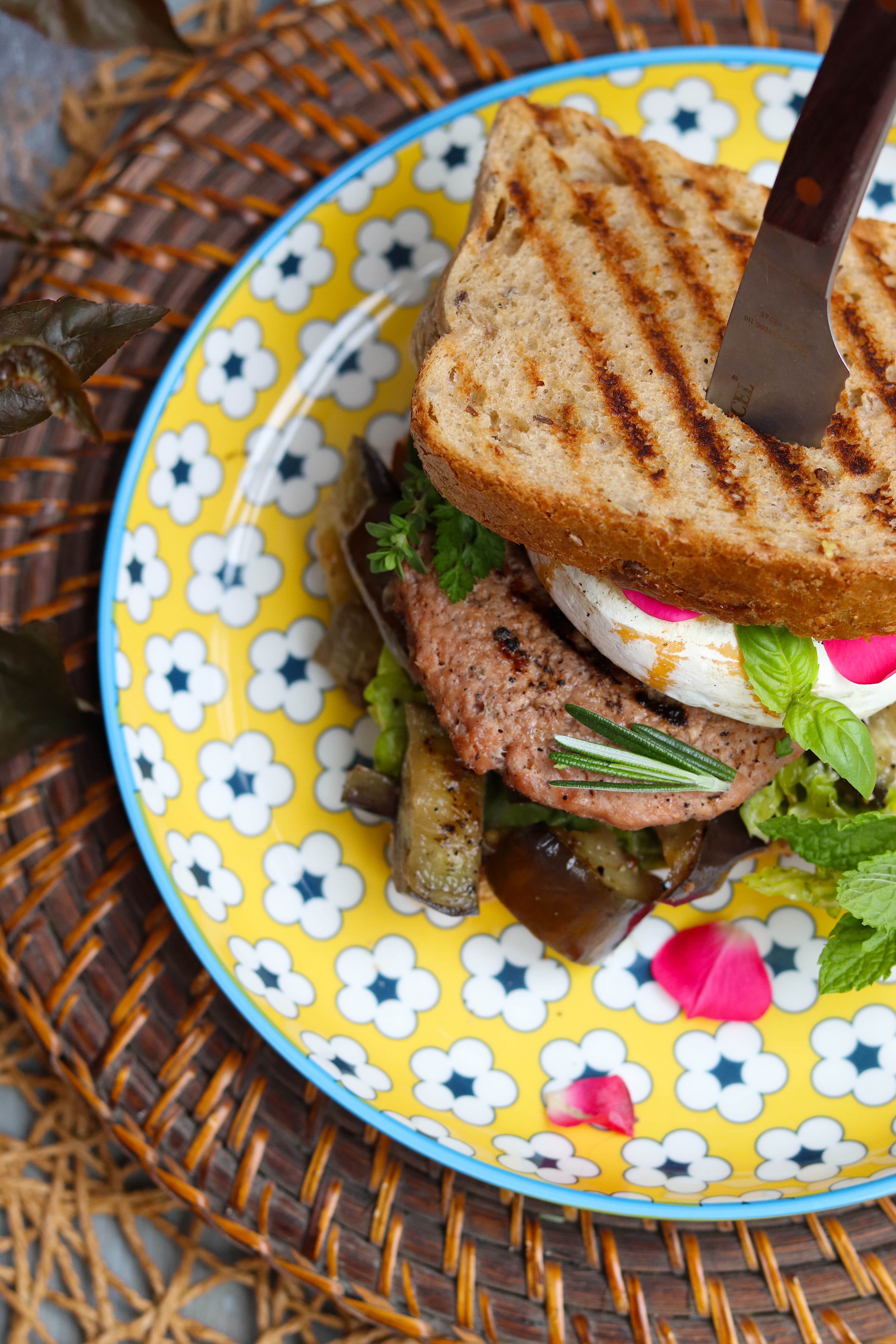 Ecco che quando preparo panini, sandwich e hamburger penso a macchine spaziali concentrate in due fette di pane, e in questo caso il pane tostato nasconde un Hamburger di vitello con paglierina fusa e melanzane allo sciroppo d’acero, un hamburger golosissimo pronto per il decollo.