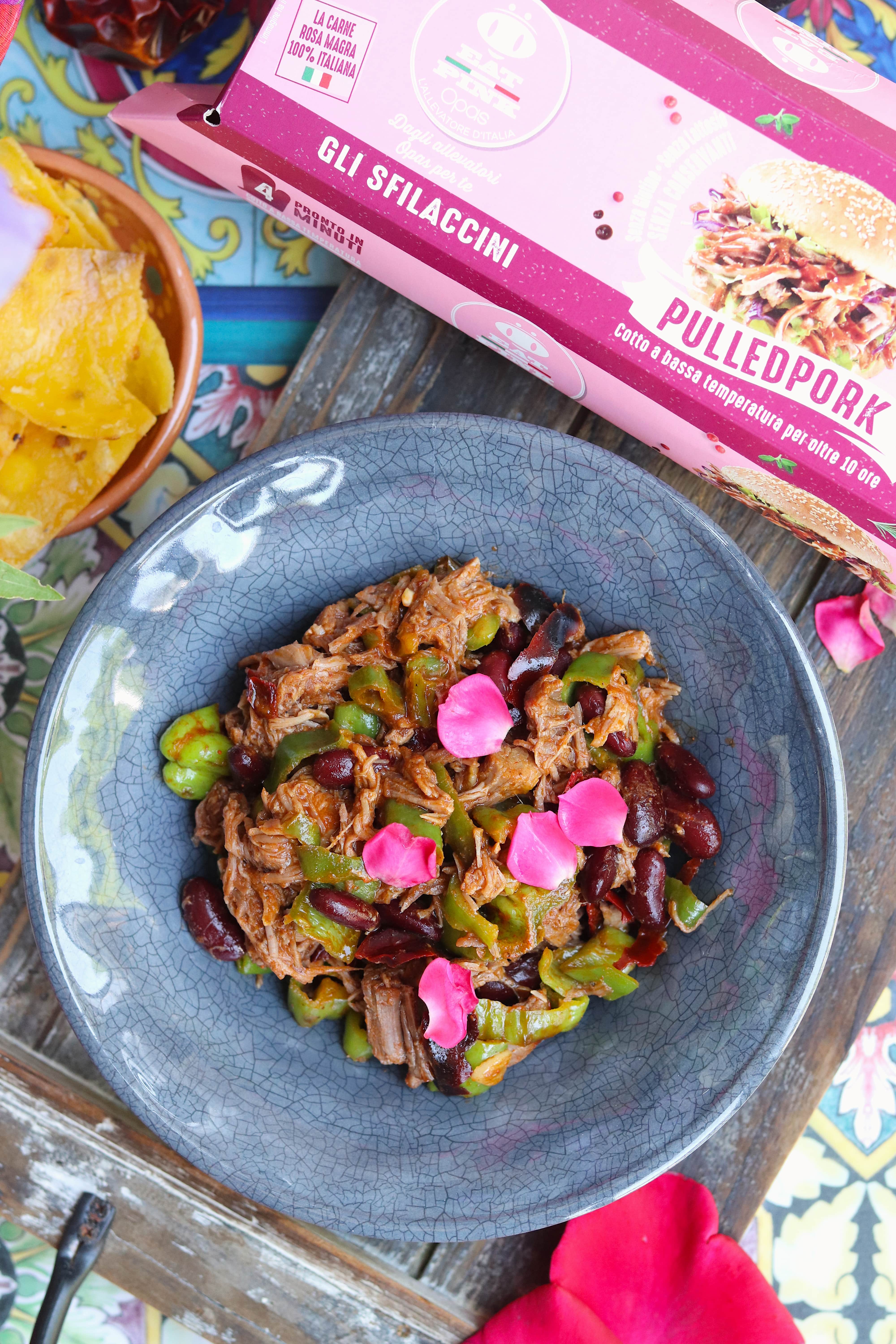 Pulled pork; fagioli rossi; peperoncino Ñora, originario di Alicante (Spagna), è un piccolo peperone rotondo, dal colore rosso, dalla dolcezza spiccata. Si utilizza nelle insalate, zuppe, sughi e stufati. Il profumo che lascia in cucina quando soffritto insieme all’aglio è semplicemente fenomenale!!