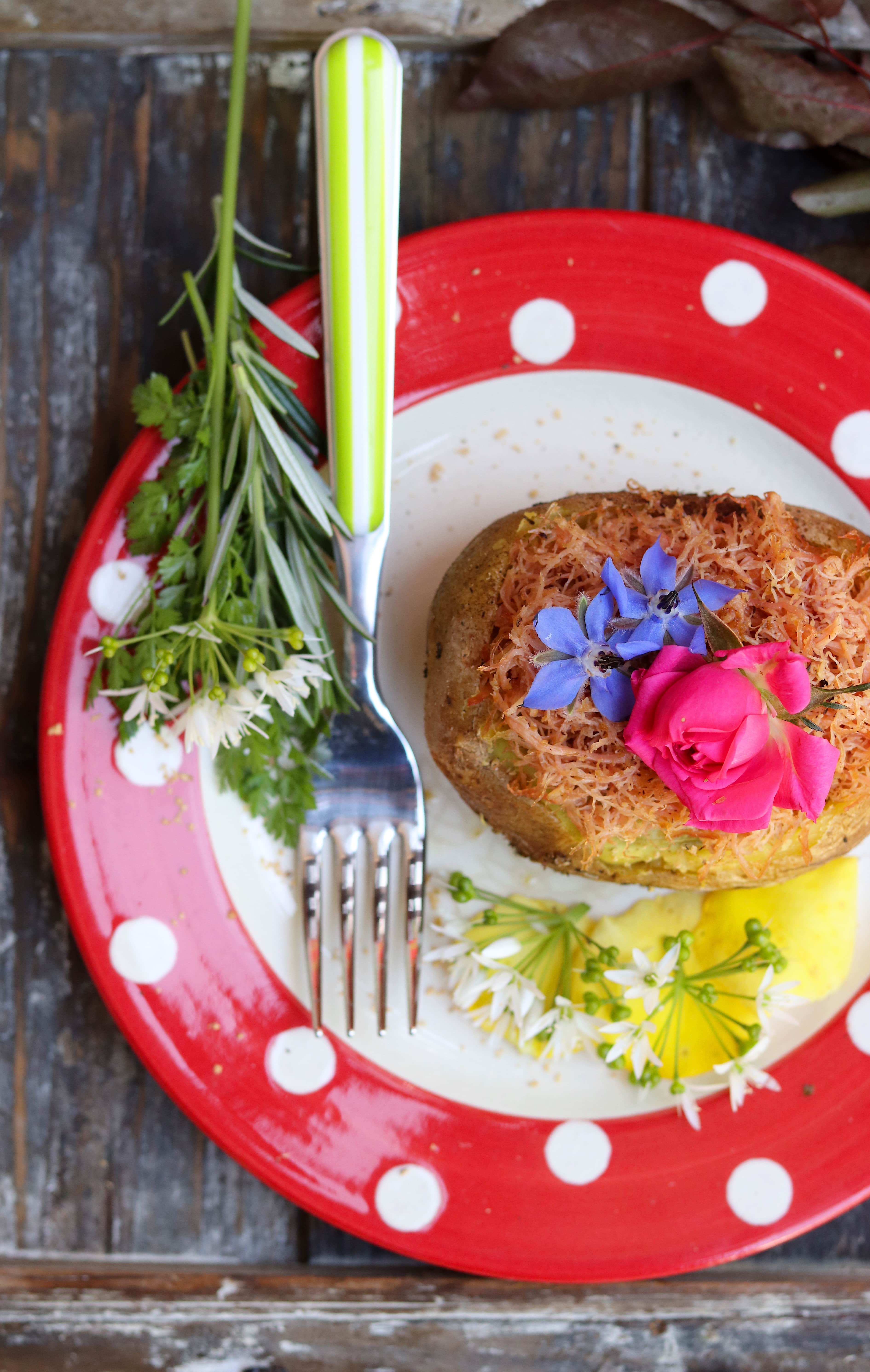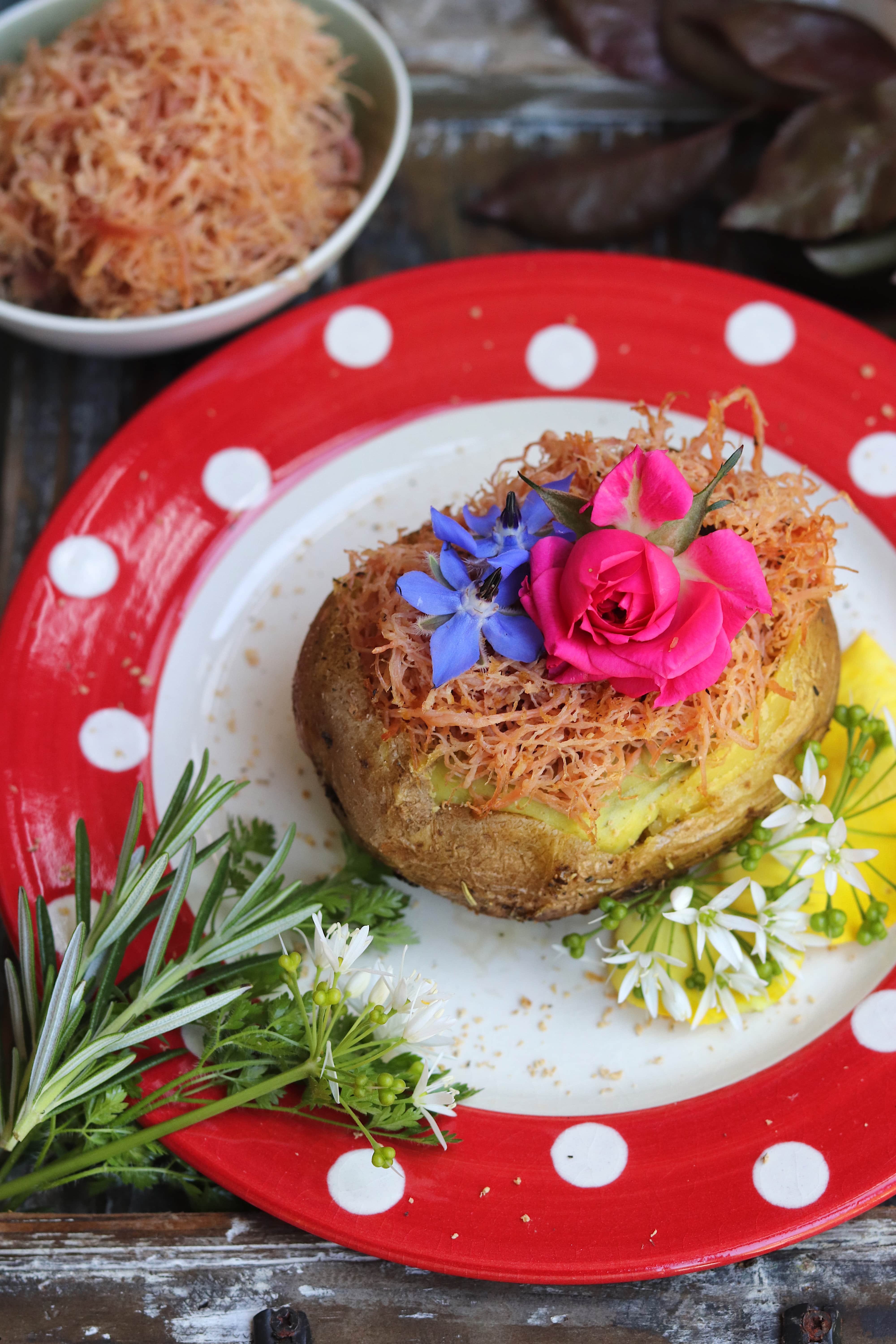 - Riempite le patate con la farcia. Adagiate su ogni patata gli sfilacci di vitello, e ultimate con un goccio d’olio a crudo e i fiori.