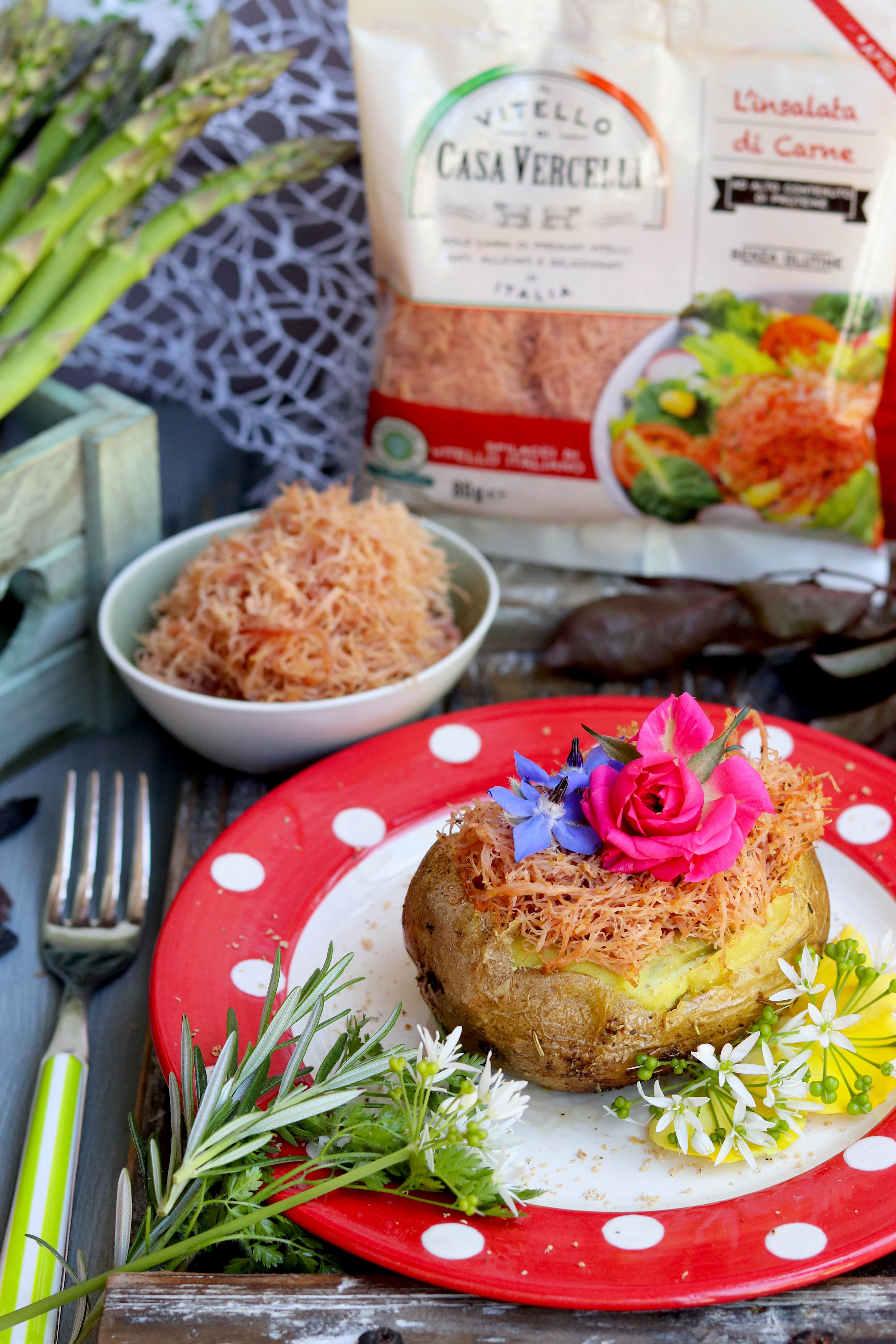 JACKET POTATO CON SFILACCI DI VITELLO, ASPARAGI E FIORI