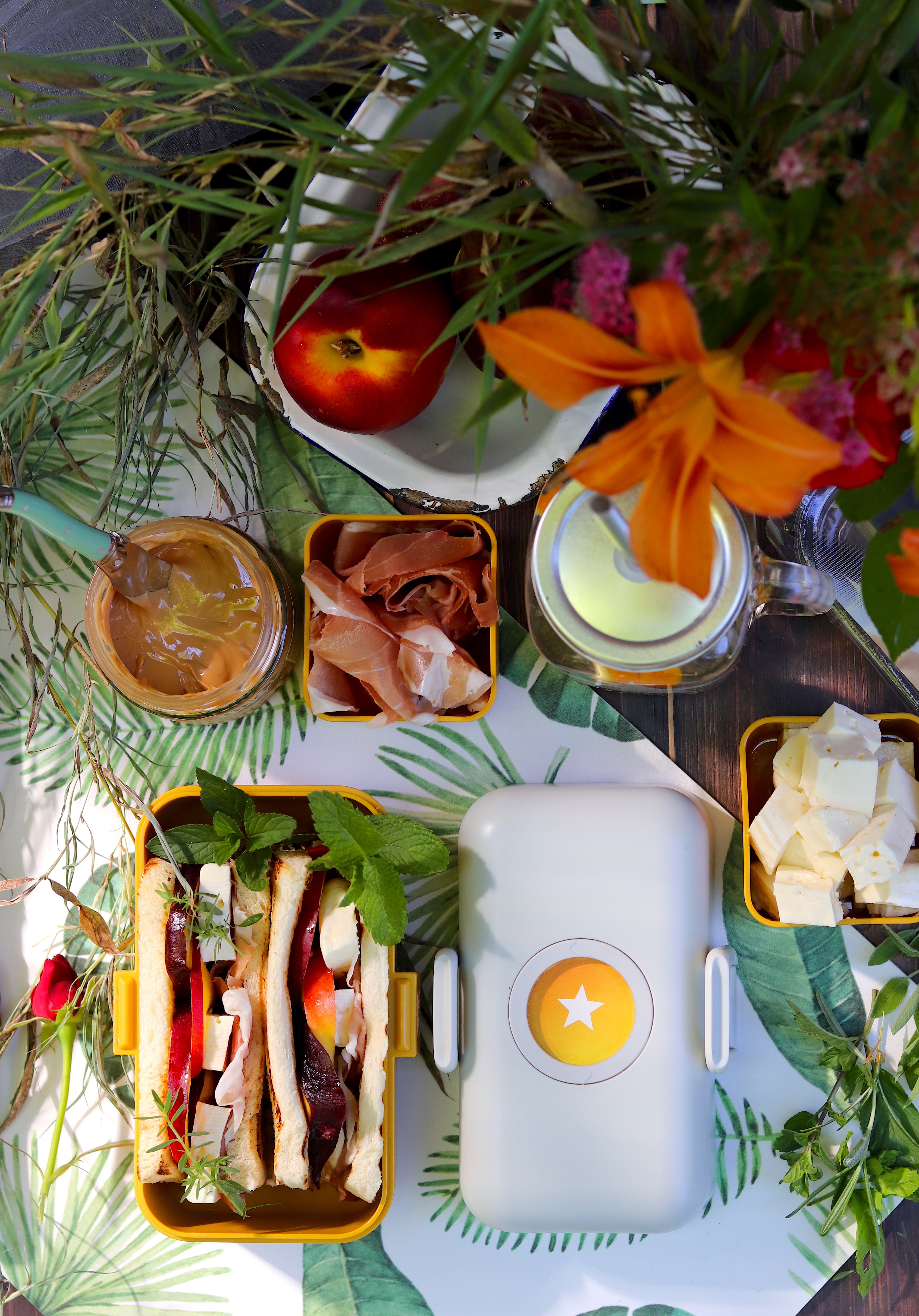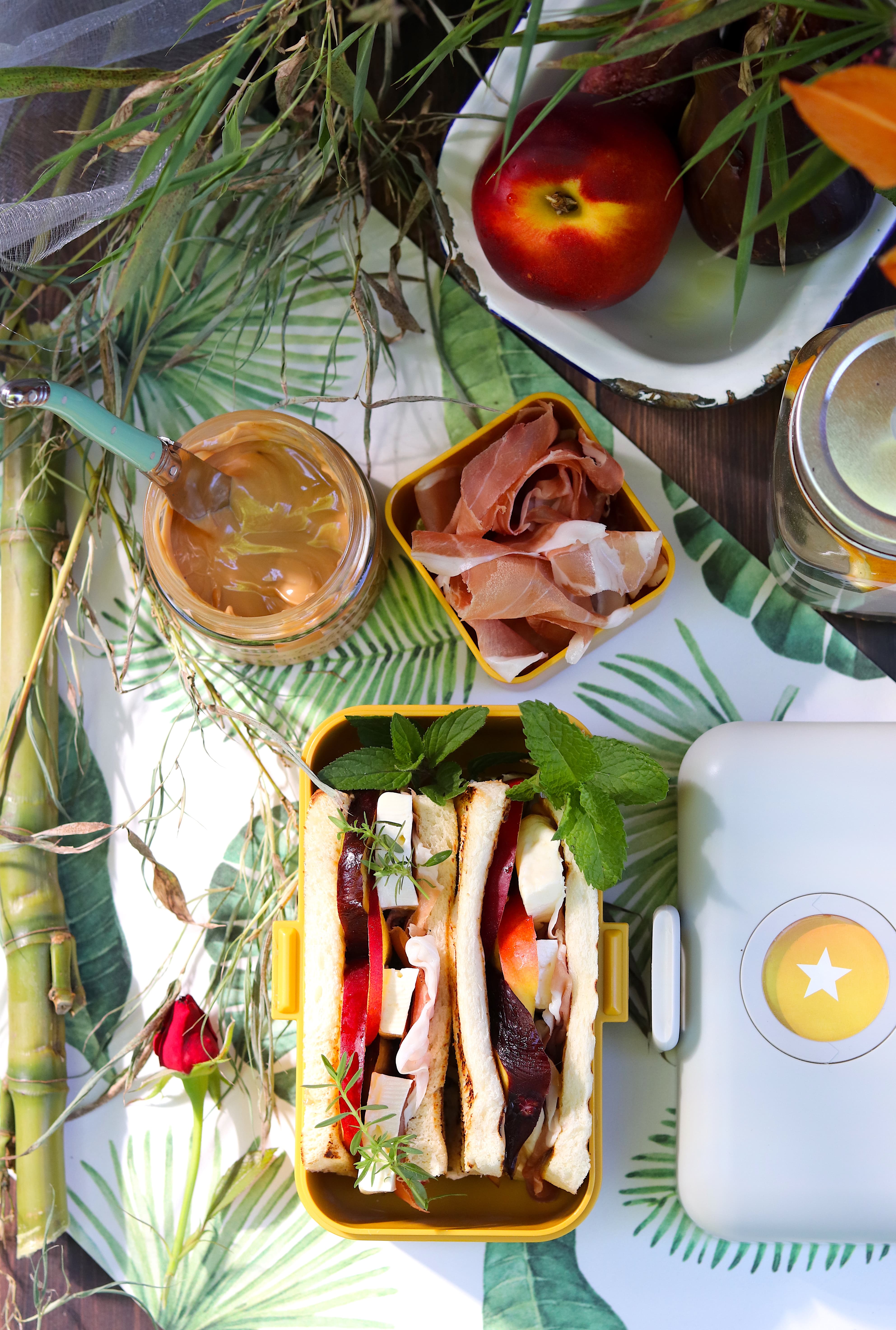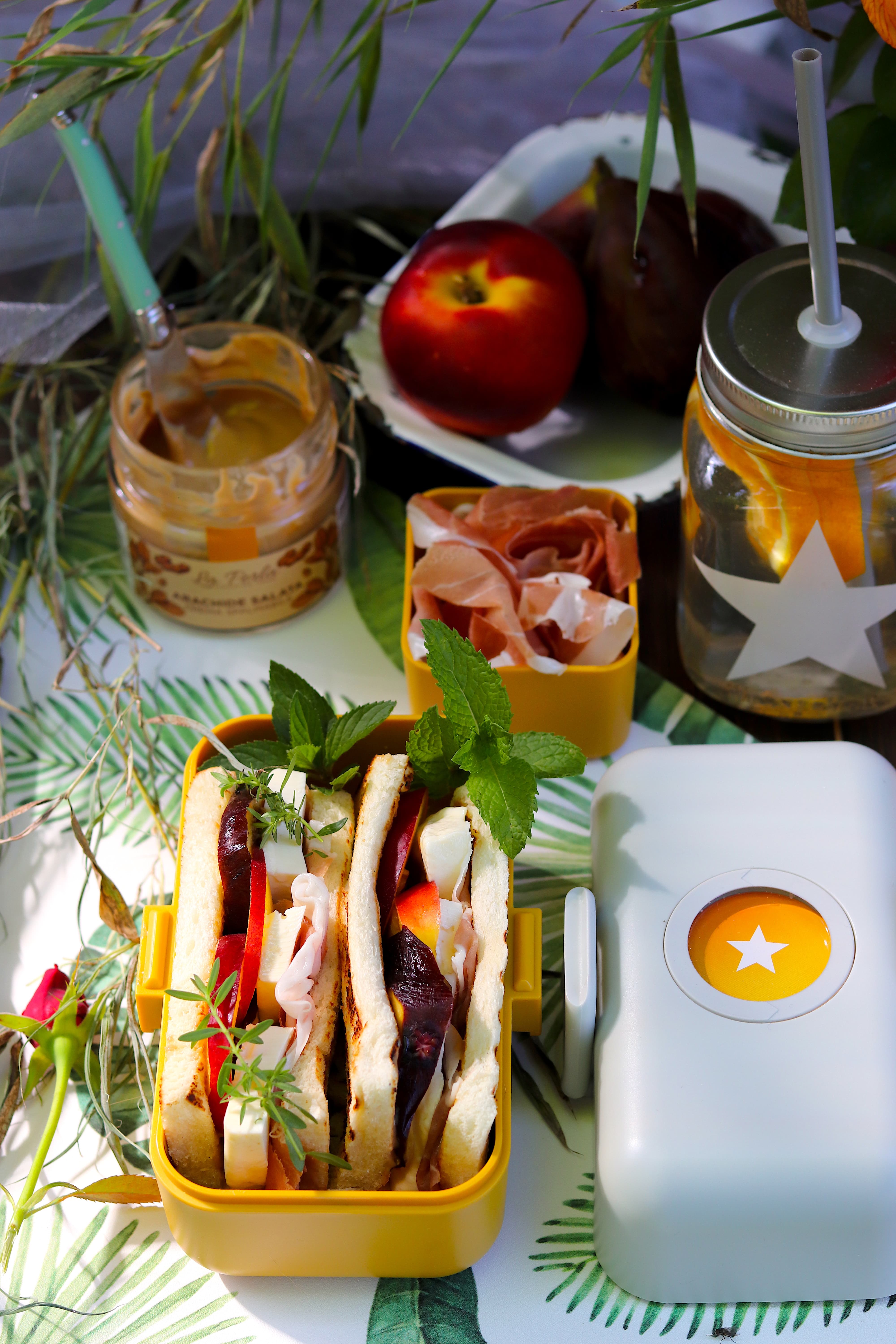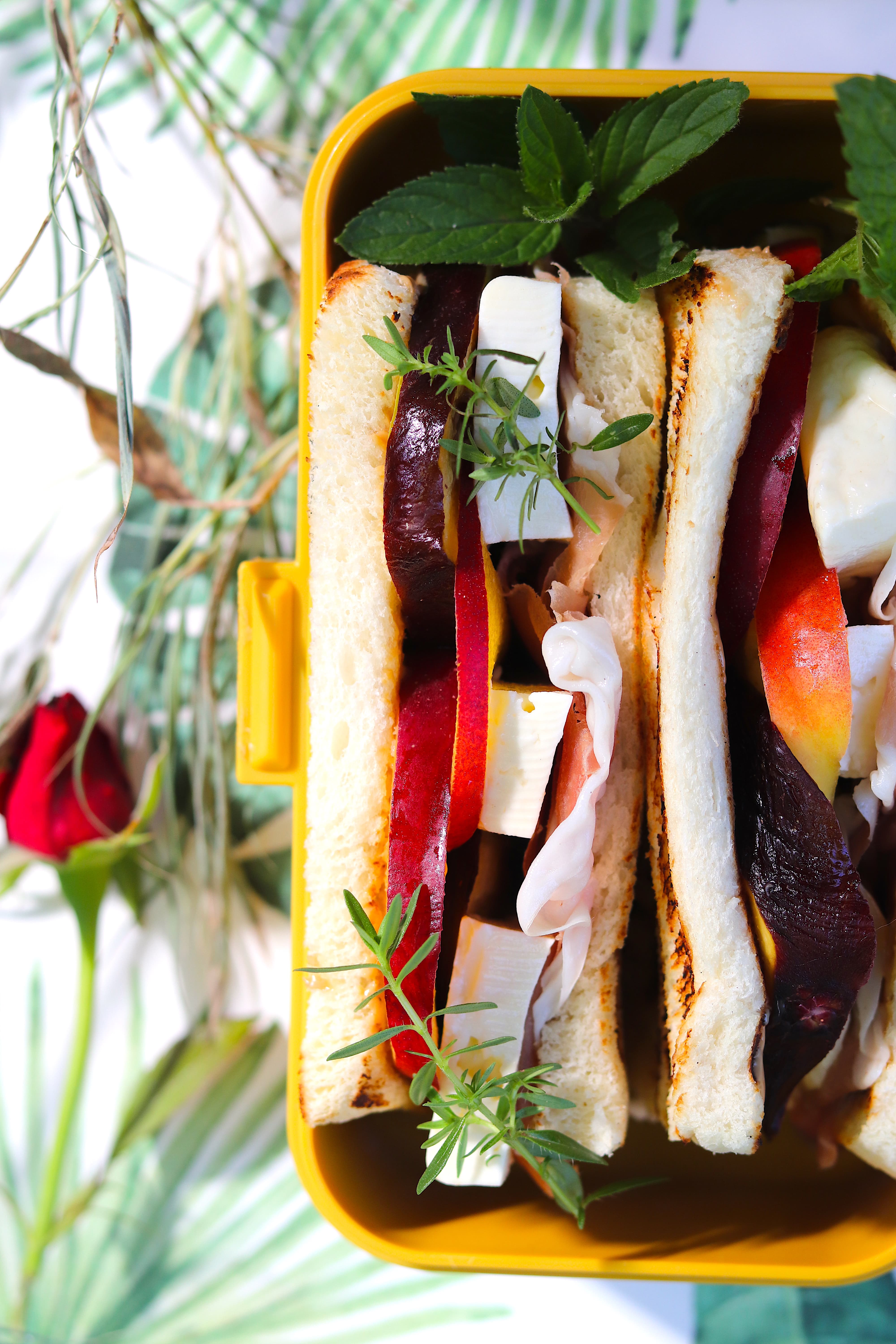 - Coprite con le altre due metà di fetta di pane. Comprimete leggermente i panini e serviteli all’interno della lunch box. Decorate con aromi freschi.