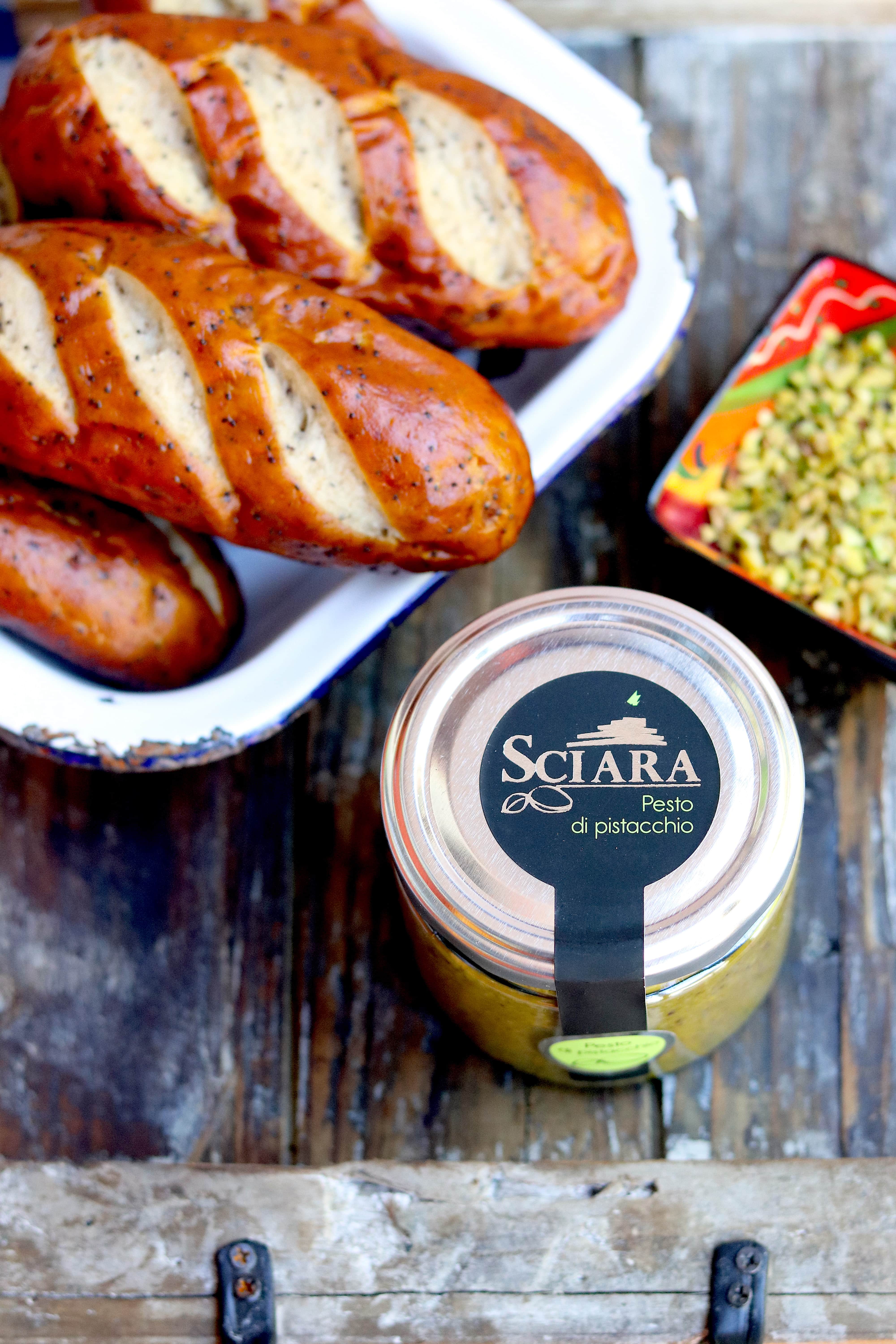 Prepariamo allora un Hot dog con il pane del bretzel e Polpa di granchio, pesto di pistacchio e pomodorini confit. Un sogno diventato emozione, un gesto che ha creato bellezza e poetica sensazione di trovarsi come per incanto di fronte al mare…